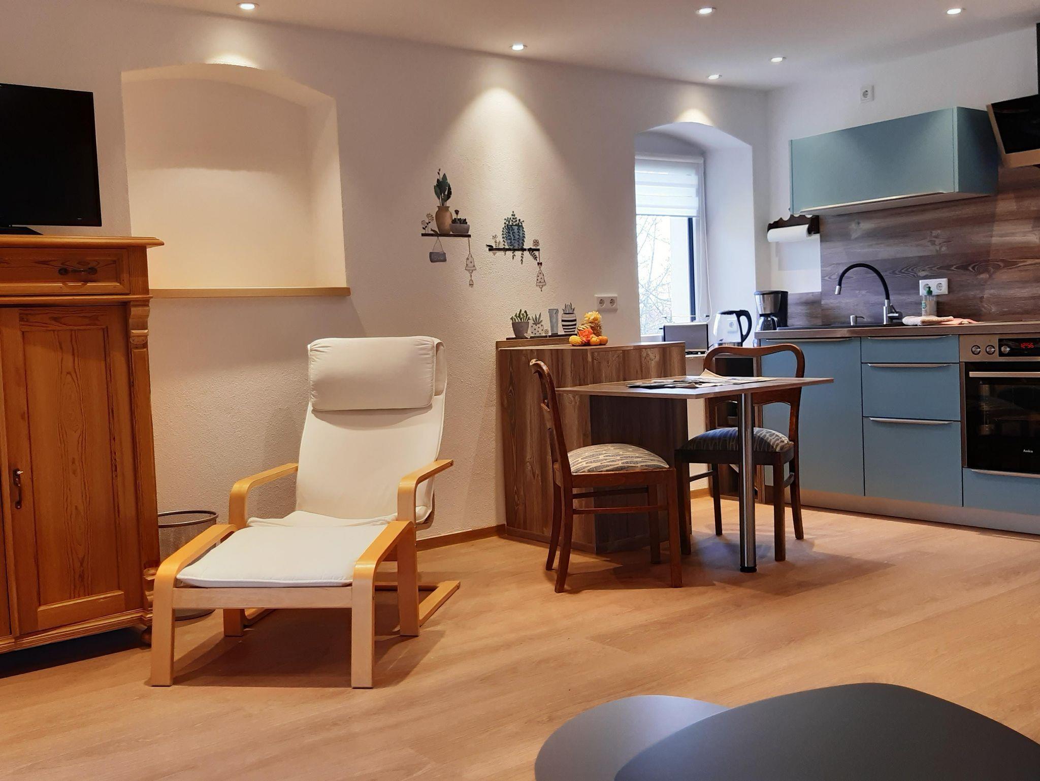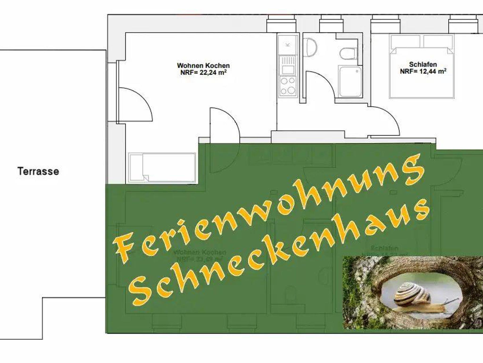 Die Ferienwohnung Schneckenhaus (38m²) bietet einen Blick ins Grüne, mit dierekten Zugang zur Terrasse. Die kleine gemütliche Ferienwohnung verfügt über ein Schlafzimmer mit Doppelbett, einen kombinierten Wohn-Ess-Bereich mit Einbauküche (Ceran-Herd, Backofen, Kühlschrank mit Gefrierfach) Sat-TV und WIFI sowie ein Bad mit Dusche. Sie ist barrierefrei. Die Ferienwohnung Schneckenhaus und Kuhstall sind zwei eigenständige Wohnungen, die jedoch mit einer verschließbaren Doppeltür verbunden, bei Bedarf auch gemeinsam gebucht werden können.