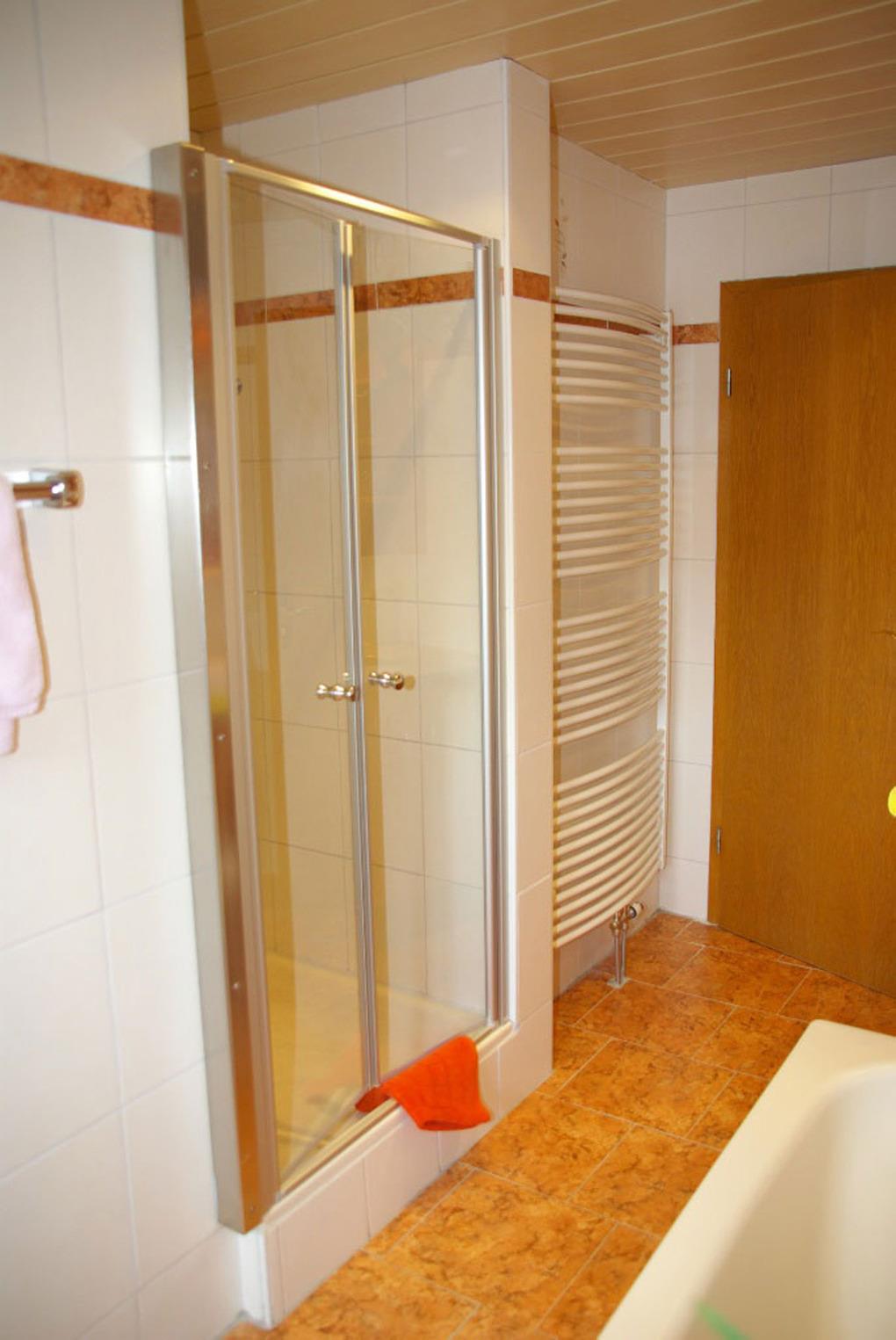 - ein Bad mit Badewanne, Dusche und WC