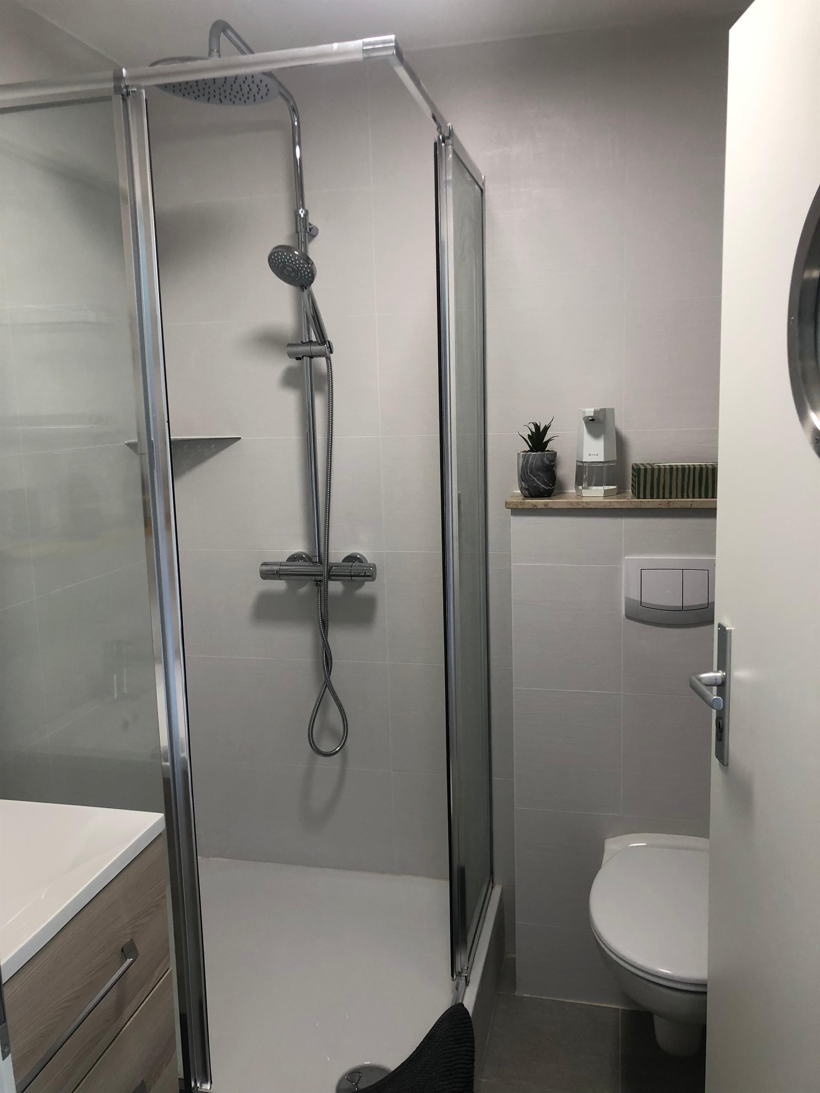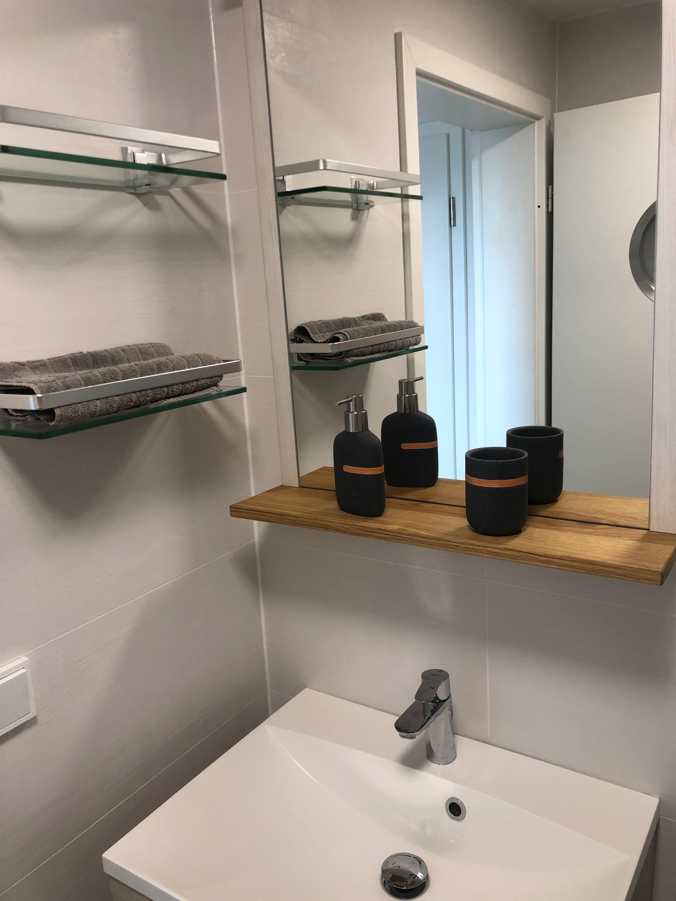 Im Bad, ausgestattet mit WC, Waschbecken und Dusche, stehen unseren Gästen auch ein Haartrockner, Handwaschseife und Kosmetiktücher zur Verfügung.
