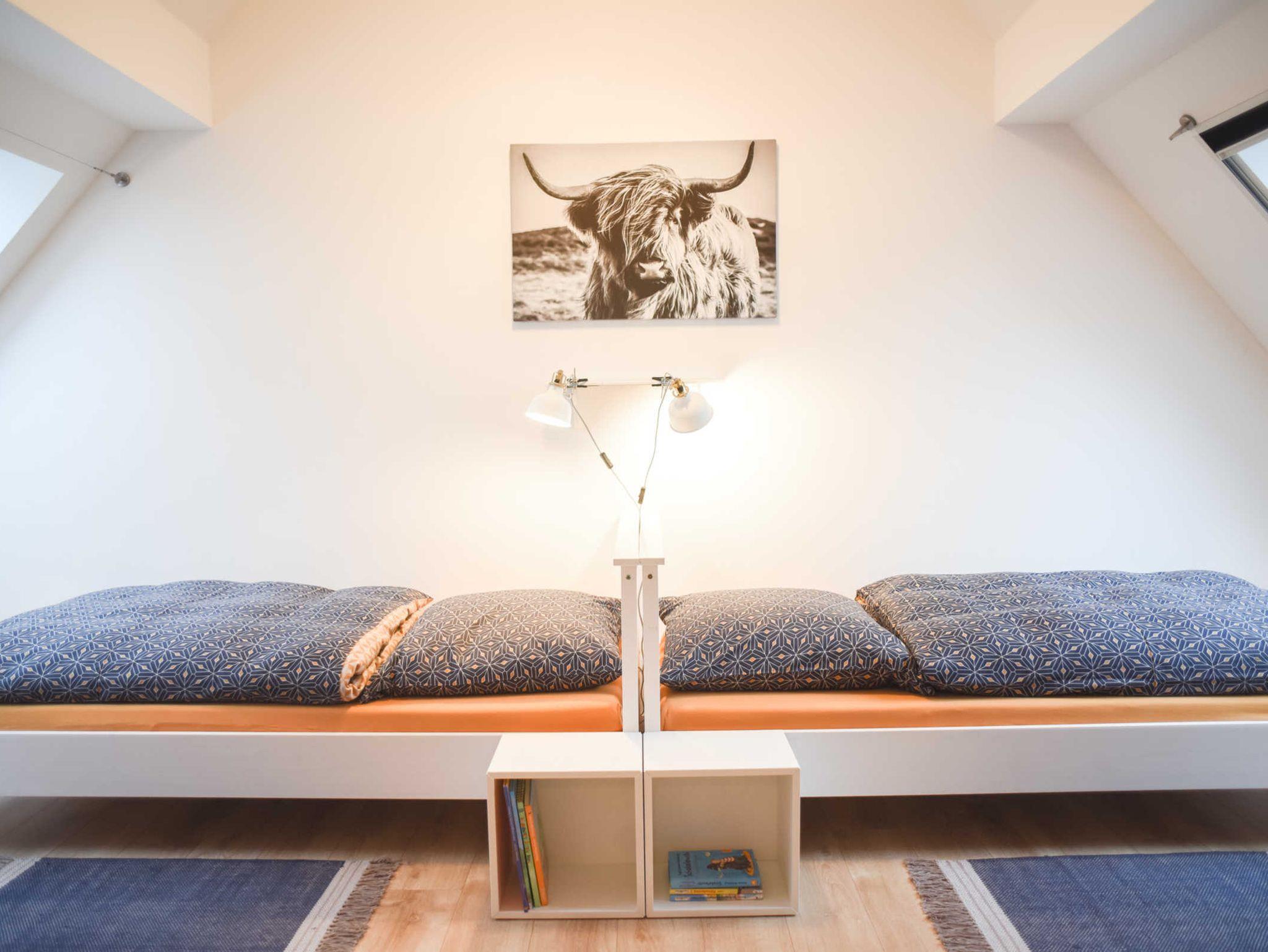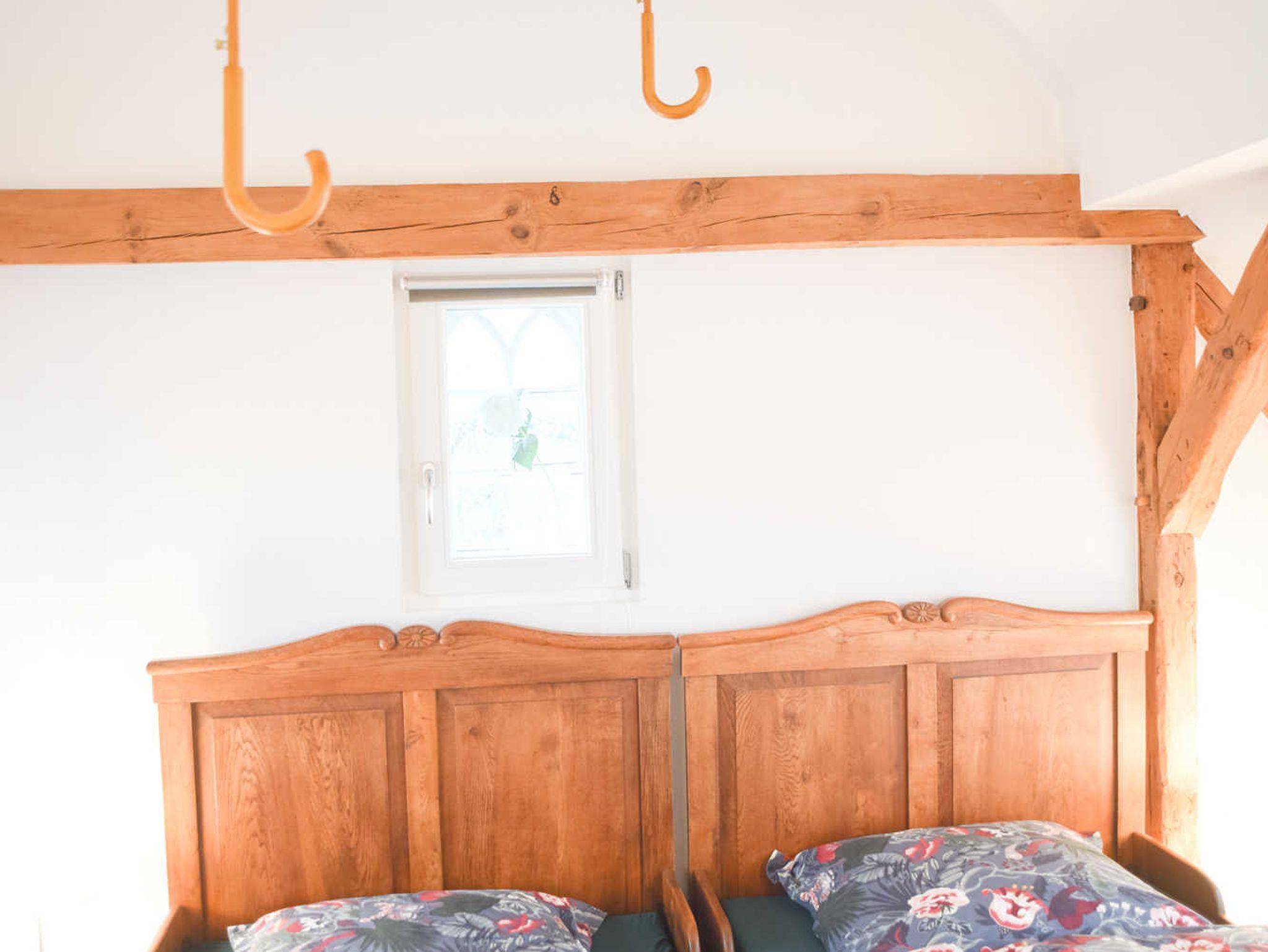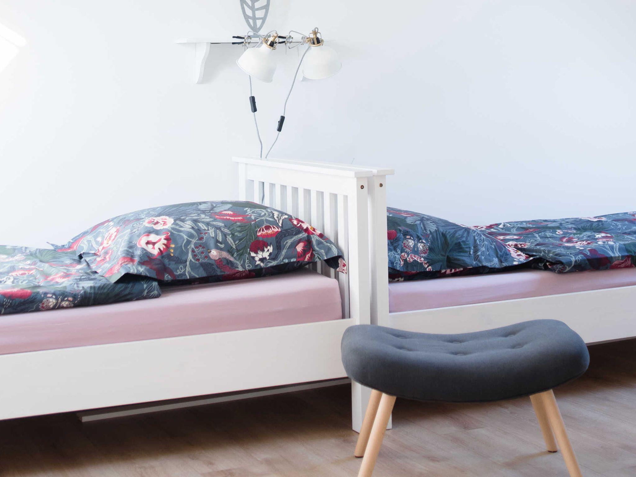 • Zimmer 2: zwei Einzelbetten, 0,9 x 2,00 m inkl. Bettwäsche (die Betten können bei Bedarf zu einem Doppelbett zusammengeschoben werden)