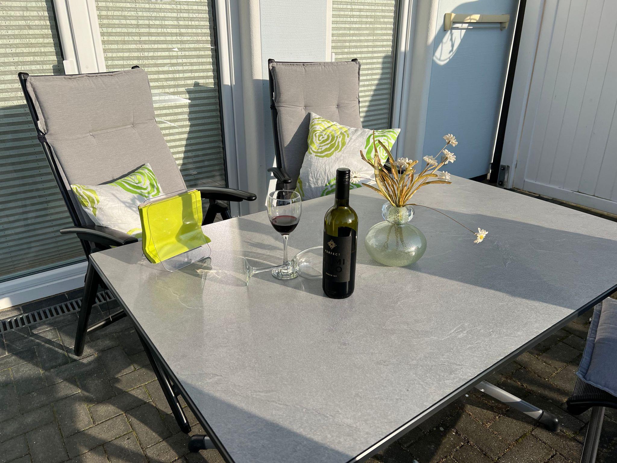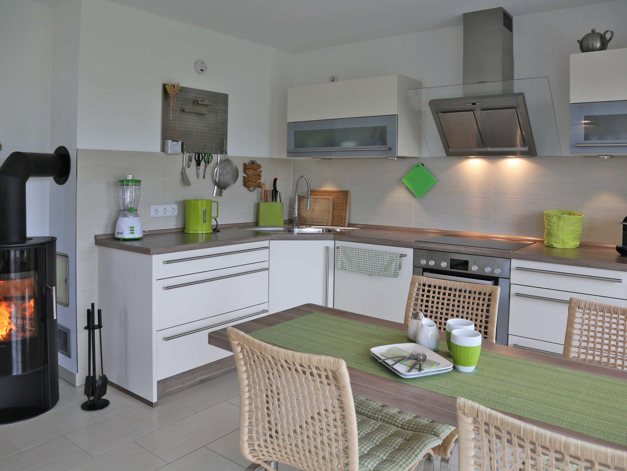 Freundlich und hell präsentiert sich der offene Wohn- und Essbereich mit Ecksofa, TV inkl. Radio, DVD-Player und als Highlight einem Kaminofen mit Glasfenster für romantische Abende. Von hier aus geht es zur Terrasse, die zur Westseite ausgerichtet ist. Genießen Sie den Sonnenuntergang mit Blick auf den Kurpark, z.B. bei einer Flasche Wein. Im Frühjahr und Herbst können Sie von hier aus die Zugvögel beobachten. Moderne Gartenstühle und ein Gartentisch komplettieren unsere Ausstattung. Die Küche ist mit hochwertigen Küchengeräten, Induktionsherd, Backofen, Spülmaschine, Mikrowelle, Wasserkocher, Toaster, einer „normalen“ Kaffeemaschine, Kühlschrank
