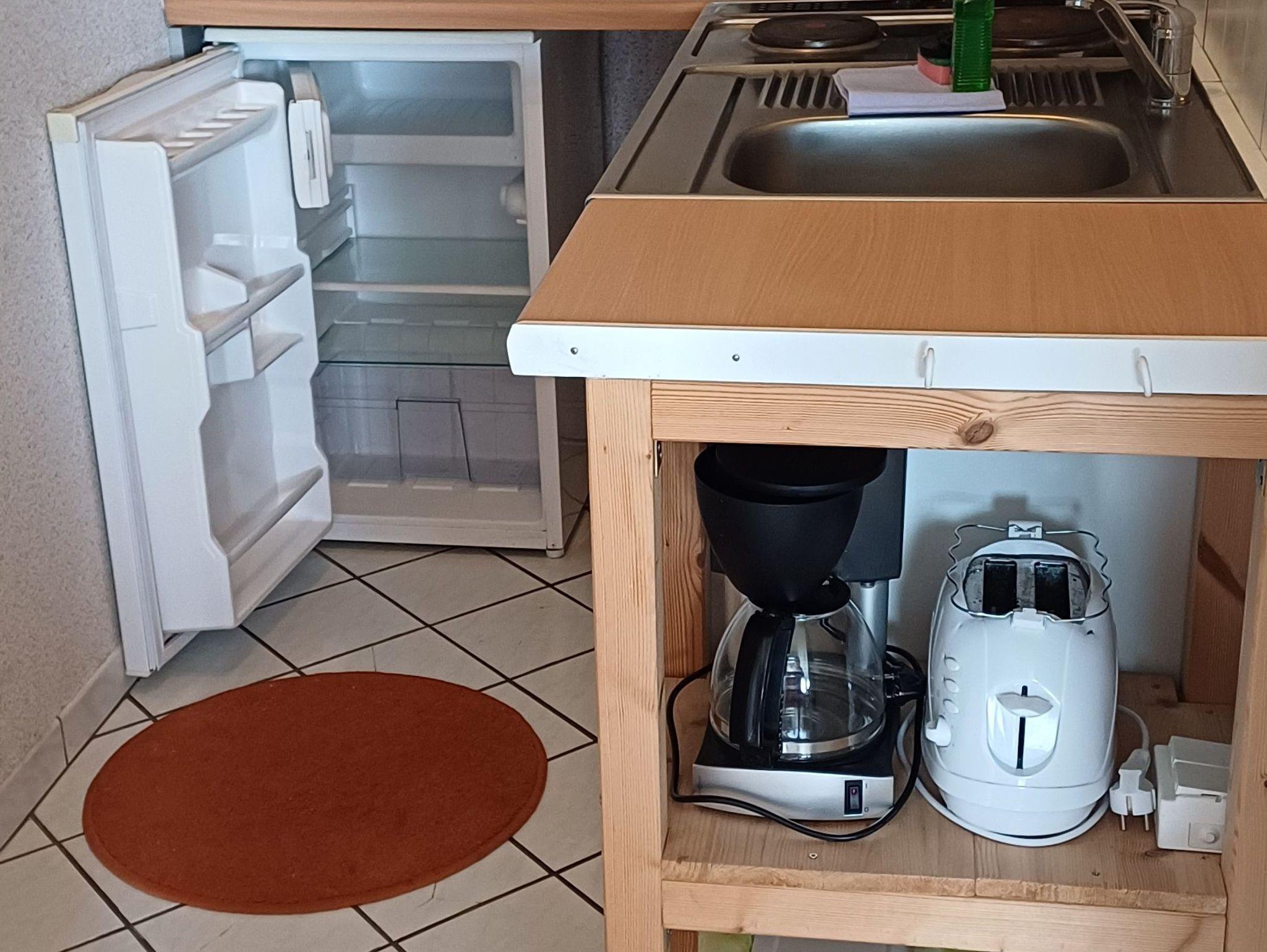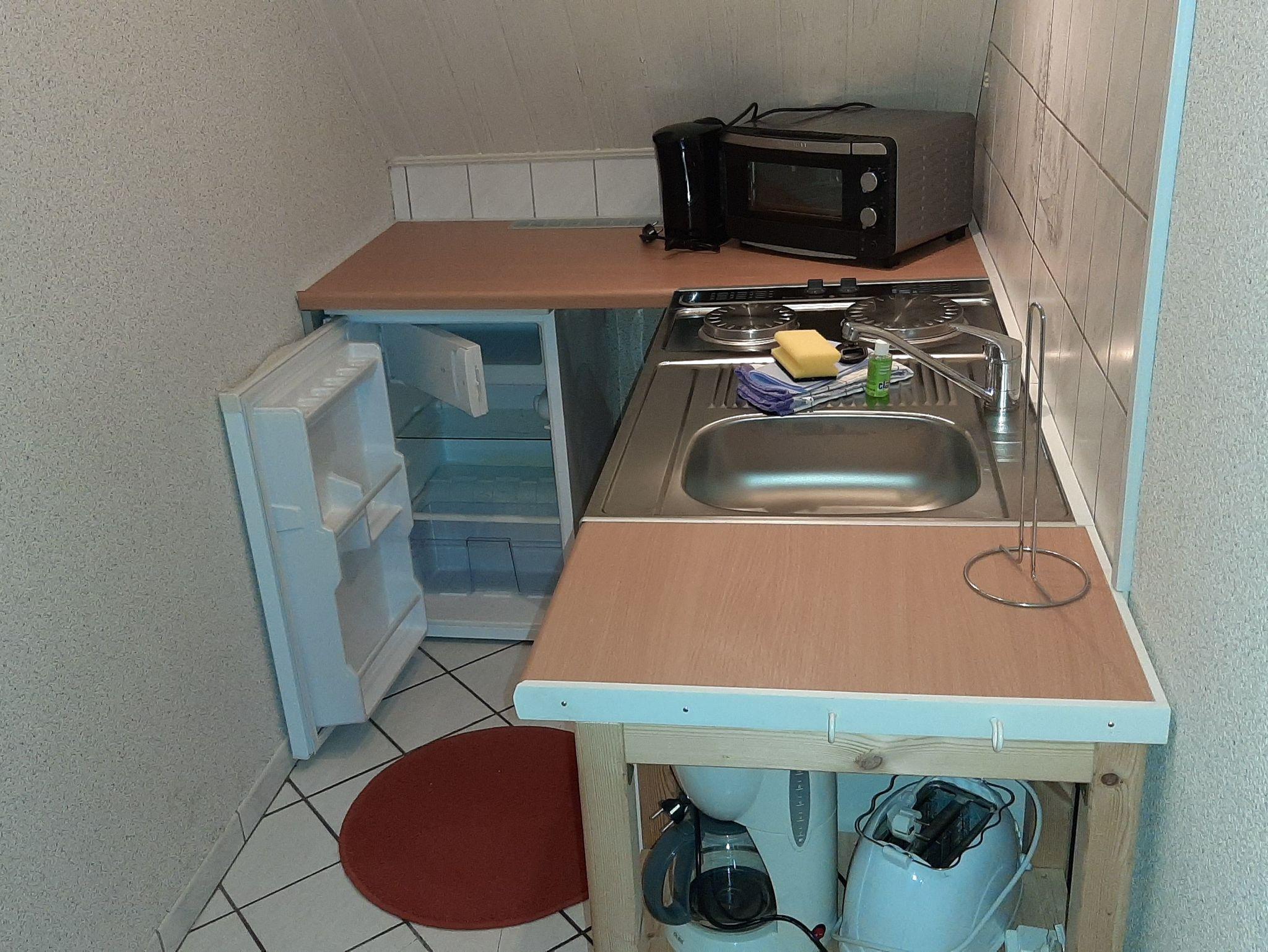 - kleine Pantryküche mit 2-Platten-Kochfeld, Kühlschrank, Minibackofen