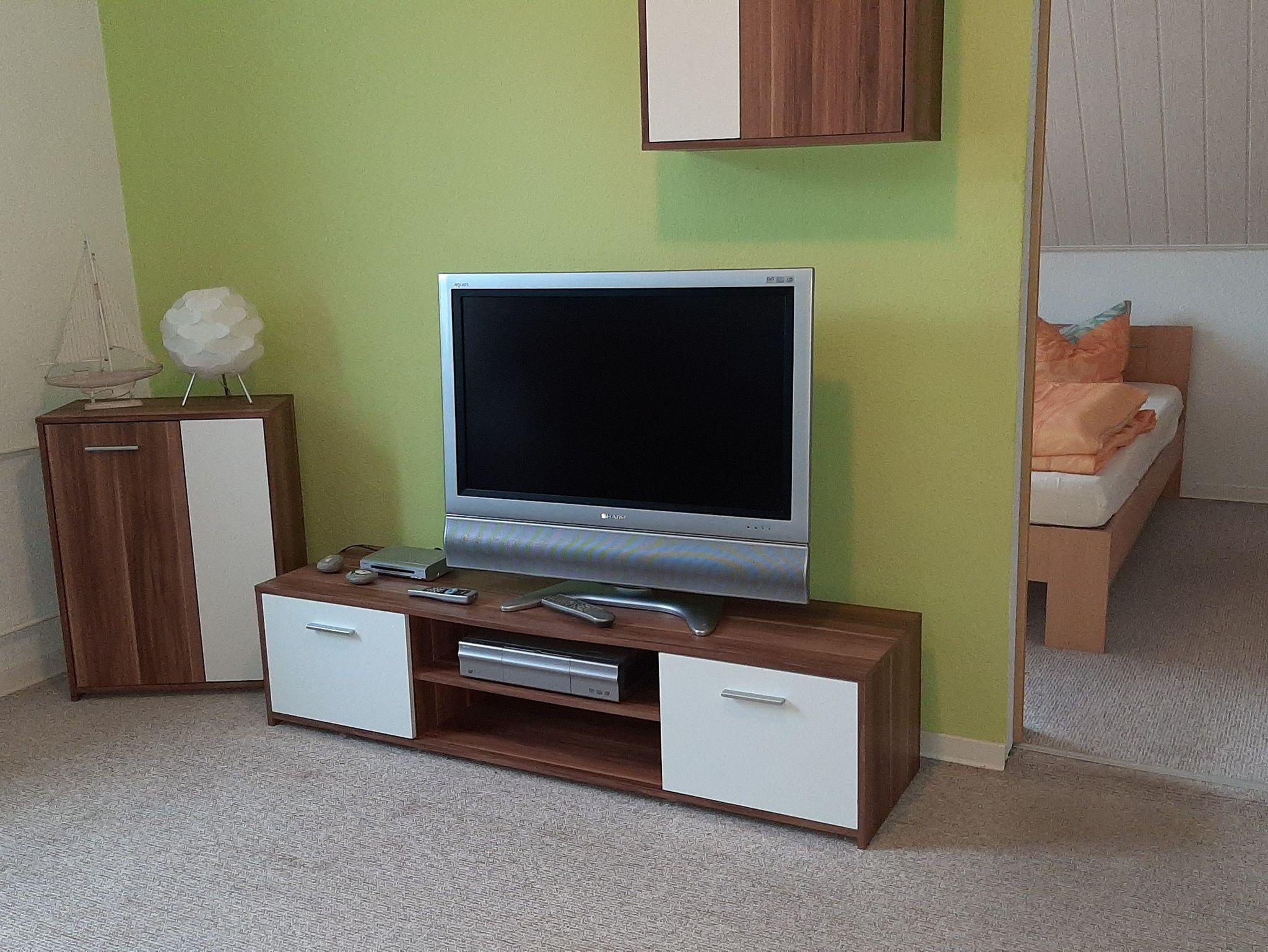 - Wohnraum mit Couch und Schlafliege 0,90x2m, Flachbild-TV, Eßtisch