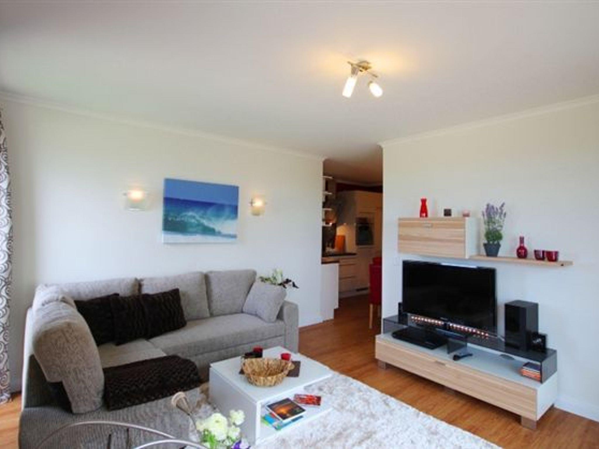 Der großzügige Wohn- und Essbereich verfügt über eine komfortable, ausziehbare Couchgarnitur mit Bettkasten, einem Esstisch mit Stühlen, einen Flatscreen-TV sowie eine moderne Musikanlage und integriertem DVD/CD-Player. Die harmonische Einrichtung lädt dazu ein, zur Ruhe zu kommen sei es mit einem guten Buch aus dem Bücherregal, bei einem Gesellschaftsspiel oder beim Hören Ihrer Lieblingsmusik. Kostenloses WLAN steht Ihnen selbstverständlich für Ihre Urlaubsplanung oder berufliche Zwecke zur Verfügung. Eine Fußbodenheizung sorgt bei Bedarf für wohlige Wärme in allen Räumen.