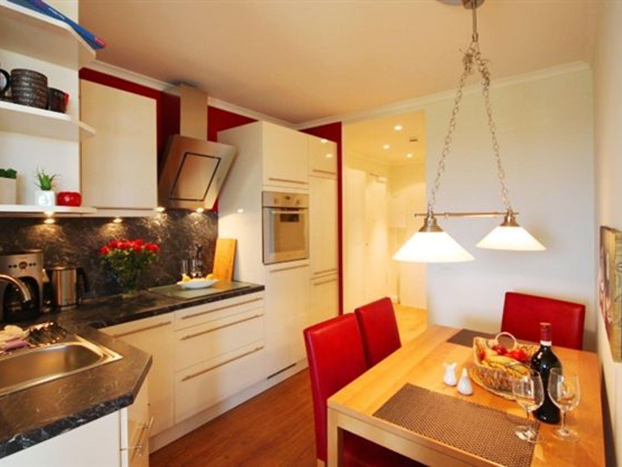 Die moderne Einbauküche ist voll ausgestattet und lässt keine Wünsche offen: Geschirrspüler, Kühlschrank mit Gefrierfach, Kaffeemaschine, Wasserkocher, Toaster, Mikrowelle sowie Geschirr und Gläser stehen Ihnen zur Verfügung.