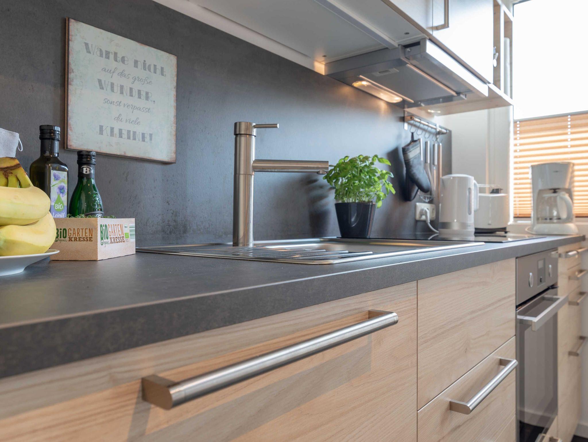 Der offene Wohn- und Essbereich ist ausgestattet mit einer modernen Einbauküche sowie diversen Küchengeräten wie Toaster, Eierkocher, Kaffeemaschine, Wasserkocher, Mikrowelle, Cerankochfeld und Backofen. So lässt es sich frisch gestärkt in ein neues Abenteuer starten. Der große Kühlschrank sorgt vor allem an heißen Tagen für ausreichend kalte Getränke. Im Küchenbereich runden ein großer Tisch zum Ausziehen und vier Stühle das moderne Design ab.