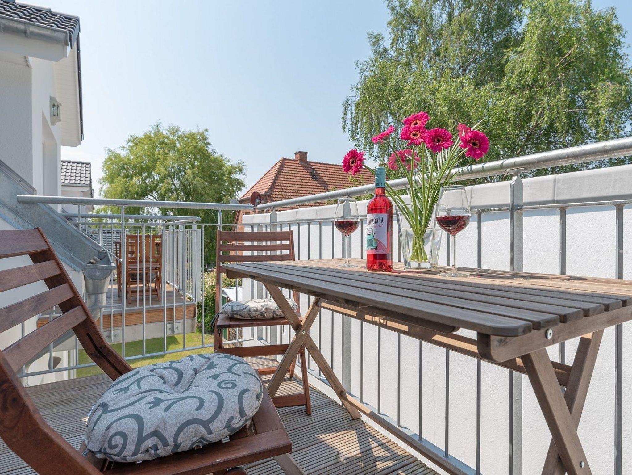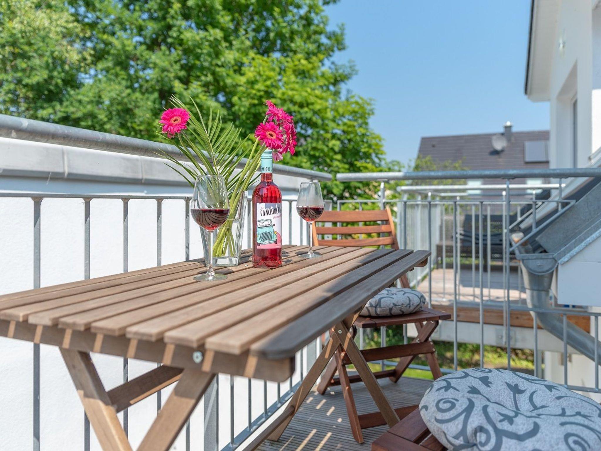 Vom Wohnbereich aus gelangen Sie zu dem Balkon, dessen zwei große Flügeltüren großzügig geöffnet werden können, um den Raum mit frischer Küstenluft zu füllen. Der Balkon ist mit Tisch und Stühlen samt Sitzauflagen ausgestattet. Außerdem gbefindet sich dort ein aufklappbarer Wäschetrockner zum Trocknen der Schwimmutensilien.