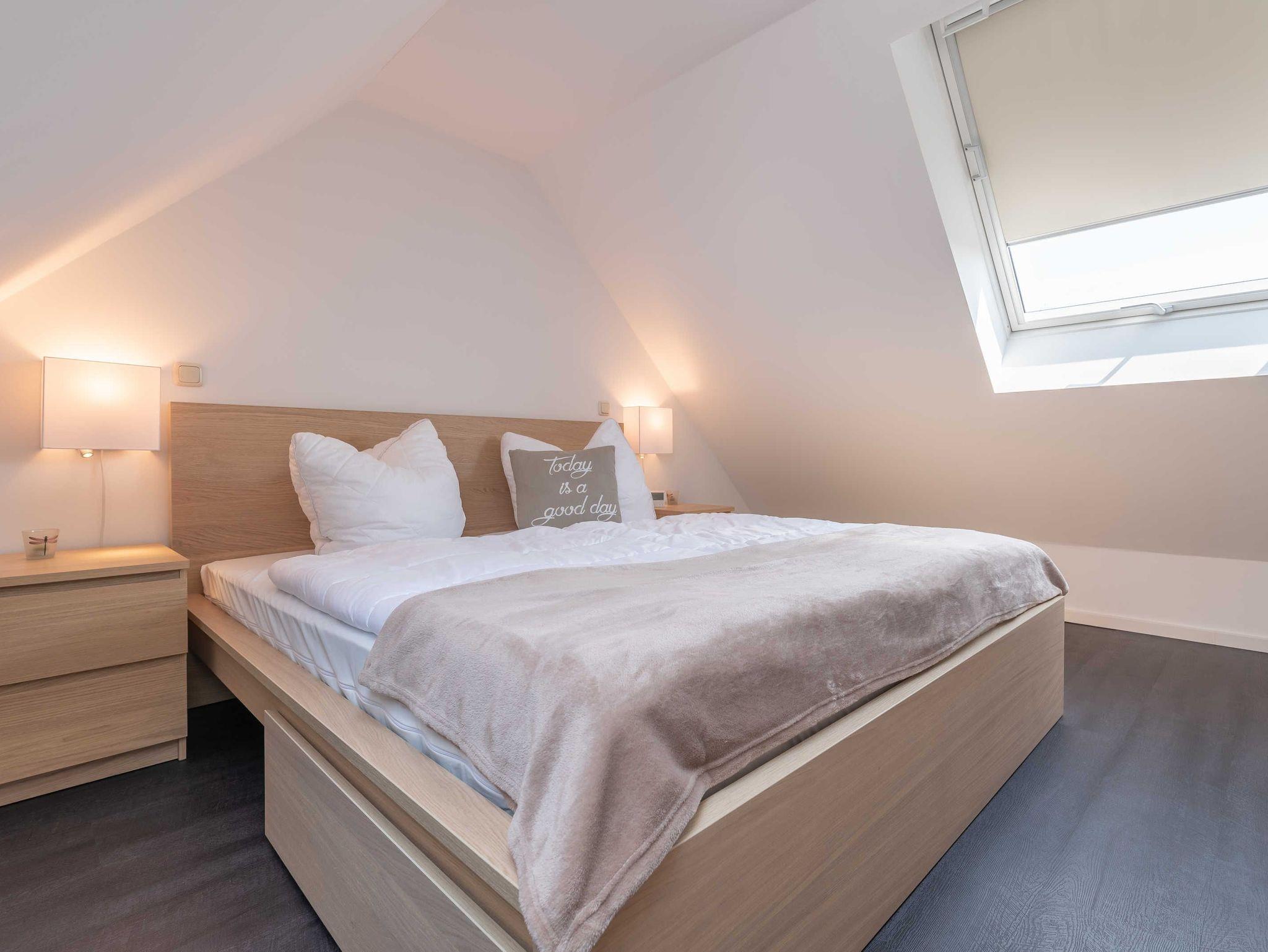 Über eine Treppe im Wohnbereich gelangt man in den Schlafbereich. Hier empfängen Sie ein Doppelbett (180 x 200 cm) mit integriertem Bettkasten (mitgetrennten Matratzen) und zwei Nachttischen. Zwei große Dachfenster ermöglichen ein gutes Durchlüften des Schlafzimmers. Die Fenster sind mit Spezialrollos ausgestattet, welche das Aufheizen des Raumes verhindern und den Raum sehr gut verdunkeln. Ein dritter Schlafplatz befindet sich im Wohnzimmer auf der großen Eckcouch. Hier ist es möglich, einen großen Hocker beizustellen, um eine geräumige Liegefläche zu schaffen. Der Schlafplatz eignet sich für eine Person bis ca. 16 Jahre.