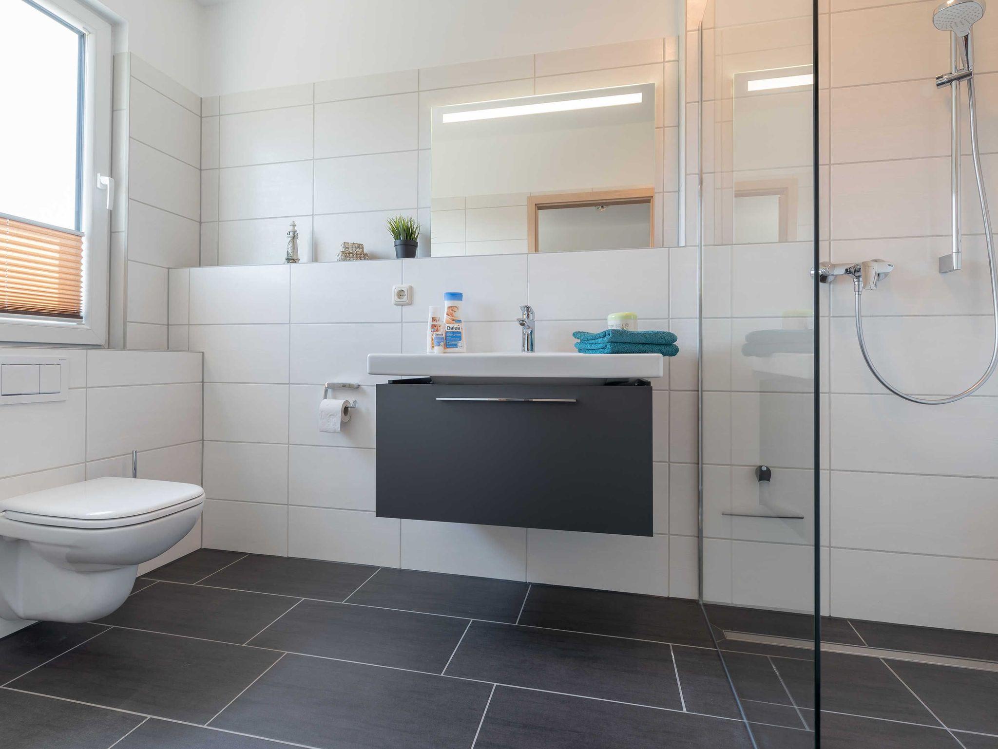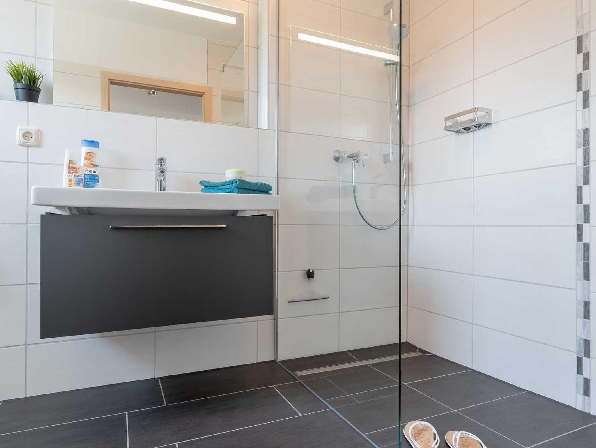 Das moderne Badezimmer mit großem Fenster ist elegant gefliest mit ebenerdiger Dusche und verfügt über einen Waschtisch mit großen Spiegel.