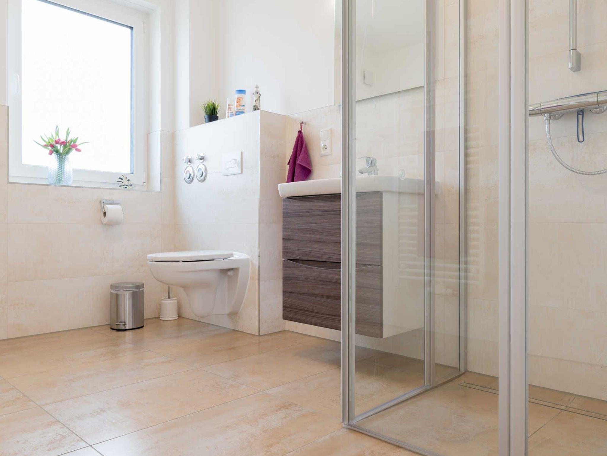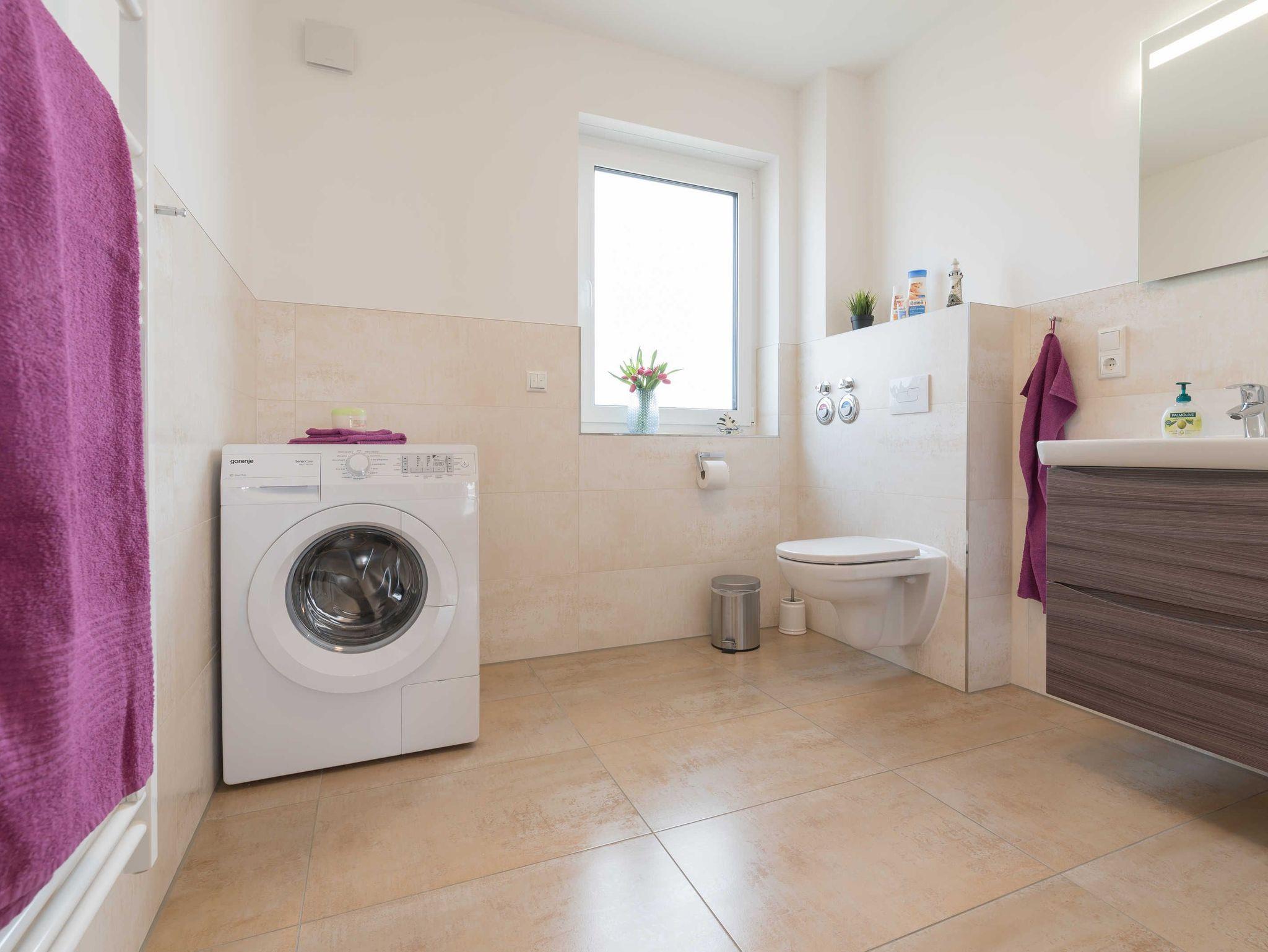 Das ca. 8 qm messende Bad ist mit einer geräumigen Dusche, einer Waschmaschine sowie einem Waschtisch mit Spiegel und Fön ausgestattet.