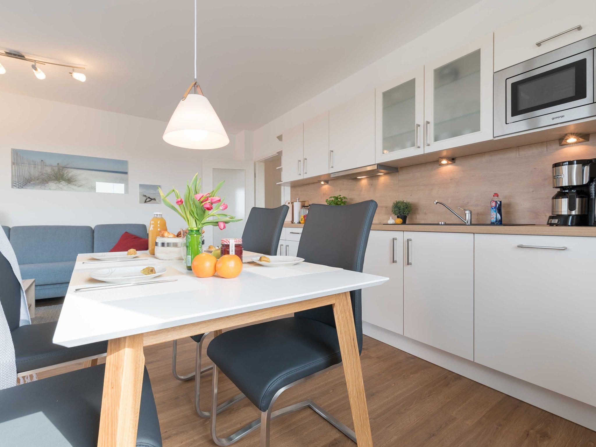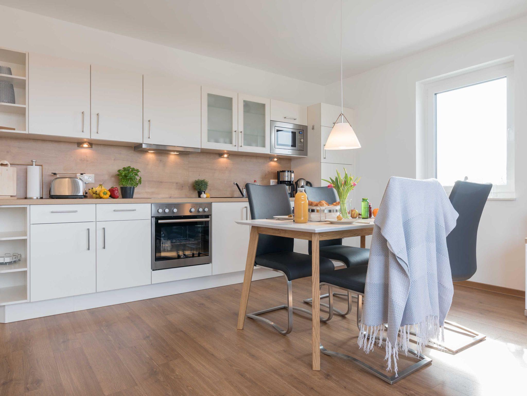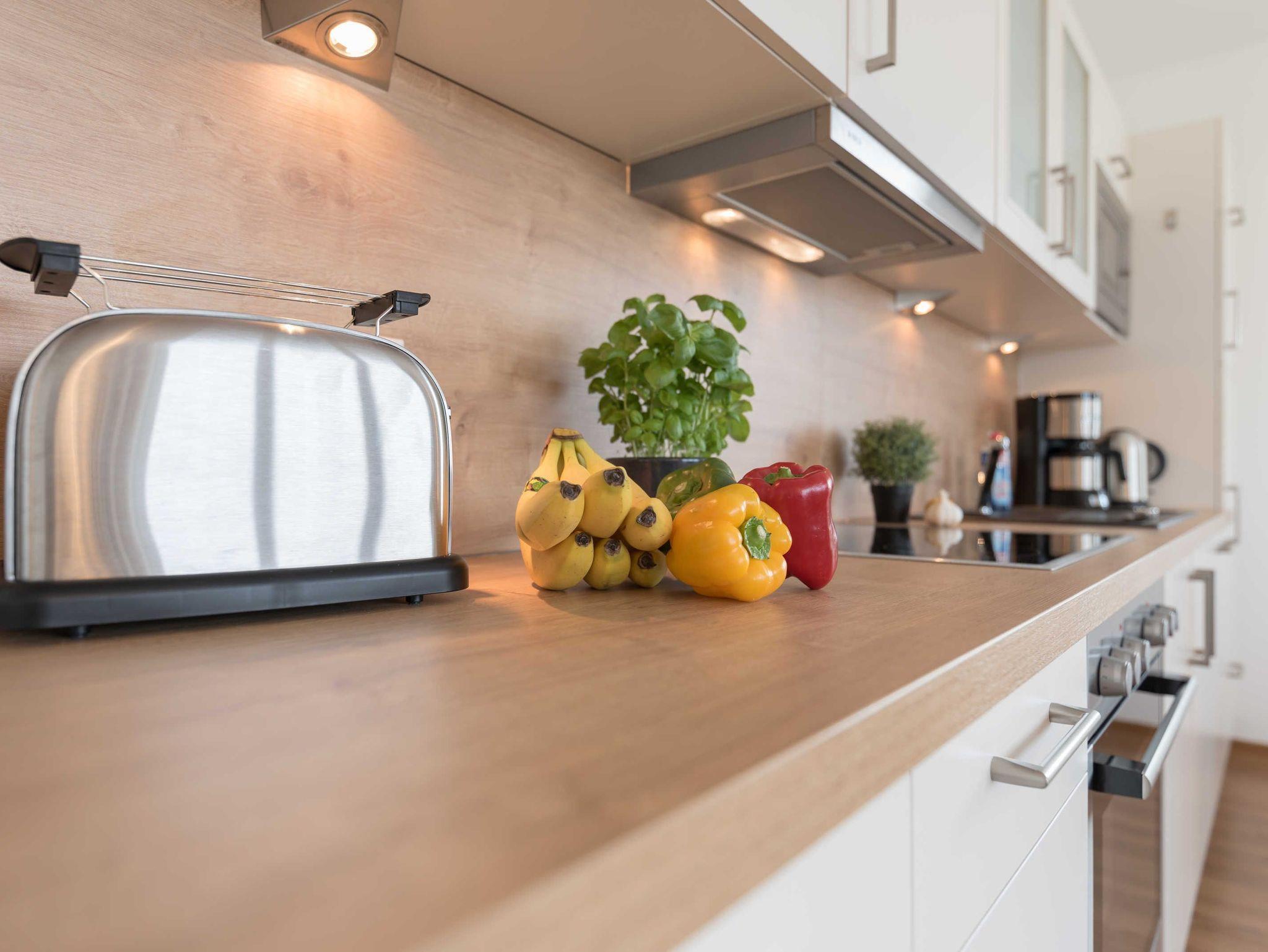 In der umfassend gestalteten Küchenzeile finden Sie alles, was Sie für einen entspannten Aufenthalt benötigen (4-Platten-Cerankochfeld, Kühlschrank mit Tiefkühlfach, Geschirrspüler, Kaffeemaschine, Toaster, Wasserkocher und Mikrowelle mit Grillfunktion).