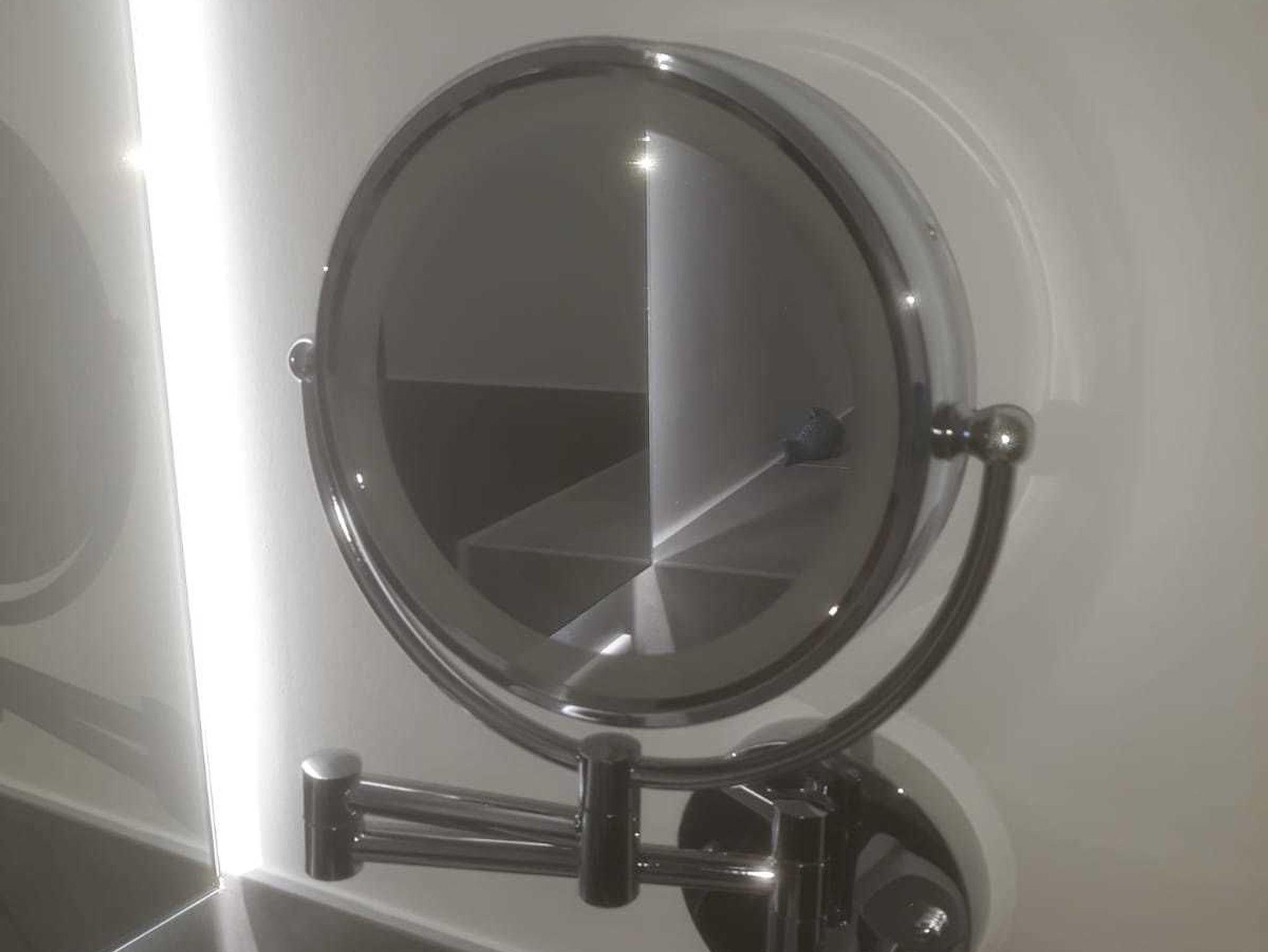 Das helle Badezimmer mit bodengleicher Dusche verfügt über einen Waschtisch, ein Ablageregal mit Haartrockner, einen Vergrößerungsspiegel, einen Hocker und ein Fenster - um die frische Meeresbrise hereinzulassen.