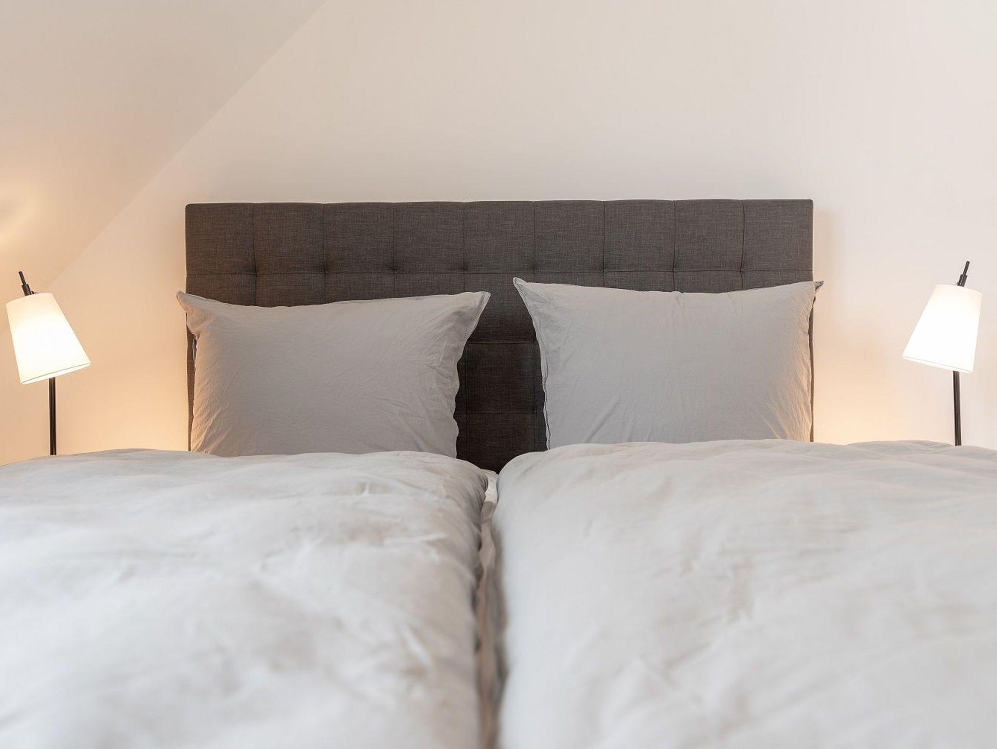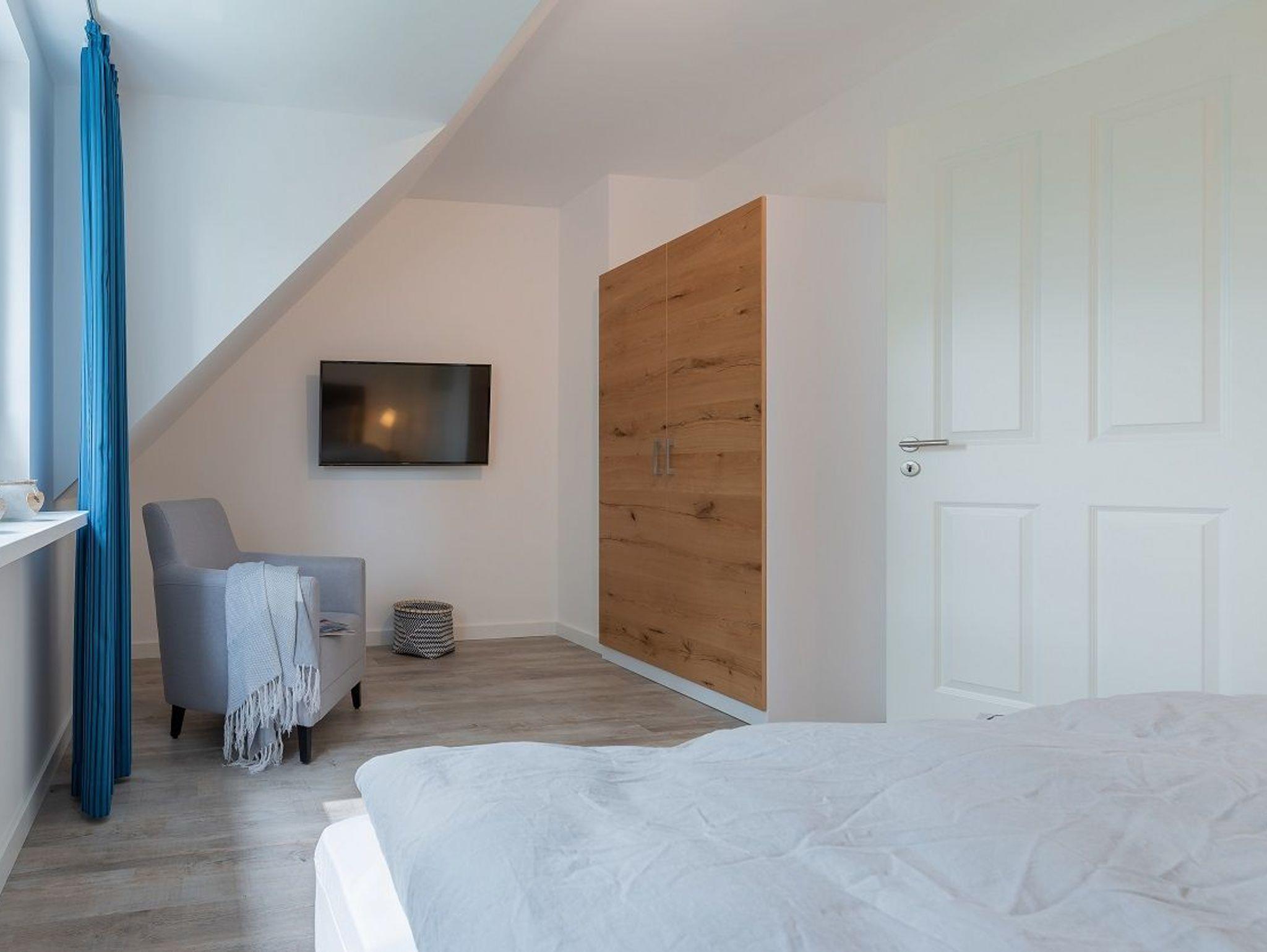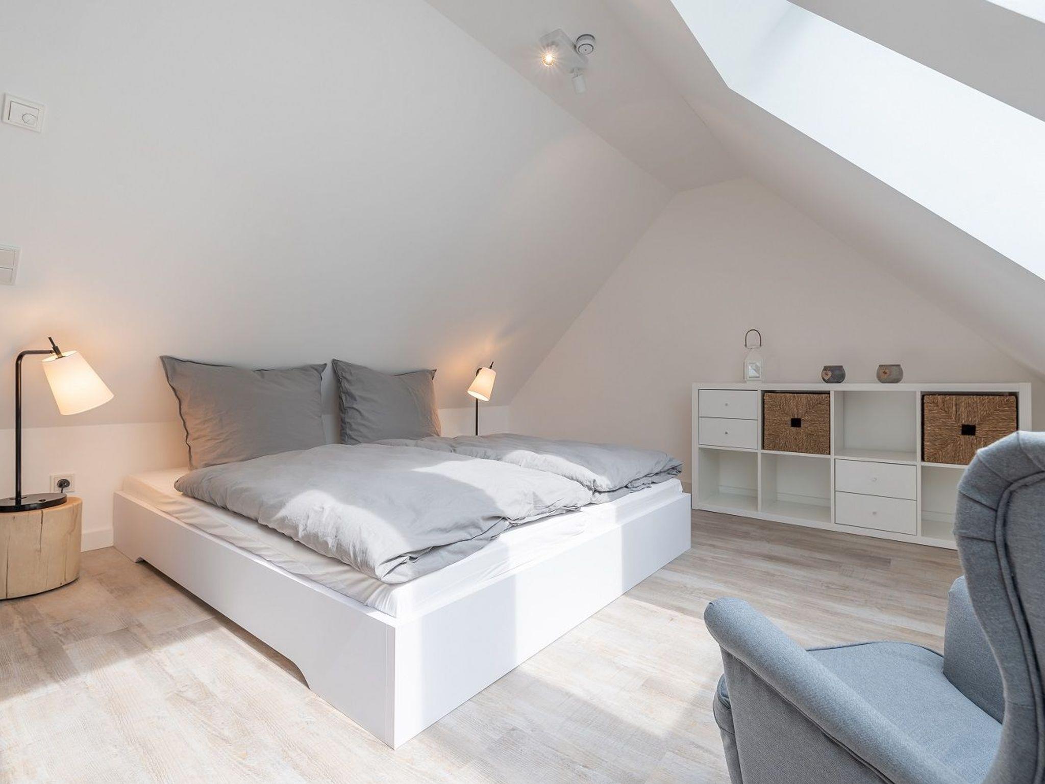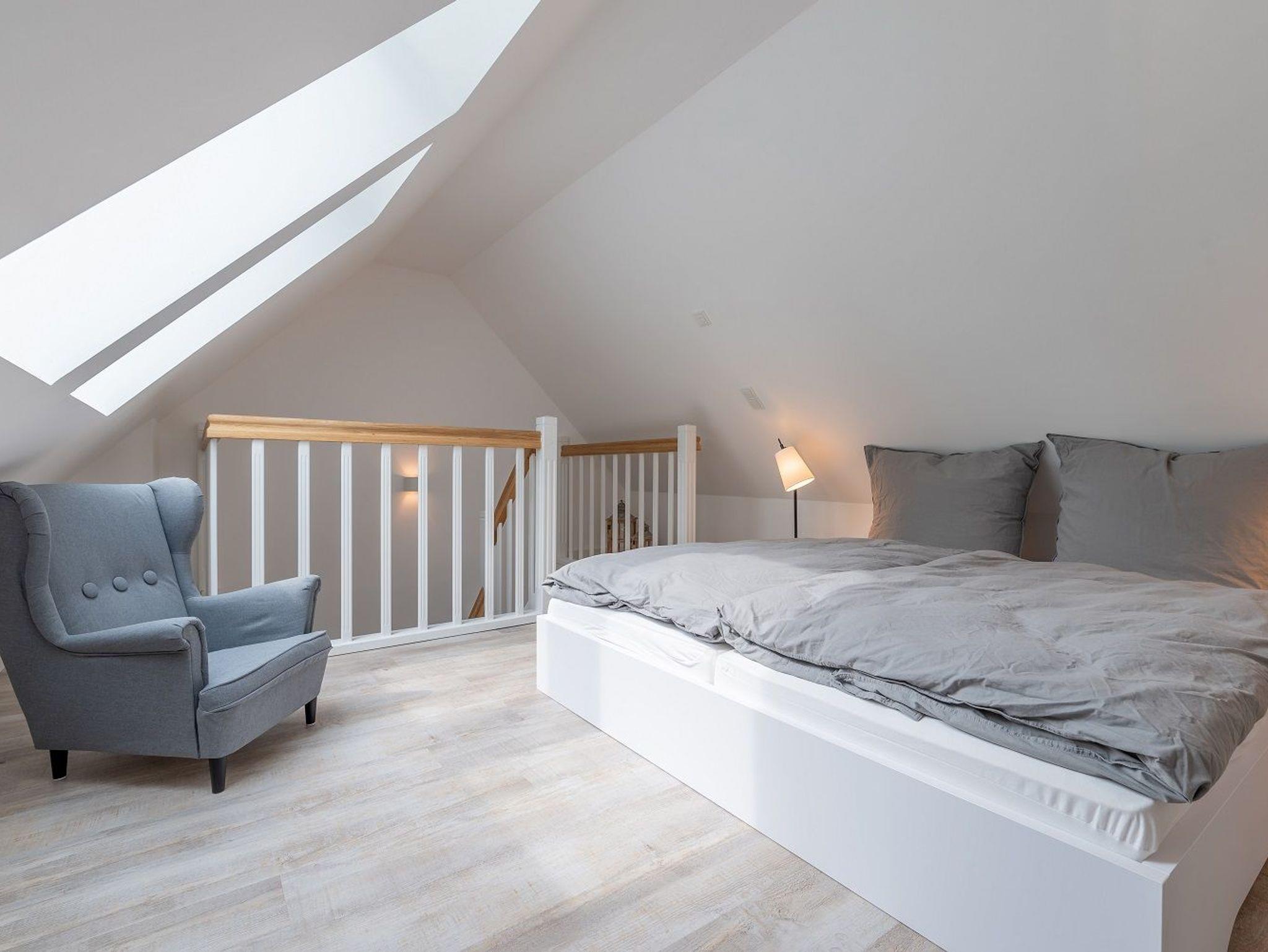 Im ersten Obergeschoss befindet sich ein weiteres großes Tageslichtbad mit Dusche. Zwei Schlafzimmer mit jeweils einem 1,80 x 2,00 m Bett sowie einem Kleiderschrank und einem TV-Gerät laden zum Träumen ein. Im ausgebauten Dachspitzboden befindet sich ein weiteres Doppelbett (1,60 x 2,00 m). Für unsere kleinen Gäste steht ein Kinderreisebett und ein Kinderhochstuhl zur Verfügung.