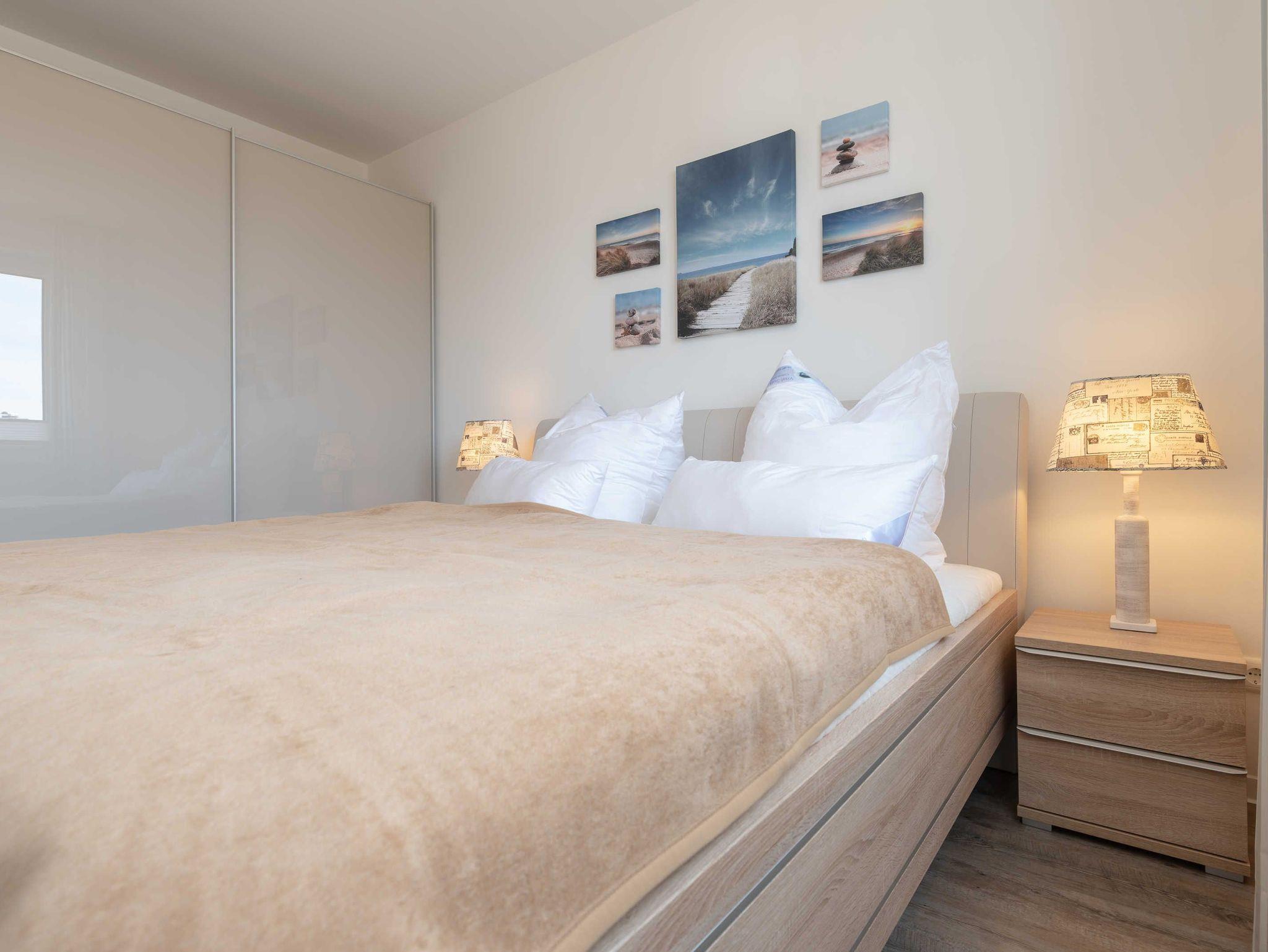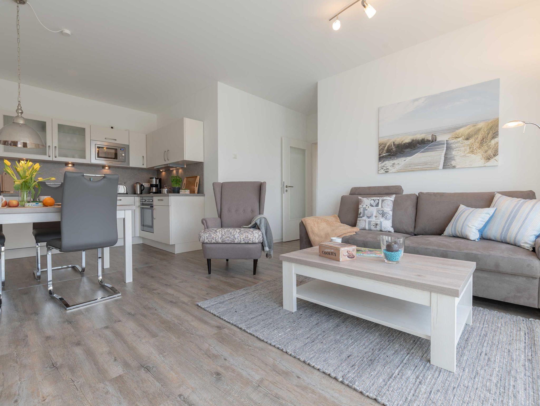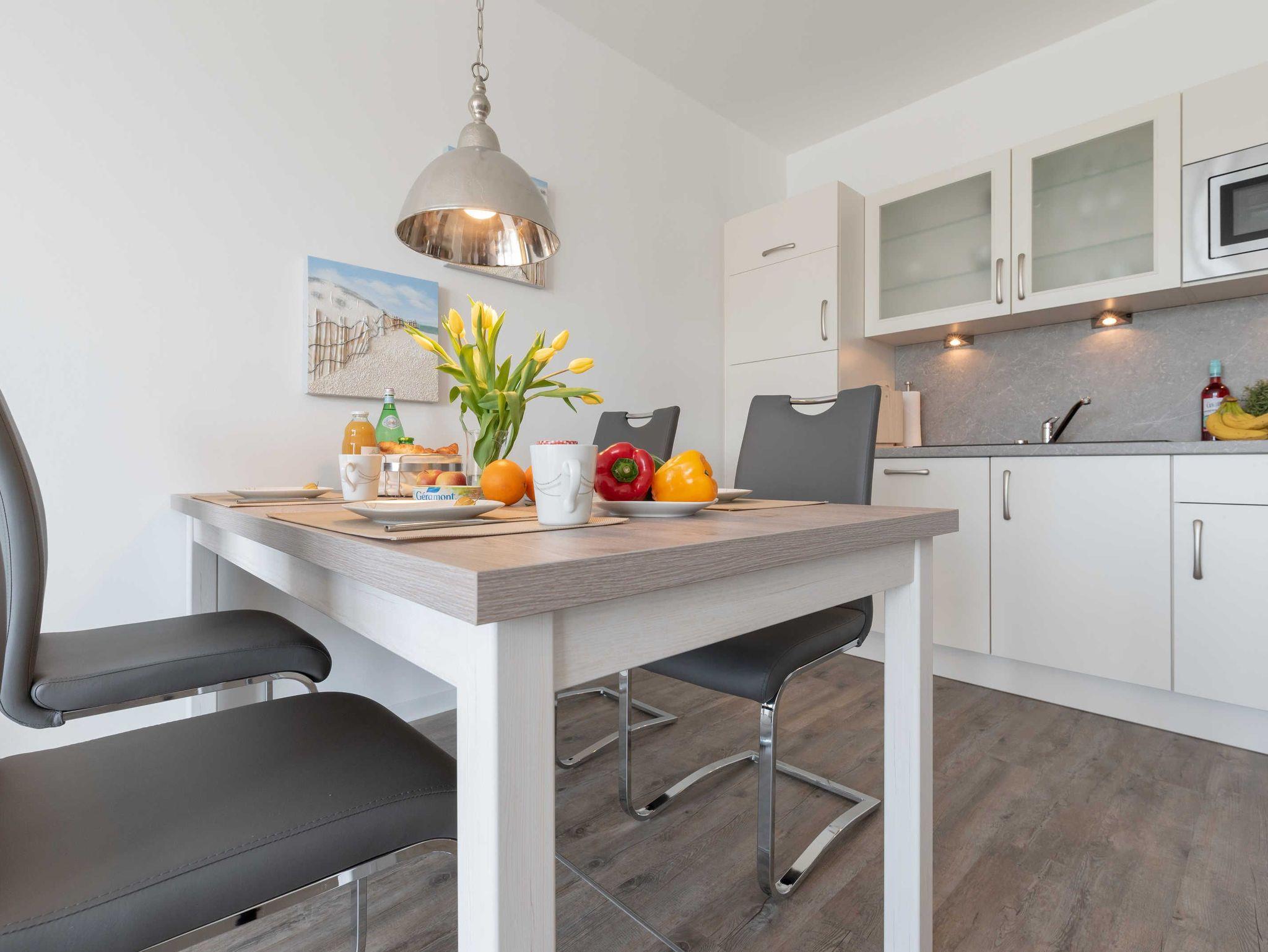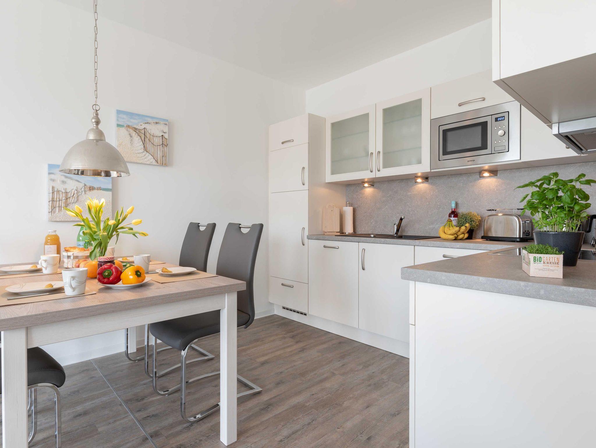 Die Wohnung verfügt über einen Wohn-/Essbereich mit integrierter Küchenzeile inkl. Kühlschrank, Ceranfeld, Backofen, Mikrowelle, Geschirrspüler und Dunstabzugshaube. Der große Esstisch lädt zu gemeinsamen Mahlzeiten und fröhlichen Spieleabenden ein. Das helle freundliche Bad[nbsp] besticht mit einer ebenerdigen Dusche und einer Waschmaschine. In den Schlafräumen erwarten Sie ein Doppelbett (180 x 200 cm) und zwei Einzelbetten (je 100 x 200 cm). Im Wohnbereich und im Schlafraum mit den zwei Einzelbetten sind Flachbildfernseher installiert.