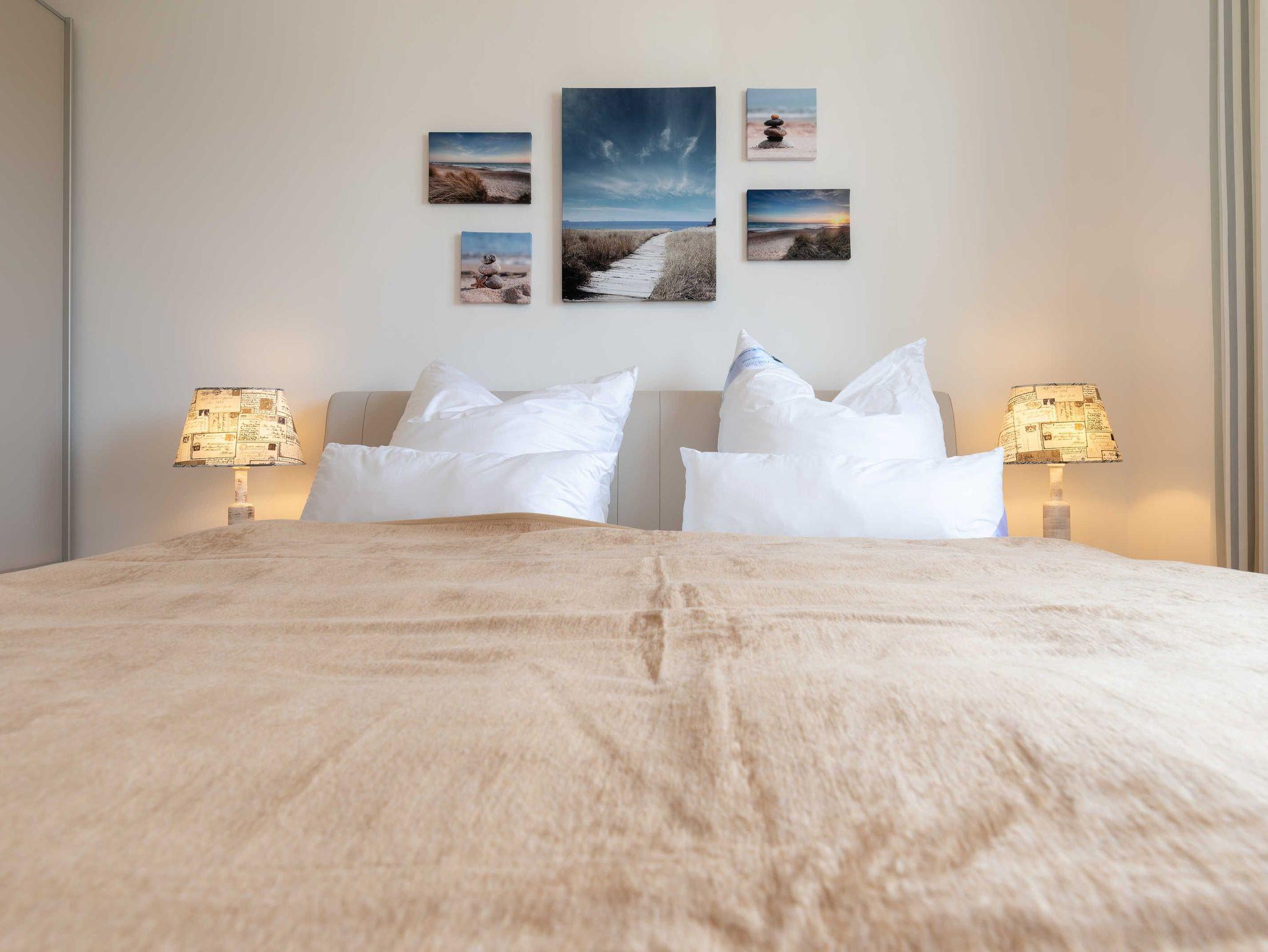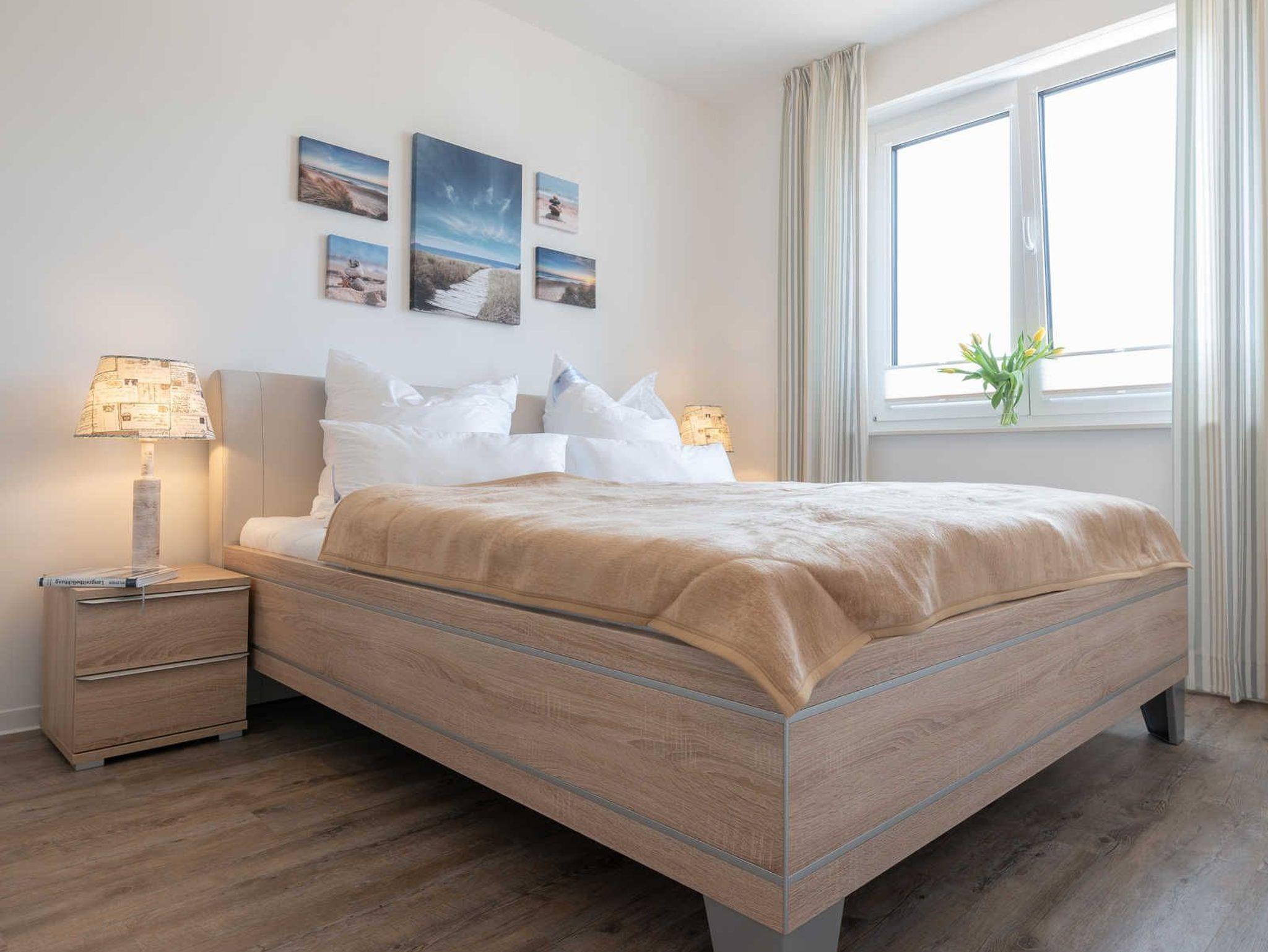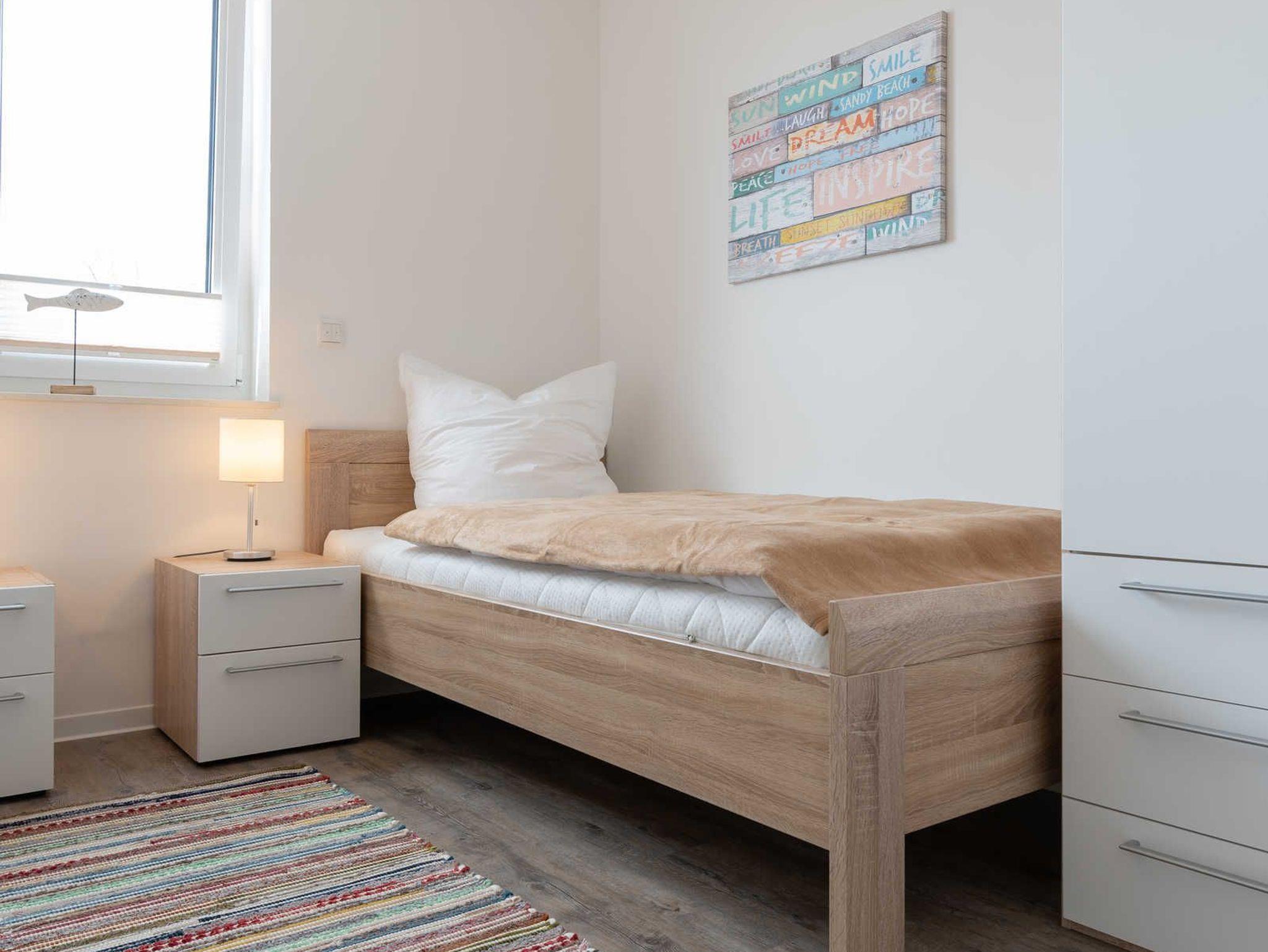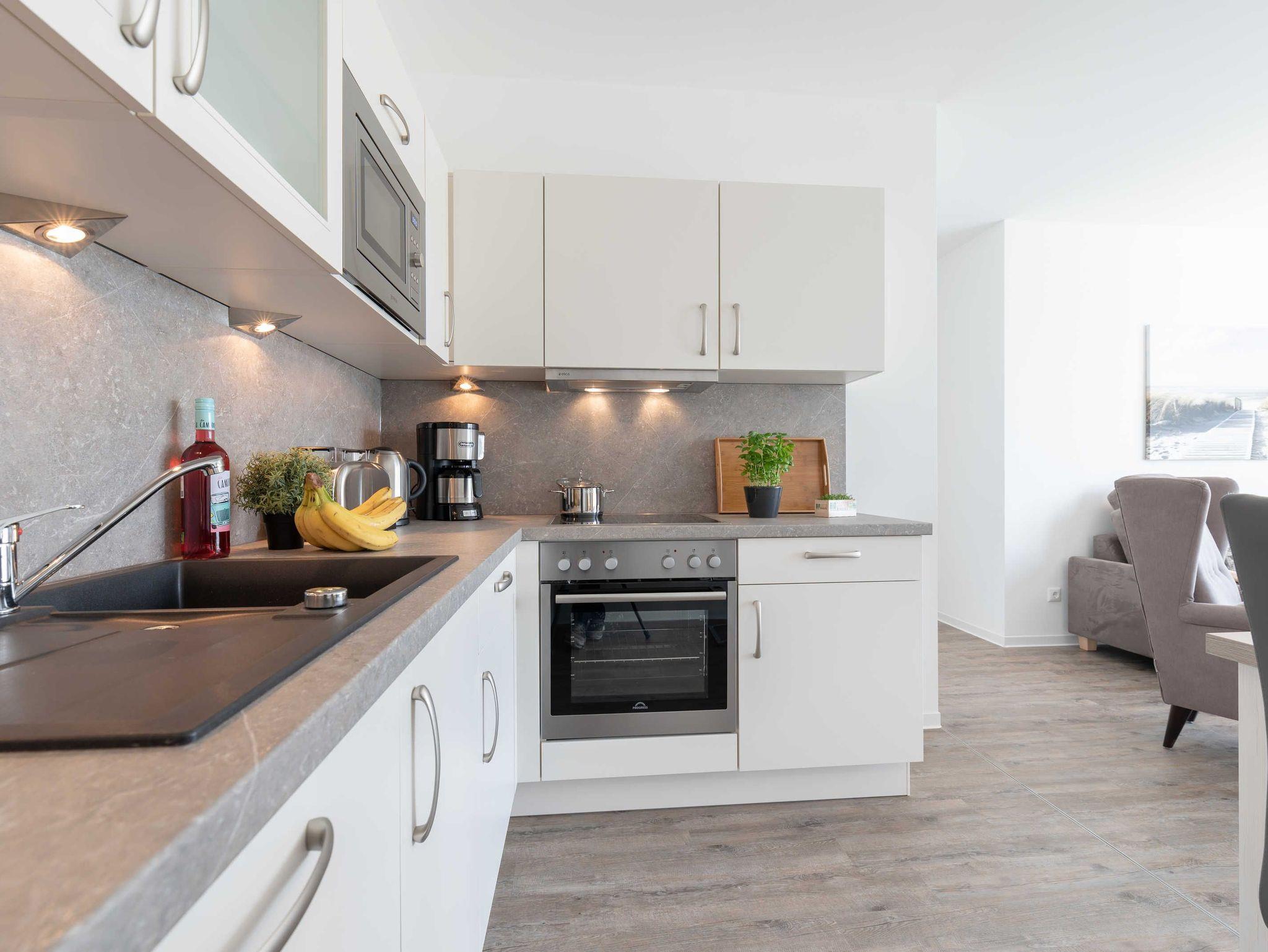 Die Wohnung verfügt über einen Wohn-/Essbereich mit integrierter Küchenzeile inkl. Kühlschrank, Ceranfeld, Backofen, Mikrowelle, Geschirrspüler und Dunstabzugshaube. Der große Esstisch lädt zu gemeinsamen Mahlzeiten und fröhlichen Spieleabenden ein. Das helle freundliche Bad[nbsp] besticht mit einer ebenerdigen Dusche und einer Waschmaschine. In den Schlafräumen erwarten Sie ein Doppelbett (180 x 200 cm) und zwei Einzelbetten (je 100 x 200 cm). Im Wohnbereich und im Schlafraum mit den zwei Einzelbetten sind Flachbildfernseher installiert.