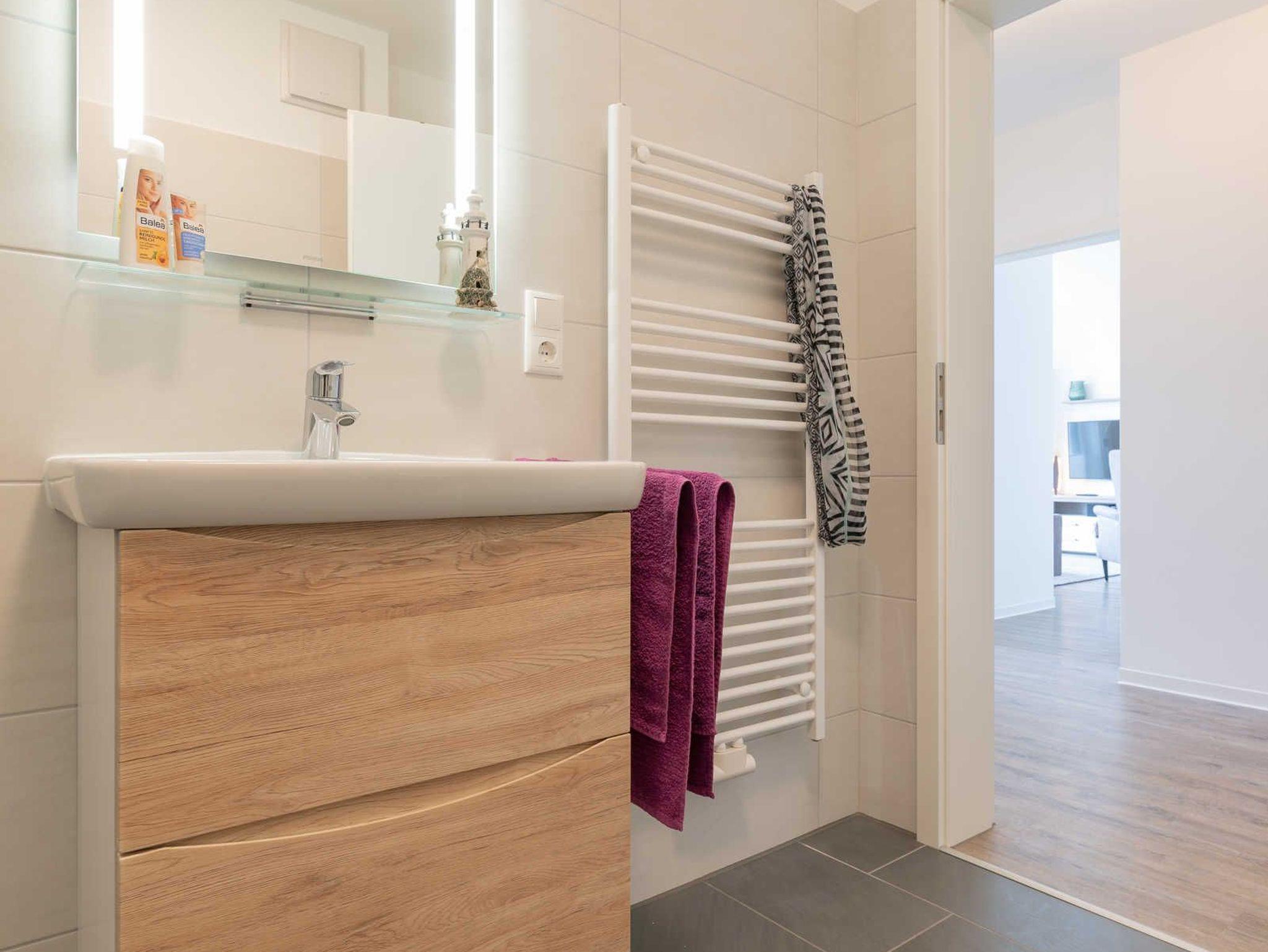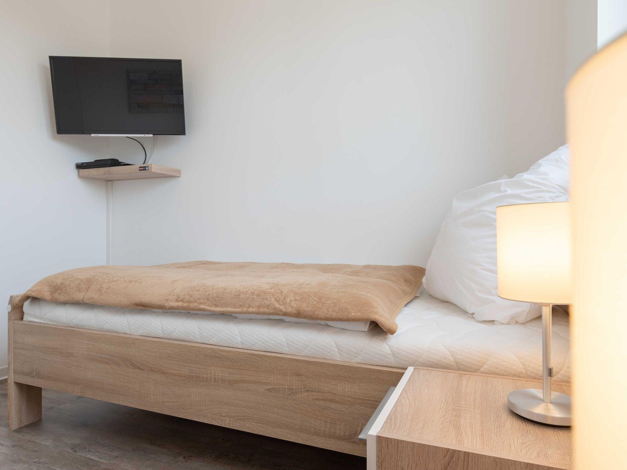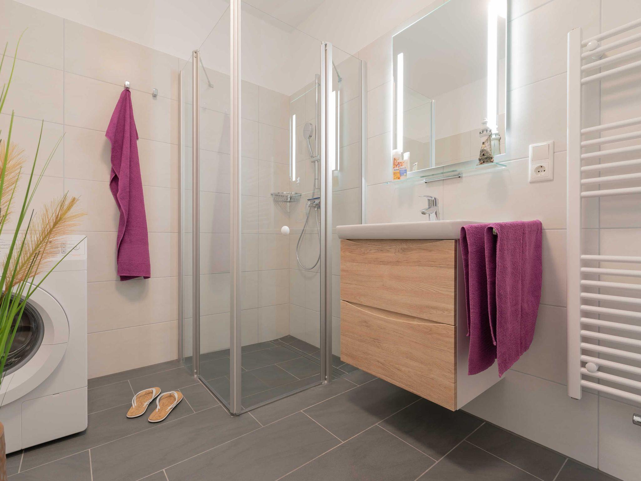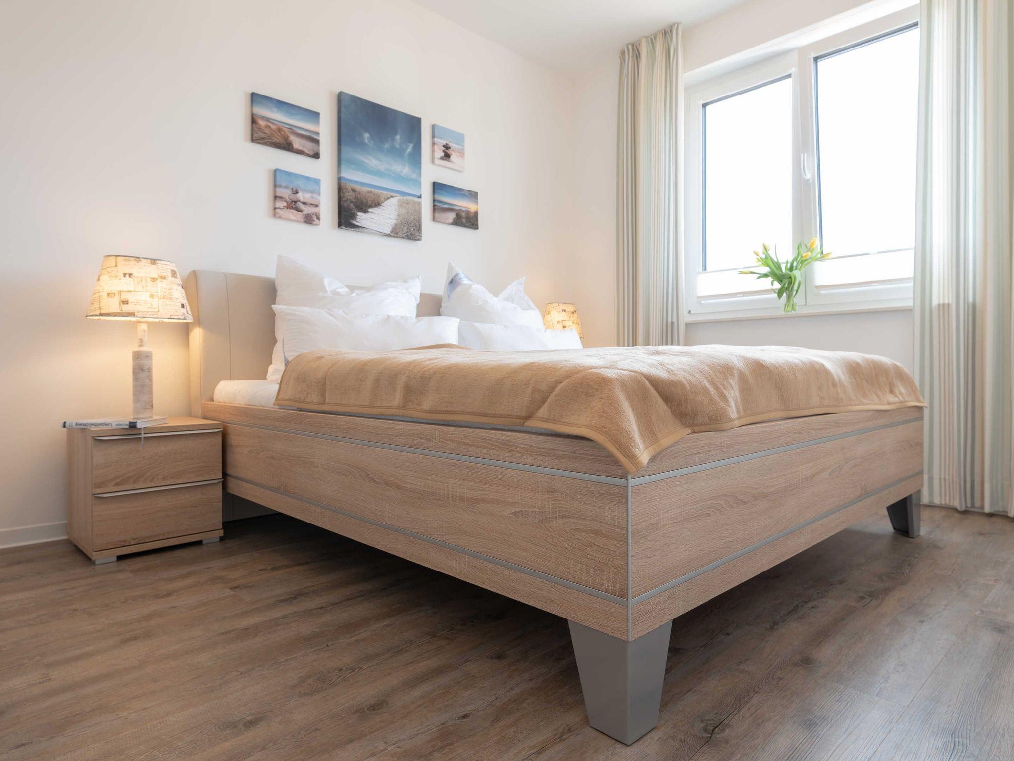 Die Wohnung verfügt über einen Wohn-/Essbereich mit integrierter Küchenzeile inkl. Kühlschrank, Ceranfeld, Backofen, Mikrowelle, Geschirrspüler und Dunstabzugshaube. Der große Esstisch lädt zu gemeinsamen Mahlzeiten und fröhlichen Spieleabenden ein. Das helle freundliche Bad[nbsp] besticht mit einer ebenerdigen Dusche und einer Waschmaschine. In den Schlafräumen erwarten Sie ein Doppelbett (180 x 200 cm) und zwei Einzelbetten (je 100 x 200 cm). Im Wohnbereich und im Schlafraum mit den zwei Einzelbetten sind Flachbildfernseher installiert.