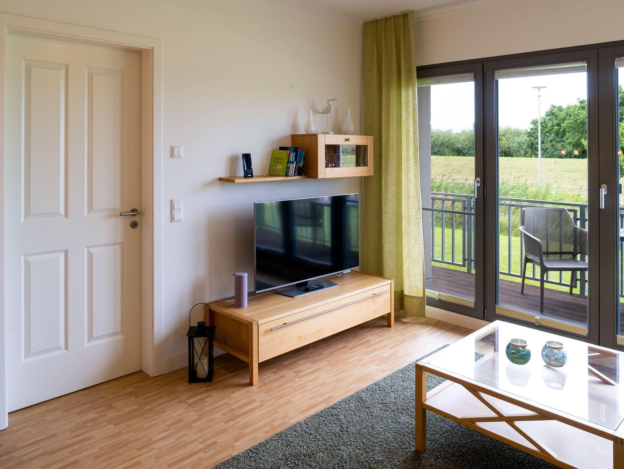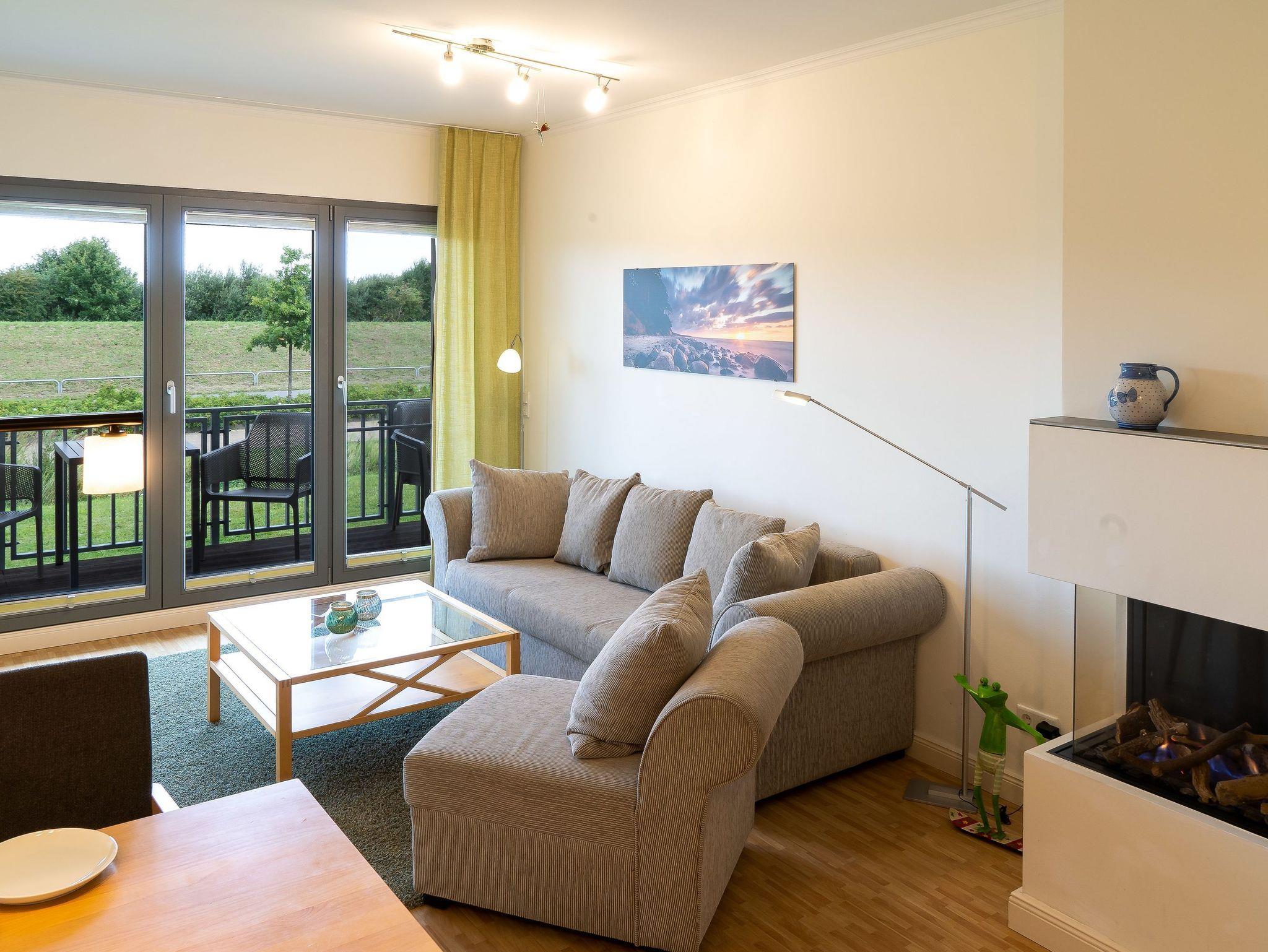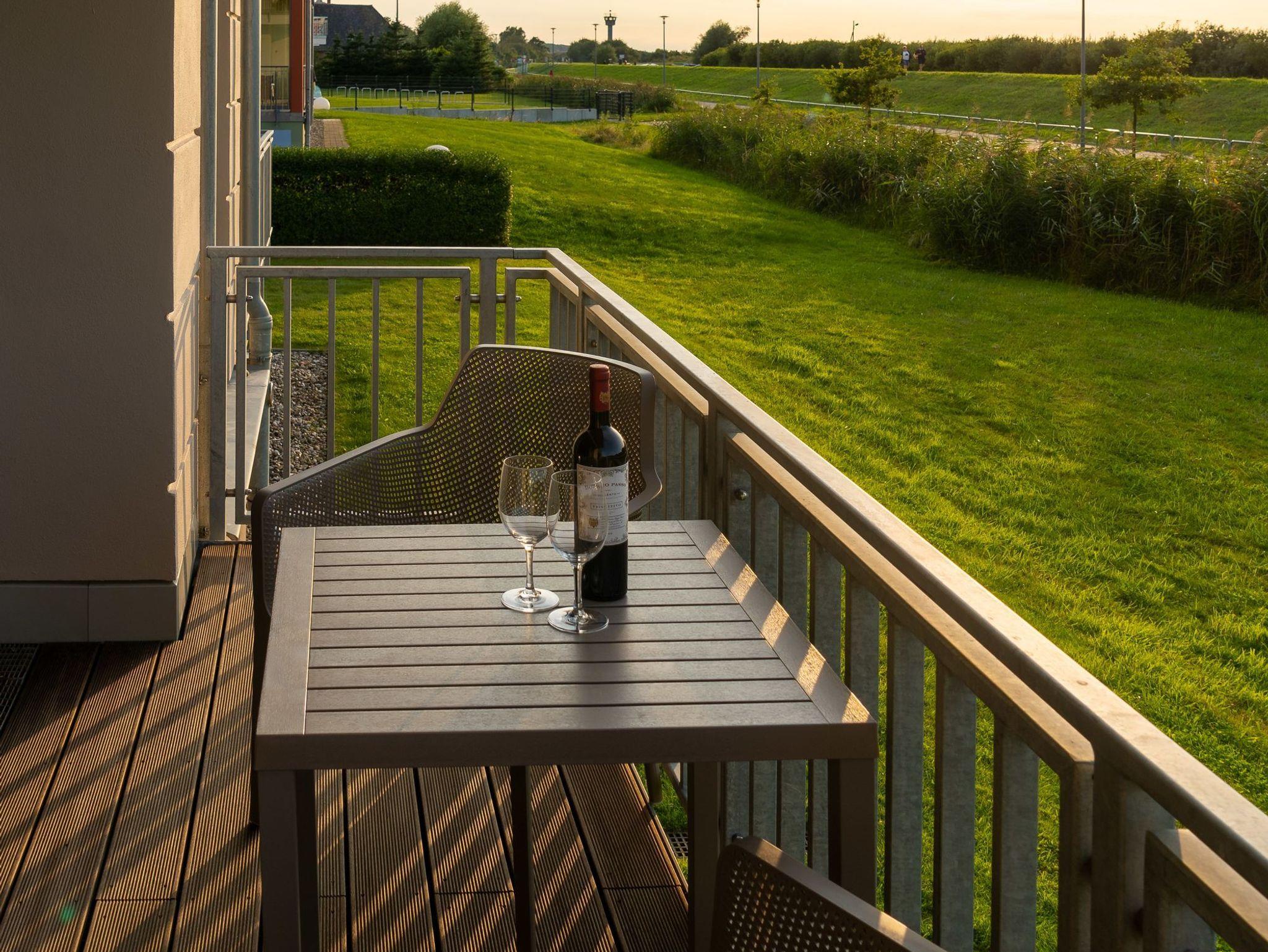 Strandnahe helle 2-Raumwohnung für max. 2 Erwachsene, mit Balkon, unverbautem Blick zum Deich (Ostseeseite) im EG (Hochparterre).