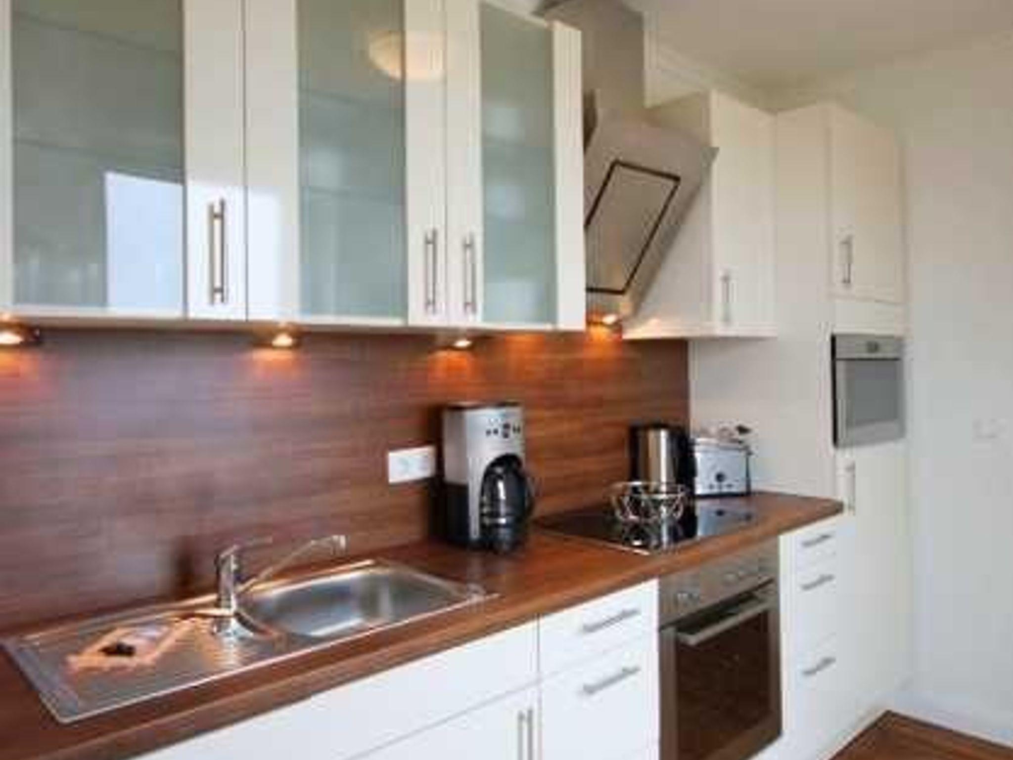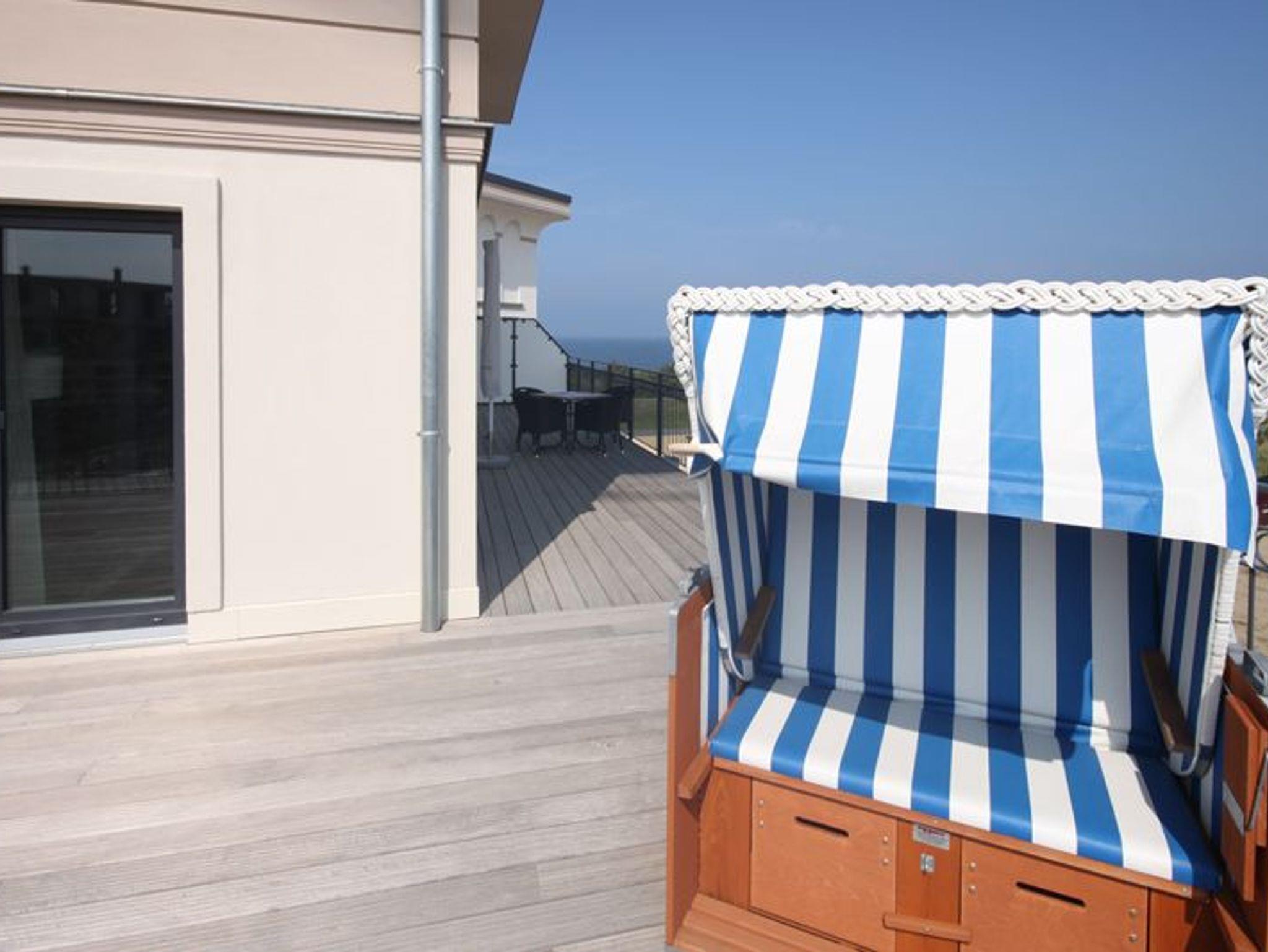 Das lichtdurchflutete Wohn-/ Esszimmer empfängt Sie mit stimmigen Massivholzmöbeln aus Ahorn. Die sandfarbene Stoffcouch mit Blick auf den Flatscreen-TV und ein kuscheliger Teppich sorgen für Wohnfühlatmosphäre. Bei Bedarf kann die Schlafcouch ausgeklappt werden (Liegefläche 140 x 190 cm). Eine Kompaktanlage, DVD-Player und MP3-Anschluß runden die technische Ausstattung ab. Zudem sorgen die vorhandenen Gesellschaftsspiele für bunte Unterhaltung in geselliger Runde. Vom Esstisch genießen Sie parallel einen herrlichen Blick auf die See. Die Einbauküche ist voll ausgestattet mit Geschirrspüler, großem Kühlschrank, inklusive Gefrierfach, Backofen, Cerankochfeld, Kaffeemaschine, Toaster, Mikrowelle und externem Elektrogrill. Das Schlafzimmer ist ebenfalls mit Massivholzmöbeln aus Ahorn ausgestattet. Es erwarten Sie ein gemütliches Doppelbett (Liegefläche 180 x 200 cm /getrennte Matratzen /integrierter Bettkasten) und ein dreitüriger Kleiderschrank mit großem Innentürspiegel sowie ein Herrendiener. Das elegante Duschbad besticht mit bodengleicher Dusche, Föhn und Handtuchtrockner. Ein separater Abstellraum mit Schuhregal bietet Stauraum für Ihr Gepäck. Highlight der Wohnung ist die weite Dachterrasse (Balkon) in Ost-Süd-Lage, die aus jedem Zimmer heraus begehbar ist. Die vorhandene Sitzecke lockt zum Frühstücken bei Sonnenaufgang und ein Strandkorb mit Fleece Decken sorgt für gemütliche Stimmung auch in den kühleren Abendstunden. Ein Sonnenschirm steht ebenfalls zur Verfügung. Eine Fußbodenheizung sorgt bei Bedarf für wohlige Wärme in allen Räumen. Zu Ihrer Ferienwohnung gehört ein kostenfreier Tiefgaragenstellplatz. Bitte beachten Sie die Durchfahrtshöhe von max. 1,90 m. Der im Gebäude installierte Aufzug erleichtert den Transport der mitgebrachten Koffer. Über den Innenhof der Villa erreichen Sie den abschließbaren Fahrradraum sowie den angrenzenden Waschraum. Eine Waschmaschine und ein Trockner stehen zu Ihrer Verfügung (gegen Gebühr / 1,00 Euro Münzen). Hier noch einige Hinweise: Es handelt sich um eine Nichtraucherwohnung. Es sind keine Haustiere erlaubt. Das kostenfreie WLAN in der Unterkunft ist ausschließlich für die Verwendung von Social Media und den Austausch von Bildern mit Familie und Freunden gedacht. Die Nutzung zum Streamen von Filmen ist nicht vorgesehen. Ab der dritten Person (ab 3 Jahre) wird ein Aufpreis in Höhe von 10,00 Euro/ÜN berechnet. Wäscheset, Kinderreisebett und Kinderhochstuhl können kostenpflichtig zugebucht werden. Der Strand liegt nur 50 Meter von der Ostsee entfernt! Sichern Sie sich einen der begehrten Strandkörbe nur ein paar Meter entfernt von den rauschenden Wellen der Ostsee (Anfang Mai - Ende August) und buchen Sie jetzt zu besonderen Konditionen (12,00 Euro pro Tag oder 75,00 Euro pro Woche).