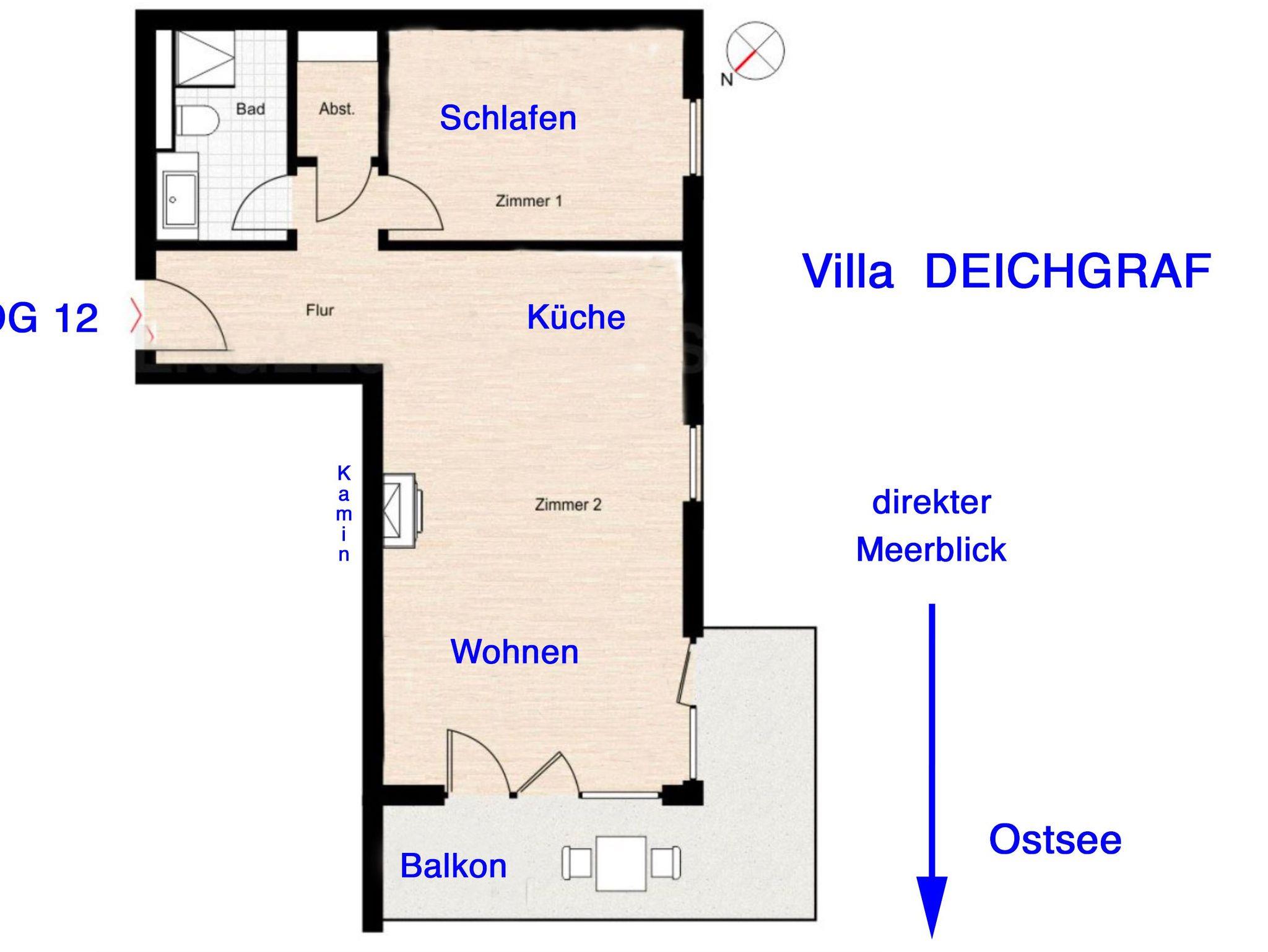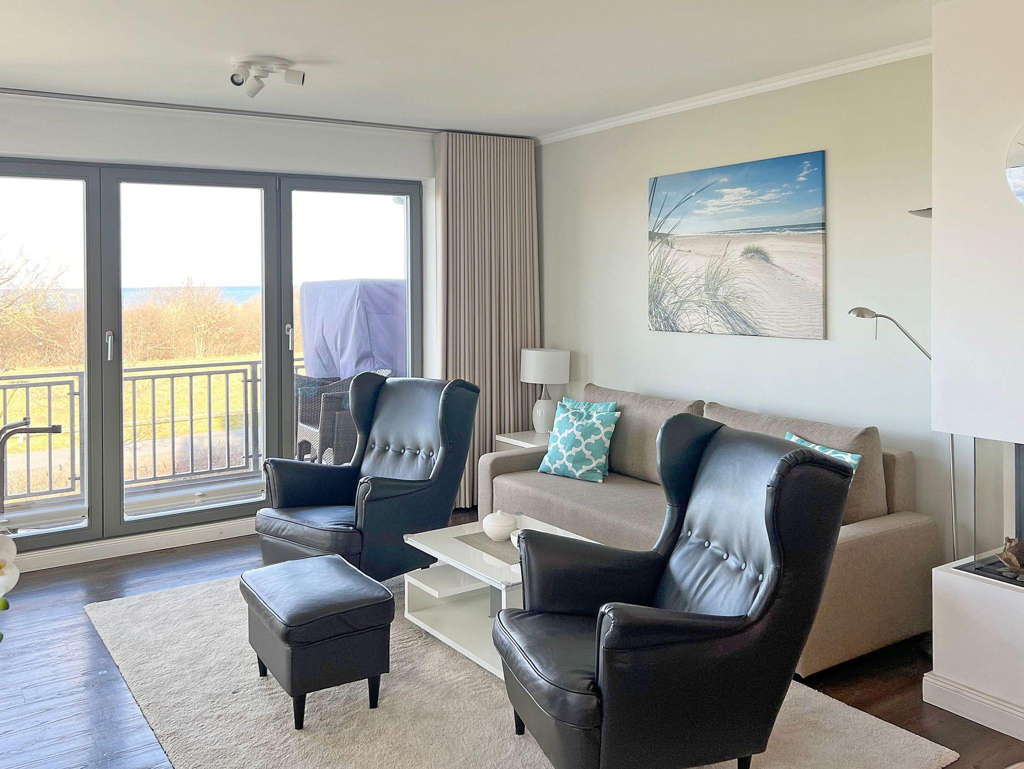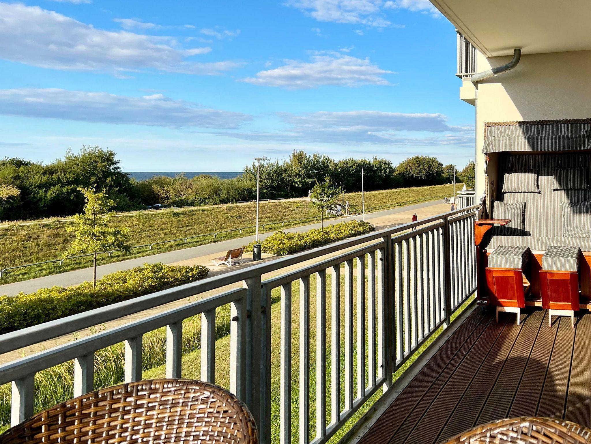 Strandnahe 2-Raumwohnung für max. 3 Erwachsene und 1 Kleinkind, Kamin, Balkon mit Strandkorb und traumhaften Meerblick im 1.OG.