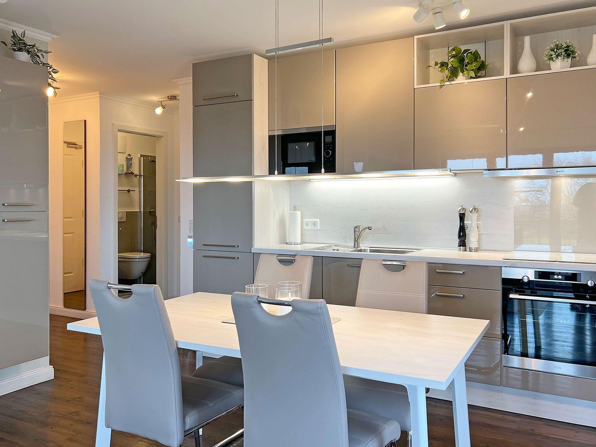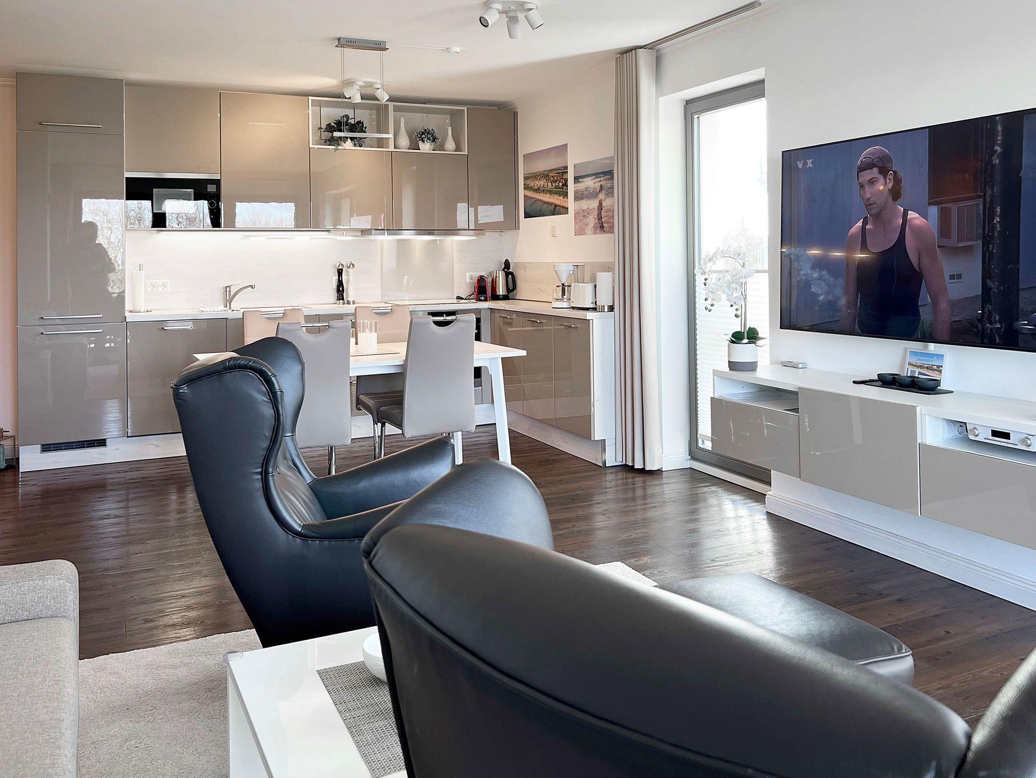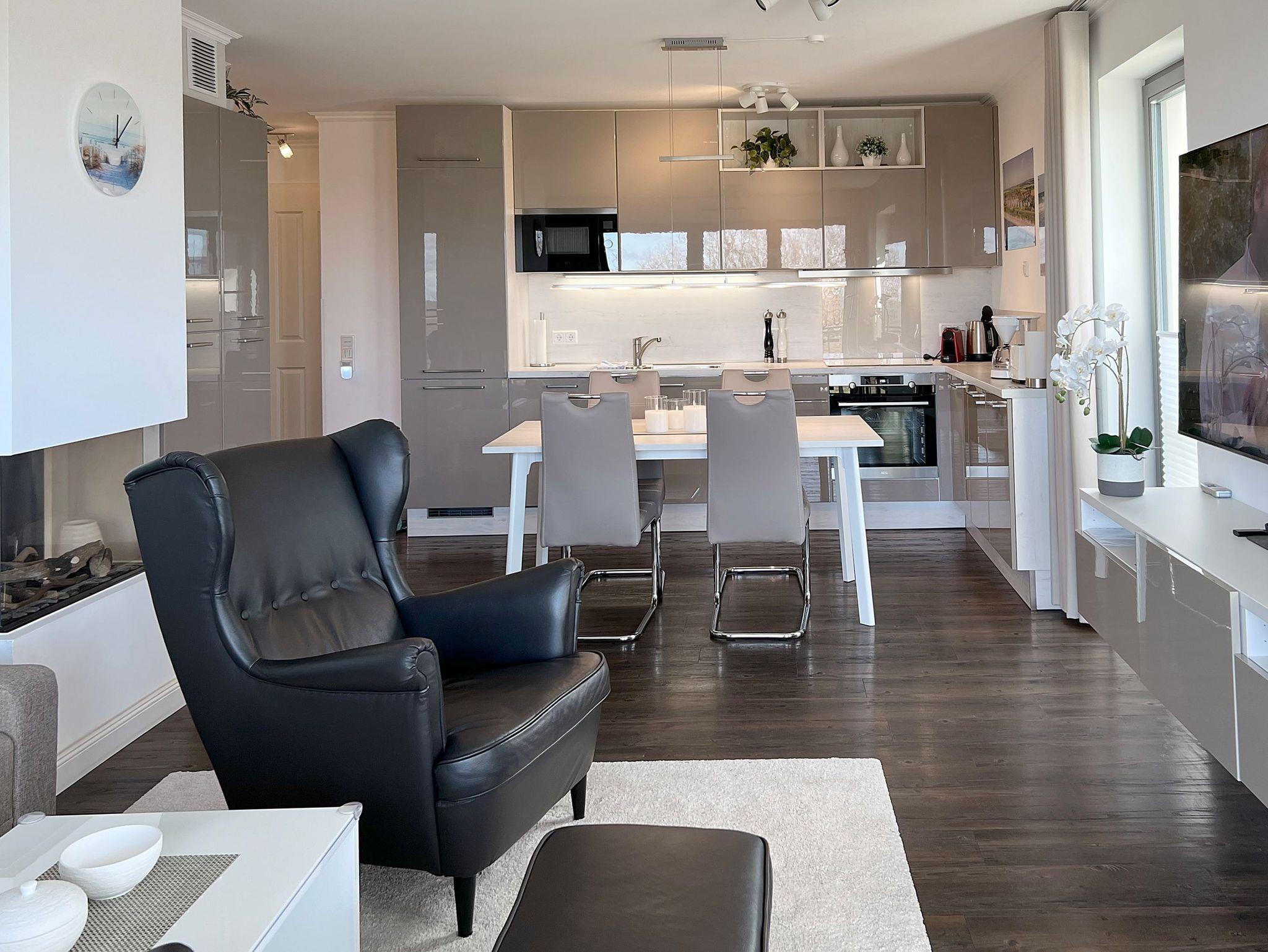 Die Ferienwohnung wurde im November 2022 neugestaltet. Im Wohnbereich empfangen Sie eine bequeme Sitzecke mit ausziehbarer Schlafcouch (1,40 x 2,00 m), ein TV-Board und als besonderes Highlight ein großer 65-Zoll-Fernseher mit Blu-ray-Player. Ein ganzer Schwung an DVDs und ein Radio-CD-Player mit der Möglichkeit über Bluetooth Musik vom Handy zu spielen. Das sorgt für gute Laune. Ein stilvoller gläserner Gas- Kamin und dessen Flammenspiel wirken entschleunigend und zaubern stimmungsvolle Stunden. Die großzügige Fensterfront über Eck flutet den Raum mit Licht. Zudem erhascht man bereits von der Sitzecke aus, einen Blick auf die Ostsee. In der offenen Einbauküche mit Backofen und 4-Platten-Ceranfeld, Geschirrspüler, Kühlschrank mit Gefrierfach, Mikrowelle, Kaffeemaschine, ?Nespressomaschine?, Wasserkocher und Toaster lassen sich leckere Mahlzeiten zubereiten und am angrenzenden Esstisch mit vier ledernen Hochlehnern verzehren. Über den Wohnbereich gelangen Sie auf den großen Eckbalkon in Nord-West-Ausrichtung mit traumhaftem Meerblick. Hier können Sie die Nachmittags- und Abendsonne und unvergessliche Sonnenuntergänge genießen. Der Balkon mit Tisch, Stühlen und einem stilechten Strandkorb ist auch bei schlechterem Wetter durch den darüberliegenden Vorbau gut geschützt. Ein modernes Boxspringbett mit durchgehender Matratze von 1,80 x 2,00 m. erwartet Sie im Schlafzimmer. Ein zusätzlicher Topper, ein Kleiderschrank mit Ganzkörperspiegel und eine Wandkommode sowie ein moderner 65 Zoll TV darüber vervollständigen den Raum. Bitte beachten Sie, dass im Schlafzimmer kein Platz für ein zusätzliches Kinderreisebett vorhanden ist. An allen Fenstern sind blickdichte Vorhängen und Plissees vorhanden. Das Badezimmer besticht mit bodentiefer Dusche, großem Spiegel, LED-Kosmetikwandspiegel, elektrischem Handtuchtrockner, Personenwaage, Föhn und mehreren Ablagemöglichkeiten. Ein kleiner Garderobenbereich am Eingang der Wohnung bietet dem Anlass entsprechend Platz für Jackett und Windjacke. Zusätzliche Dinge wie Ihre Koffer können Sie bequem im separaten Abstellraum unterbringen. In allen Räumen wurde eine Fußbodenheizung für angenehme und gleichmäßige Wärme eingebaut. Die Unterkunft liegt nur wenige Meter zum Strand entfernt und wird lediglich durch die gepflegte Promenade von den Dünen getrennt. Kein Autoverkehr! Zur Wohnung gehören zudem ein kostenfreier Tiefgaragenstellplatz und eine Abstellmöglichkeit für Fahrräder. Bitte beachten Sie die Durchfahrtshöhe von max. 1,90 m der Tiefgarage. Mit einem Personenaufzug gelangen Sie von der Tiefgarage aus direkt zu Ihrer Wohnung. Im Erdgeschoss der Wohnung befindet sich ein gekennzeichneter Abstellbereich für Kinderwagen. Noch einige Hinweise: Es handelt sich um eine Nichtraucherwohnung. Haustiere sind nicht gestattet. Das WLAN steht kostenlos in allen Zimmern zur Verfügung. Das Datenvolumen ist unbegrenzt, so dass Sie ohne Limit nach Herzenslust streamen können. Das Netz schwankt aber leider noch, wenn sich viele Nutzer in Börgerende im Internet befinden. Für Netflix z.B. reicht es aber zumeist völlig aus. Wäschesets, Kinderreisebett und Kinderhochstuhl können kostenpflichtig zugebucht werden. Waschmaschine und Trockner stehen im separaten Hauswirtschaftsraum im Untergeschoss der Villa zu Ihrer Verfügung (gegen Gebühr / 1,00 Euro Münzen). Ab der dritten Person wird ein Aufschlag in Höhe von 15,00 Euro/ÜN berechnet. Sichern Sie sich einen der begehrten Strandkörbe nur ein paar Meter entfernt von den rauschenden Wellen der Ostsee (Anfang Mai - Ende August) und buchen Sie jetzt zu besonderen Konditionen (12,00 Euro pro Tag oder 75,00 Euro pro Woche.)