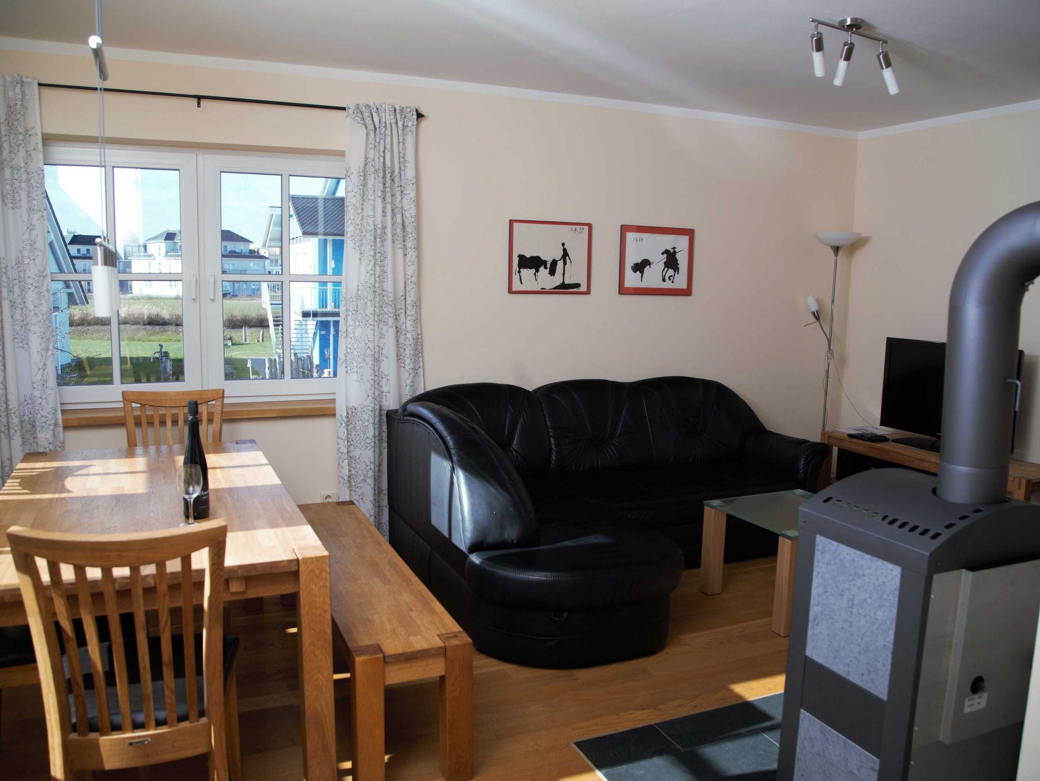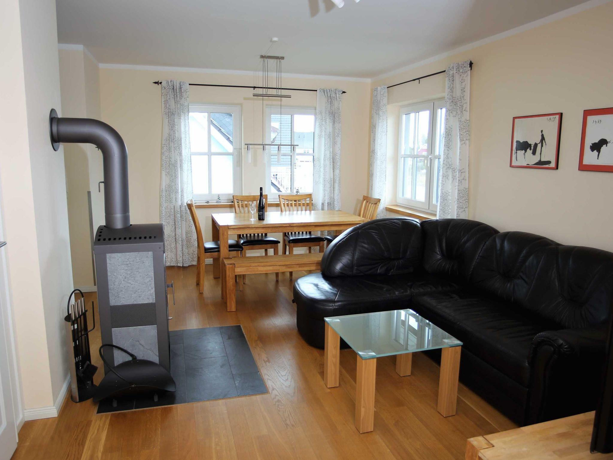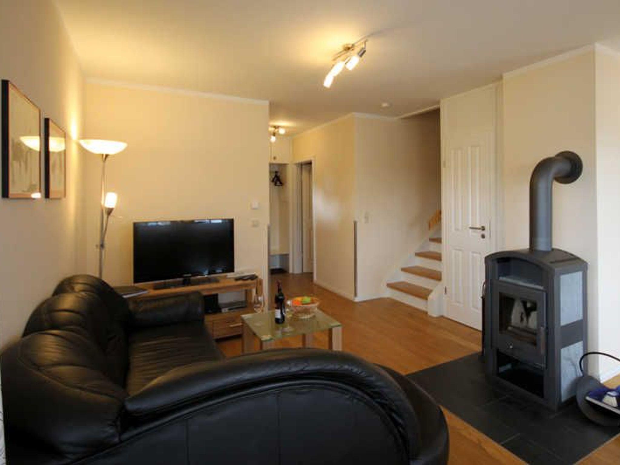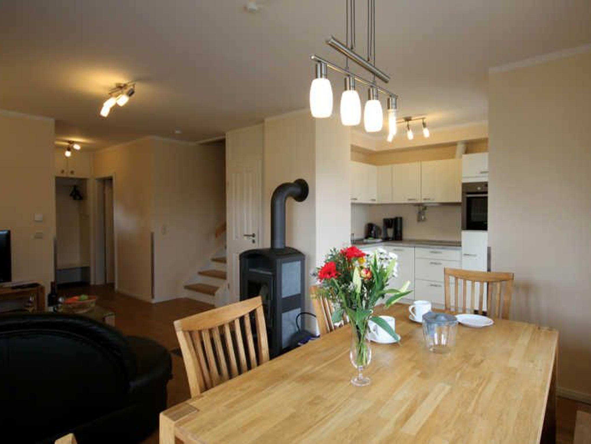 Das offene Wohn-/ Esszimmer empfängt Sie mit einem rustikalem Kaminofen (Brennholz muss selbst organisiert werden), einer ausziehbarer Eckcouch und einem großem Esstisch mit Stühlen und Sitzbank . Ein Flatscreen-TV und ein Musikradio gehören zum technischen Zubehör des Raums. Die Einbauküche ist voll ausgestattet mit Geschirrspüler, Kühl-/Gefrierkombi, Ceranfeld, Backofen, Kaffeemaschine, Wasserkocher und Toaster. Das Bad besticht mit einer ebenerdigen Dusche. Ein kleiner separater Abstellraum bietet Platz für Ihre Koffer und andere Mitbringsel.