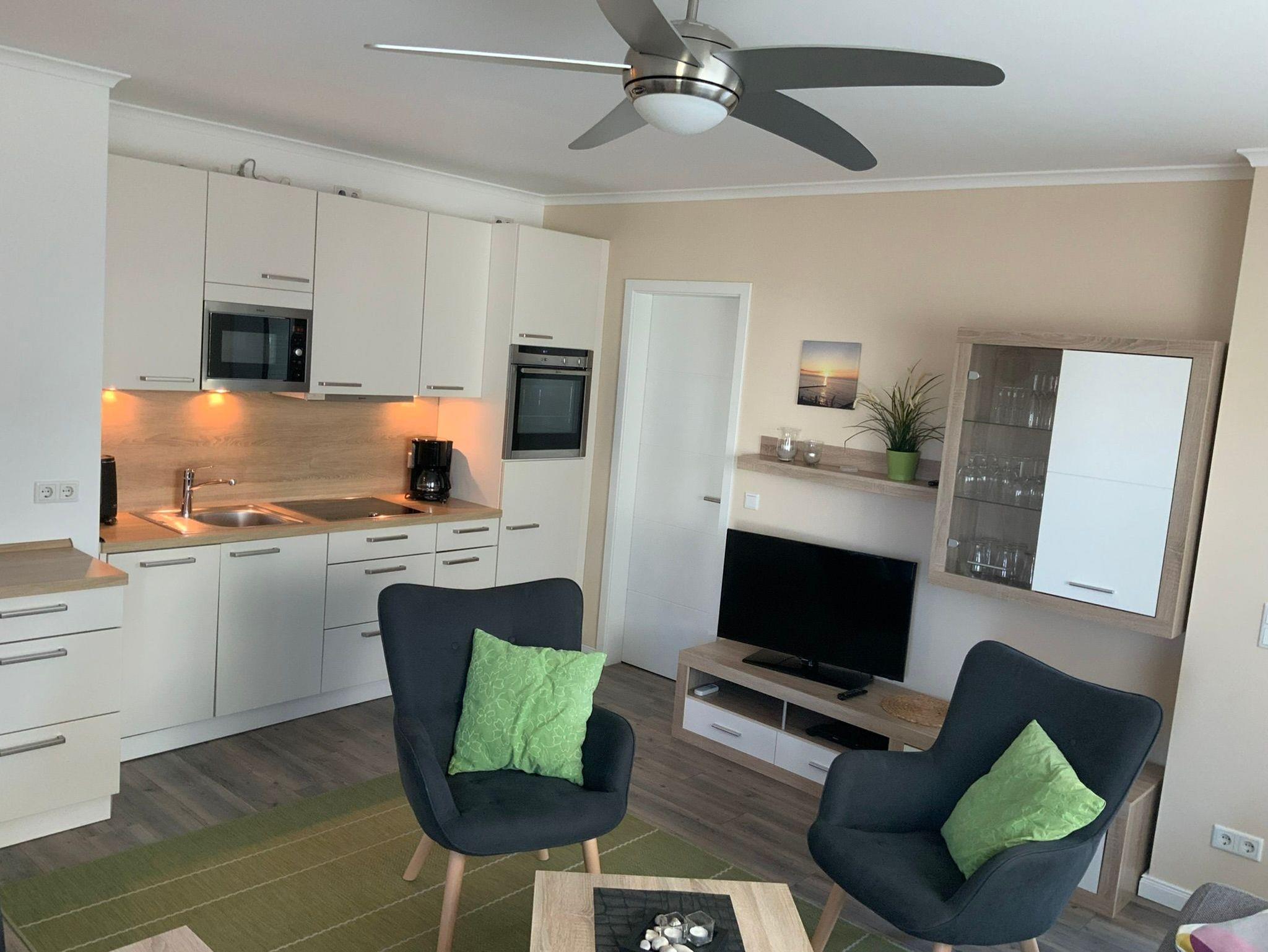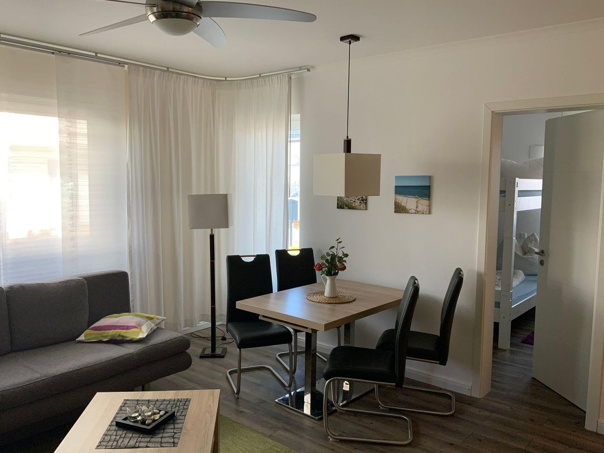 Die großzügige Wohnung ist für vier Erwachsene und einem Kind (bis 12 Jahre) eingerichtet. Im ersten Schlafzimmer finden Sie ein Doppelbett mit einem Schiebetürenschrank. Das zweite Schlafzimmer ist mit einem Etagenbett und Highboard ausgestattet. Im modernen Wohnbereich erwarten Sie eine Schlafcouch sowie zwei Sessel, zur Unterhaltung gibt es einen Flatscreen-TV, Stereoanlage und DVD-Player. Im offenen Koch- und Essbereich finden Sie die Einbauküche und einen Tisch mit sechs Stühlen. Die voll ausgestattete Einbauküche bietet Ihnen alles was Sie für Ihren Aufenthalt benötigen und verfügt über Geschirrspüler, Kühlschrank, Backofen mit Cerankochfeld und Mikrowelle. Vom Wohnraum sowie vom ersten Schlafzimmer gelangen Sie auf die nach Nord-Westen ausgerichtete Terrasse mit sechs bequemen Terrassenstühlen. Das Bad hat eine bodengleiche Dusche, einen Waschtisch mit großem Spiegel und einen Fön. Zusätzlich hat die Wohnung ein separates Gäste-WC.