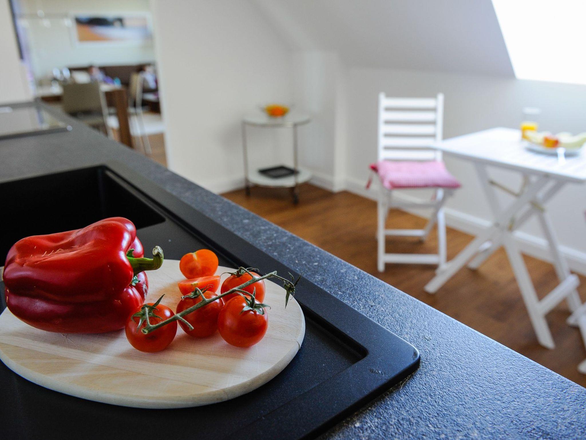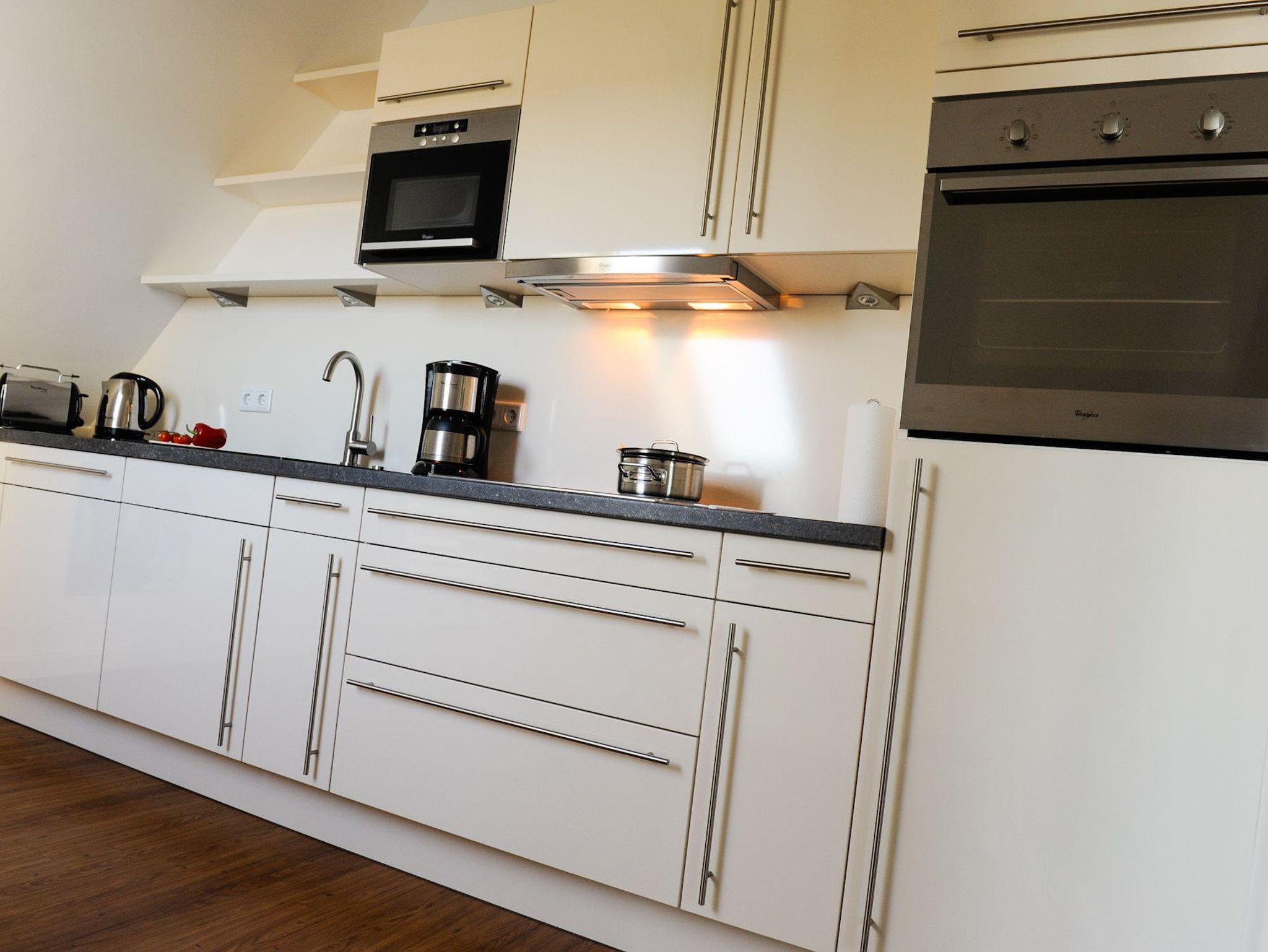 Offene Einbauküche mit Backofen/Herd, Geschirrspüler, Kühlschrank mit Gefrierfach, Kaffeemaschine, Tchibo Cafissimo Kaffeekapselmaschine, Saftpresse, Wasserkocher, Toaster, Mikrowelle