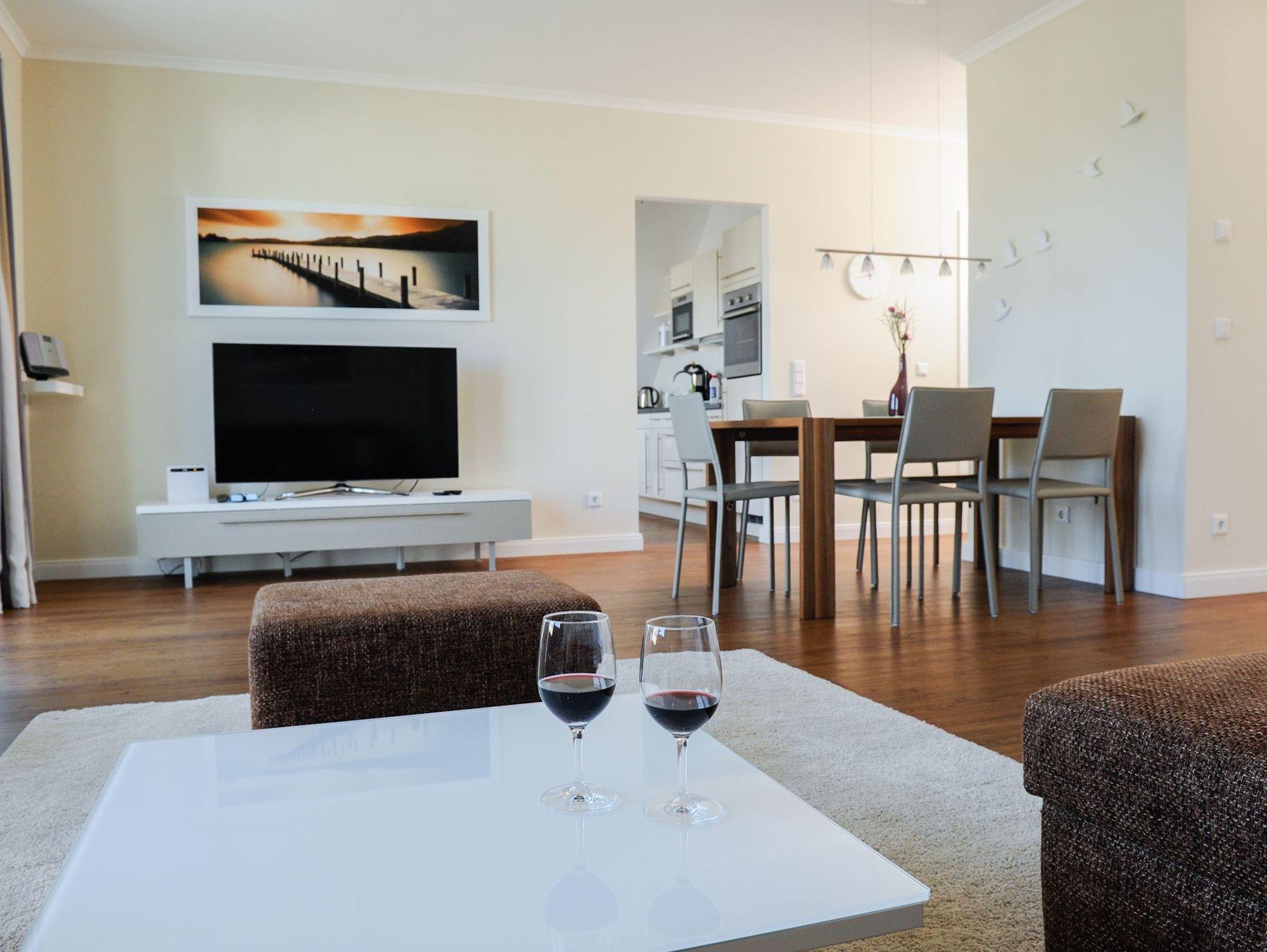Großes Wohn- und Esszimmer mit Zugang zum großen Balkon, Esstisch mit Lederstühlen, Couchgarnitur mit Doppelbettfunktion, großes LED 3D-TV-Gerät (55), Blu-ray Player mit attraktiver 3D-DVD-Sammlung, Radio/Disc-Player, kostenfreiem Internetanschuss, Spielesammlung und vielfältiger Buch- und CD-Auswahl