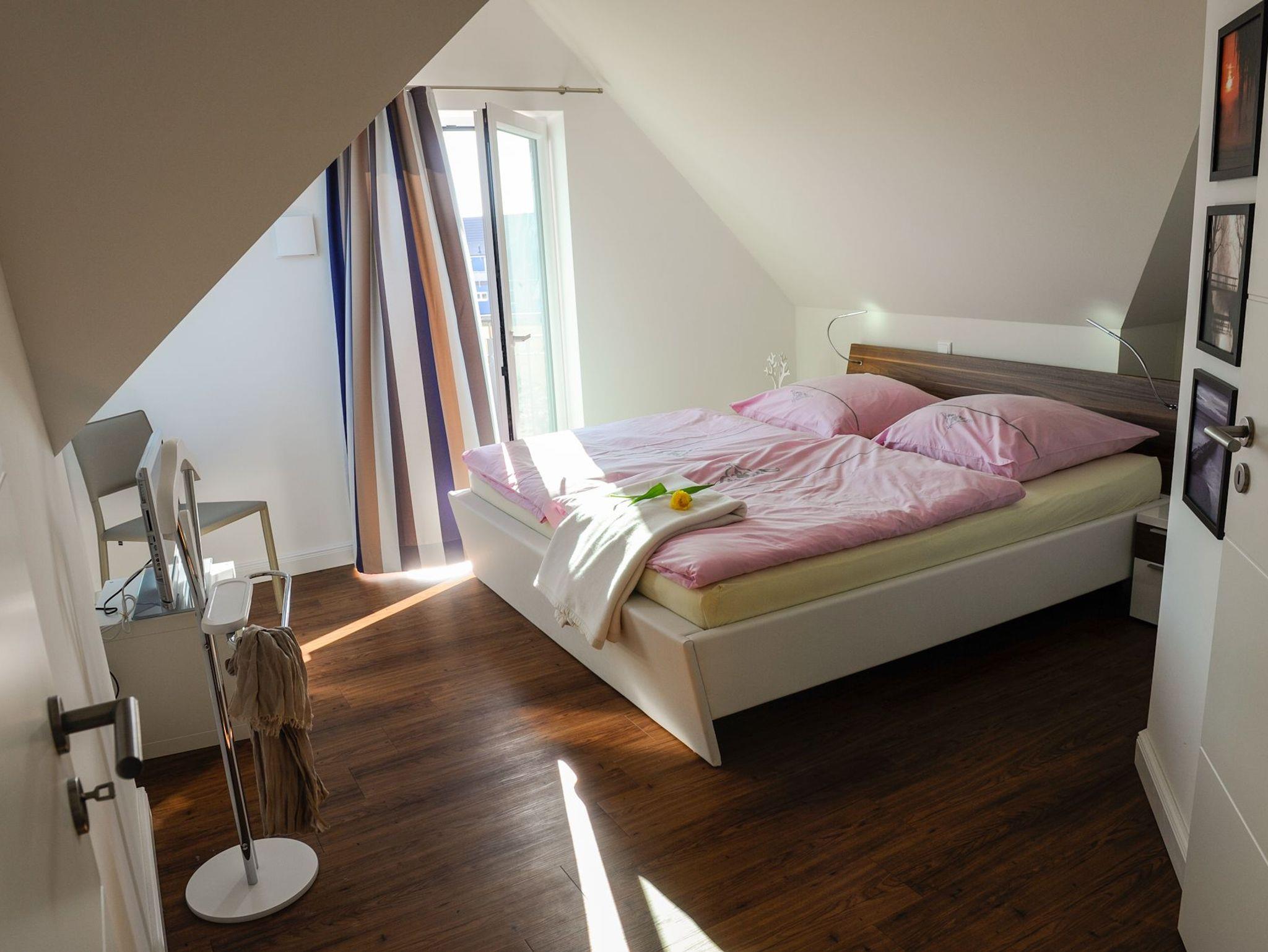 Schlafzimmer 1 mit bequemem Doppelbett, geräumigem Einbauschrank, LCD-TV, kleinem Balkon und eigenem Bad-Zugang