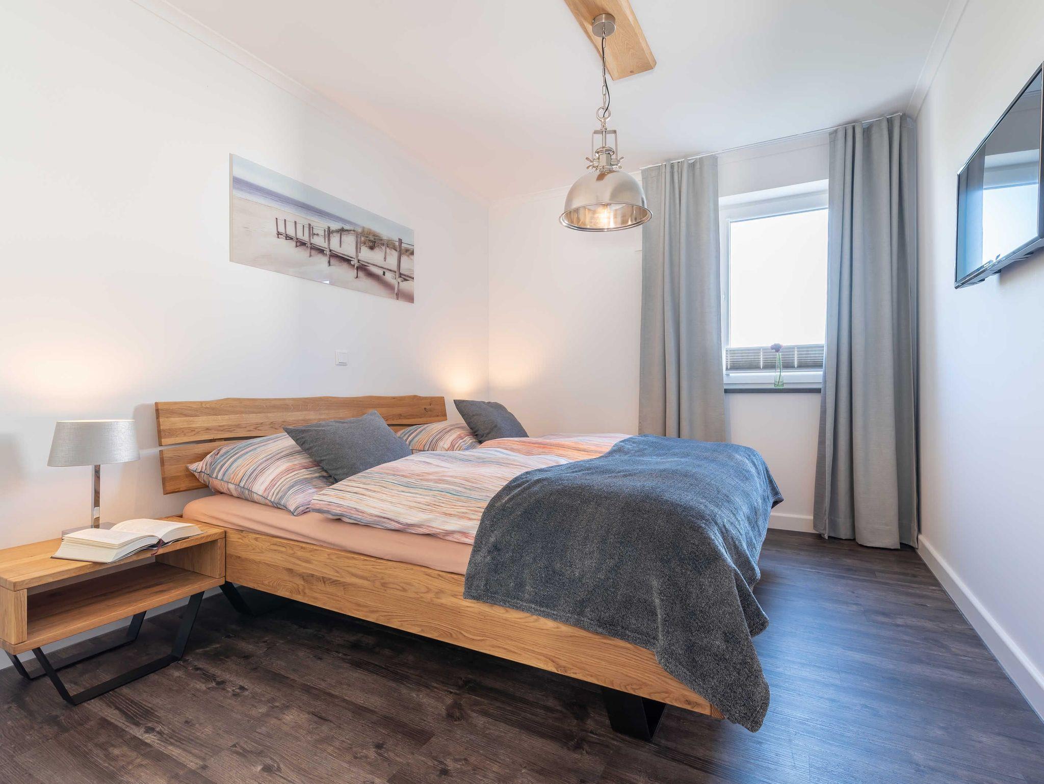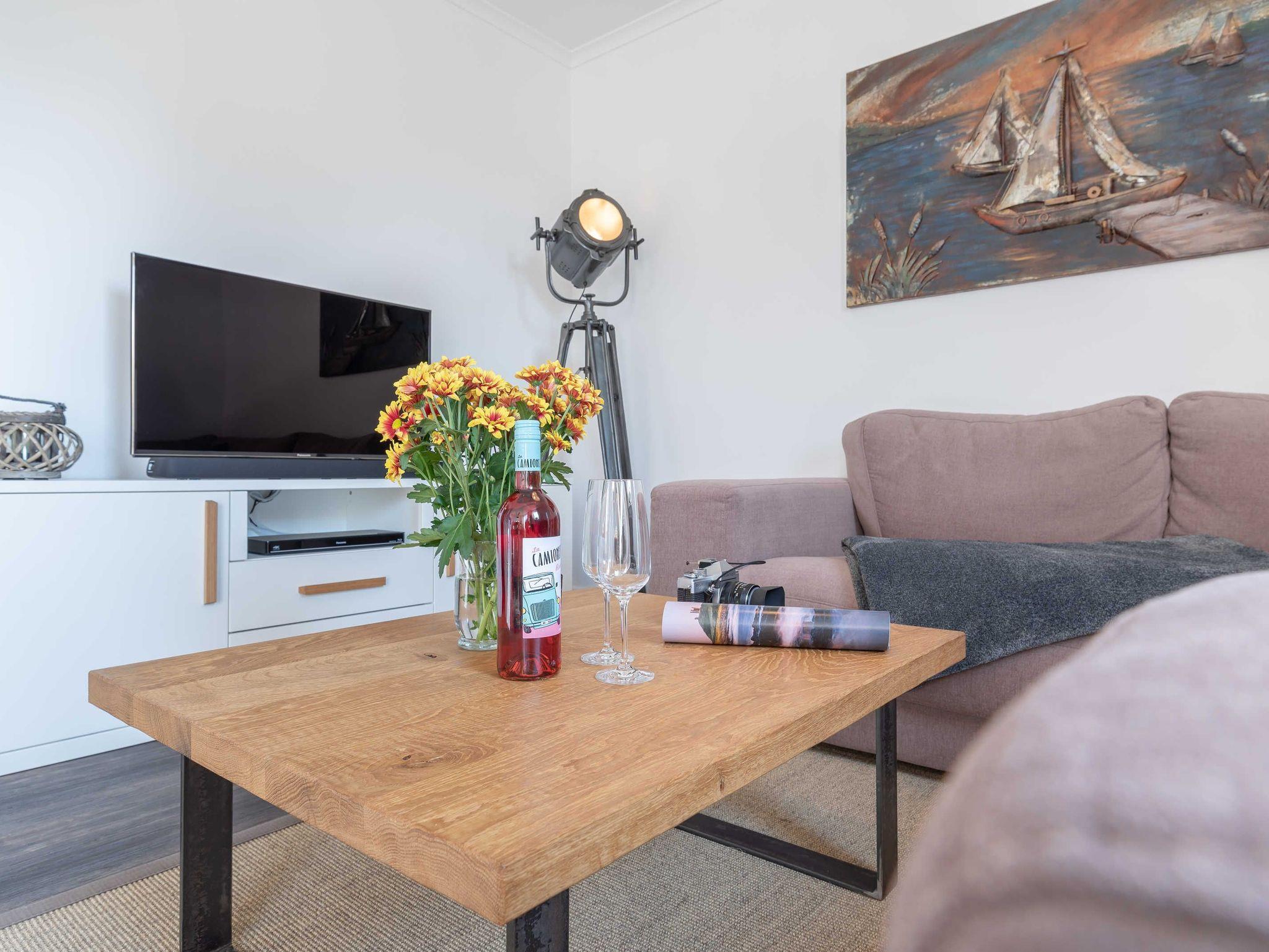 Aus dem einladenden und vor allem funktional eingerichteten Flur haben Sie kurze Wege zu den anderen Räumen. Das liebevoll eingerichtete Wohn- und Esszimmer ist bestens ausgestattet. So verfügt der Küchenbereich über eine große Kühl- und Gefrierkombination (160 l / 57 l), damit mehr als ein Eis für die heißen Tage des Jahres vorgehalten werden kann. Die Mikrowelle ist platzsparend im leicht zu bedienenden Backofen integriert. Abgerundet wird die Küche neben einem großen und vor allem leisen Geschirrspüler durch ein Induktionskochfeld mit passender Dunstabzugshaube. Zum Essen lädt Sie neben dem Balkon (Tisch, 4 Stühle sowie Sonnenschirm) auch der große Esstisch (1,80 m x 1,00 m) ein. Dieser eignet sich hervorragend, um den Abend im Kreise der Familie mit Gesellschaftsspielen ausklingen zu lassen. Abgerundet wird der Wohnbereich durch eine hochwertige Eckcouch, welche extra so ausgesucht wurde, dass alle Urlaubsgäste unserer Ferienwohnung „Treibholz“ ihren Platz finden. Man wird in ihr versinken und die Beine kann man getrost austrecken. So darf ein Urlaubstag gerne enden! Im Bereich der Unterhaltungselektronik haben wir darauf geachtet, dass Sie alle modernen Medien vollumfänglich mittels WLAN nutzen können. Der Flatscreen-TV verfügt ferner über eine Radiofunktion. Weiterhin stehen Ihnen ein DVD-Player und eine Soundbar zur Verfügung. Letztere können Sie auch per Bluetooth mit Ihrem Endgerät verbinden.