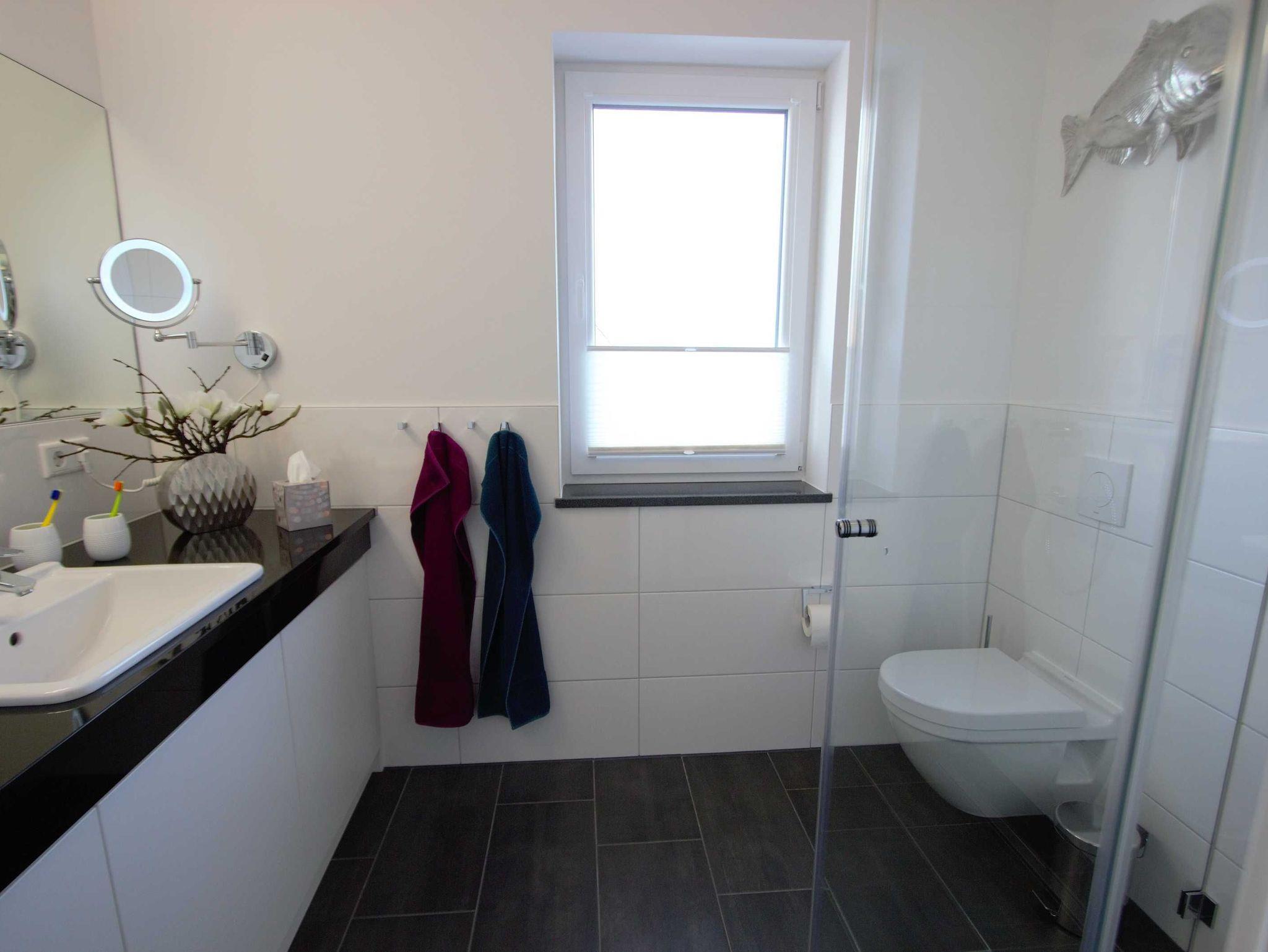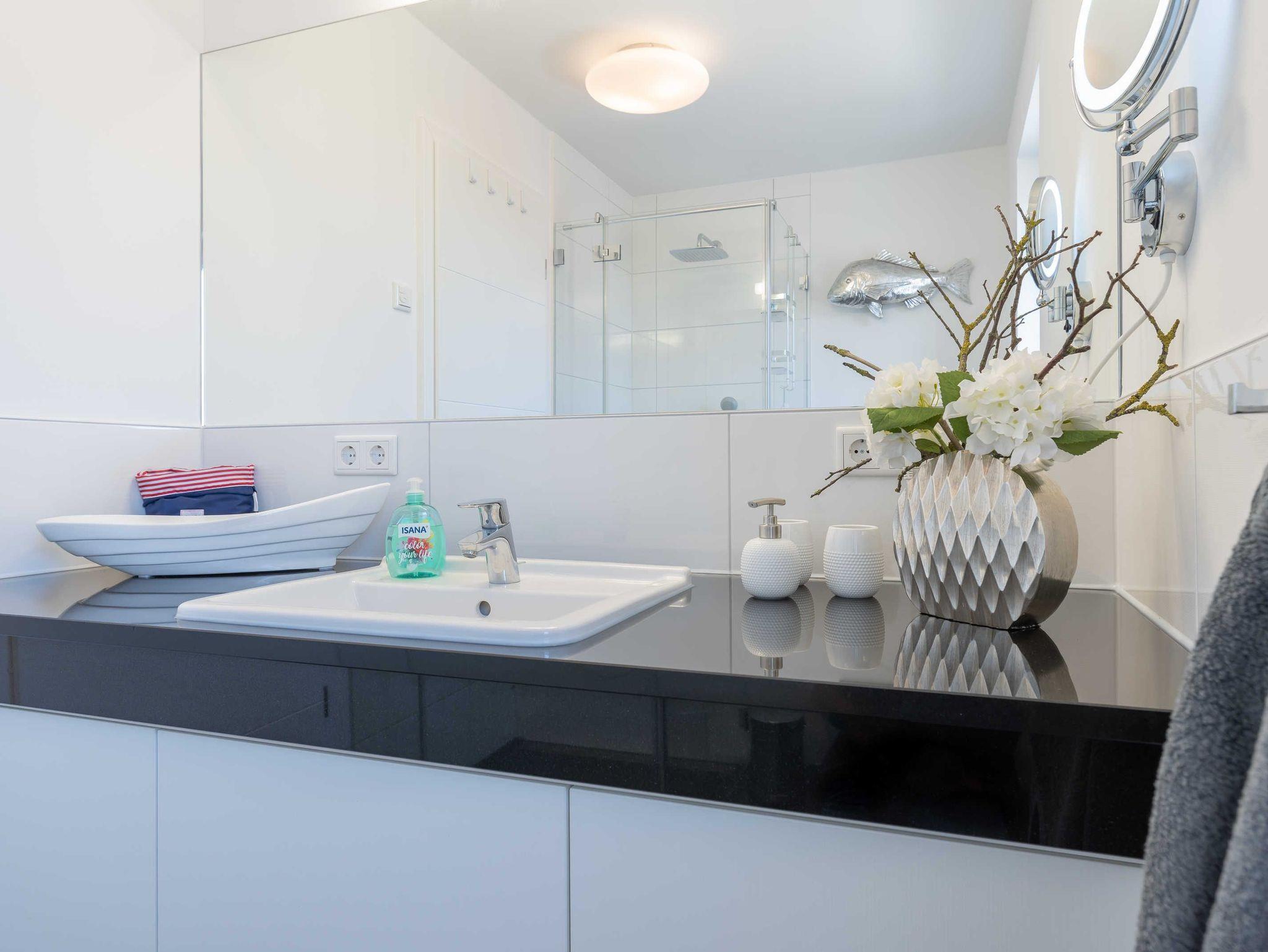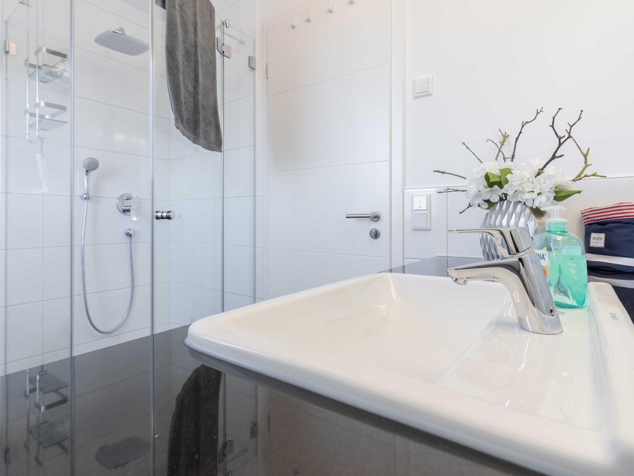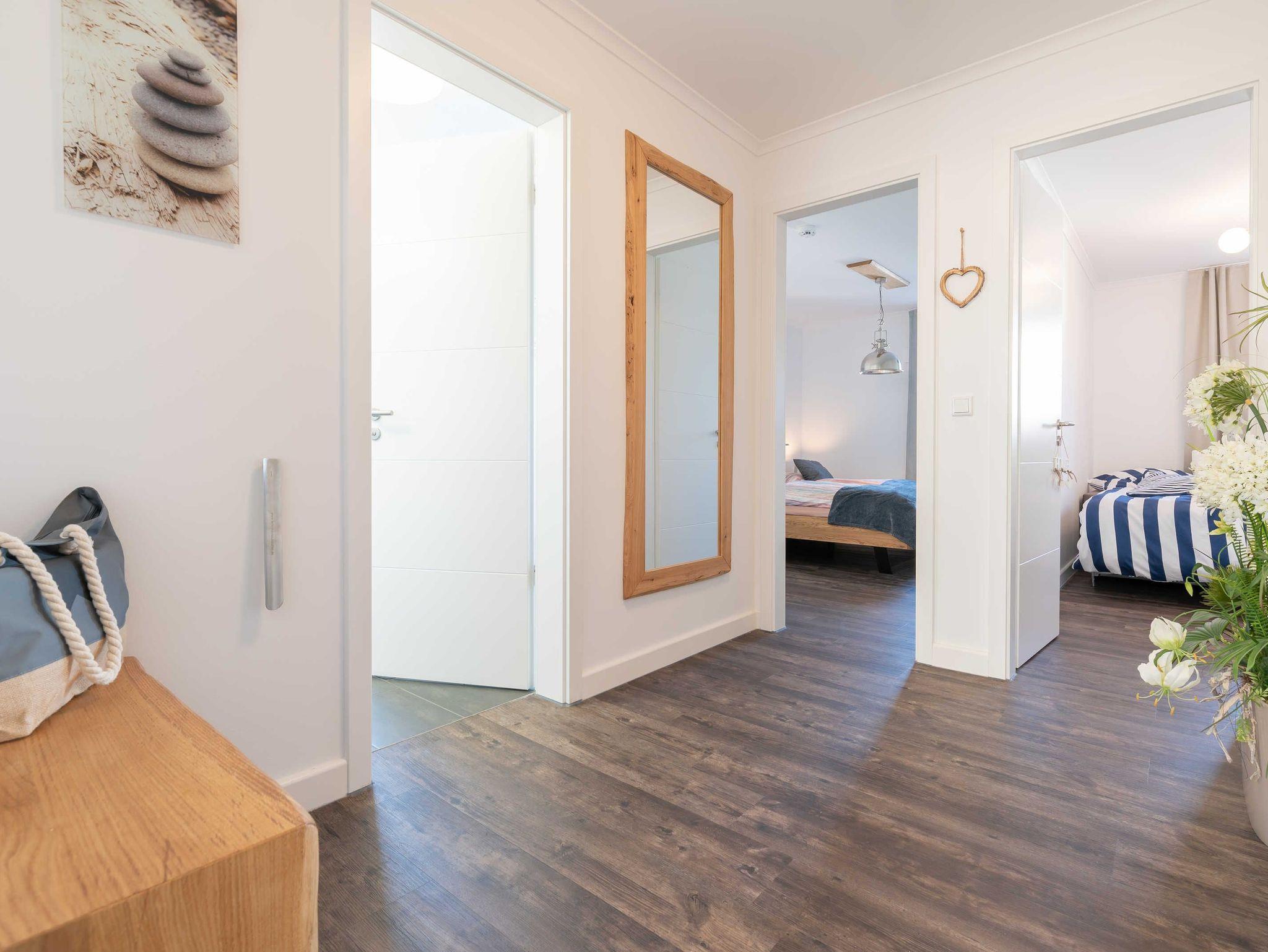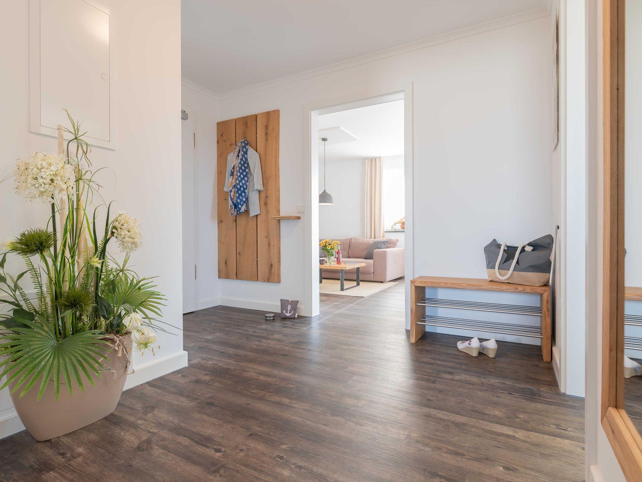 Aus dem einladenden und vor allem funktional eingerichteten Flur haben Sie kurze Wege zu den anderen Räumen. Das liebevoll eingerichtete Wohn- und Esszimmer ist bestens ausgestattet. So verfügt der Küchenbereich über eine große Kühl- und Gefrierkombination (160 l / 57 l), damit mehr als ein Eis für die heißen Tage des Jahres vorgehalten werden kann. Die Mikrowelle ist platzsparend im leicht zu bedienenden Backofen integriert. Abgerundet wird die Küche neben einem großen und vor allem leisen Geschirrspüler durch ein Induktionskochfeld mit passender Dunstabzugshaube. Zum Essen lädt Sie neben dem Balkon (Tisch, 4 Stühle sowie Sonnenschirm) auch der große Esstisch (1,80 m x 1,00 m) ein. Dieser eignet sich hervorragend, um den Abend im Kreise der Familie mit Gesellschaftsspielen ausklingen zu lassen. Abgerundet wird der Wohnbereich durch eine hochwertige Eckcouch, welche extra so ausgesucht wurde, dass alle Urlaubsgäste unserer Ferienwohnung ?Treibholz? ihren Platz finden. Man wird in ihr versinken und die Beine kann man getrost austrecken. So darf ein Urlaubstag gerne enden! Im Bereich der Unterhaltungselektronik haben wir darauf geachtet, dass Sie alle modernen Medien vollumfänglich mittels WLAN nutzen können. Der Flatscreen-TV verfügt ferner über eine Radiofunktion. Weiterhin stehen Ihnen ein DVD-Player und eine Soundbar zur Verfügung. Letztere können Sie auch per Bluetooth mit Ihrem Endgerät verbinden.