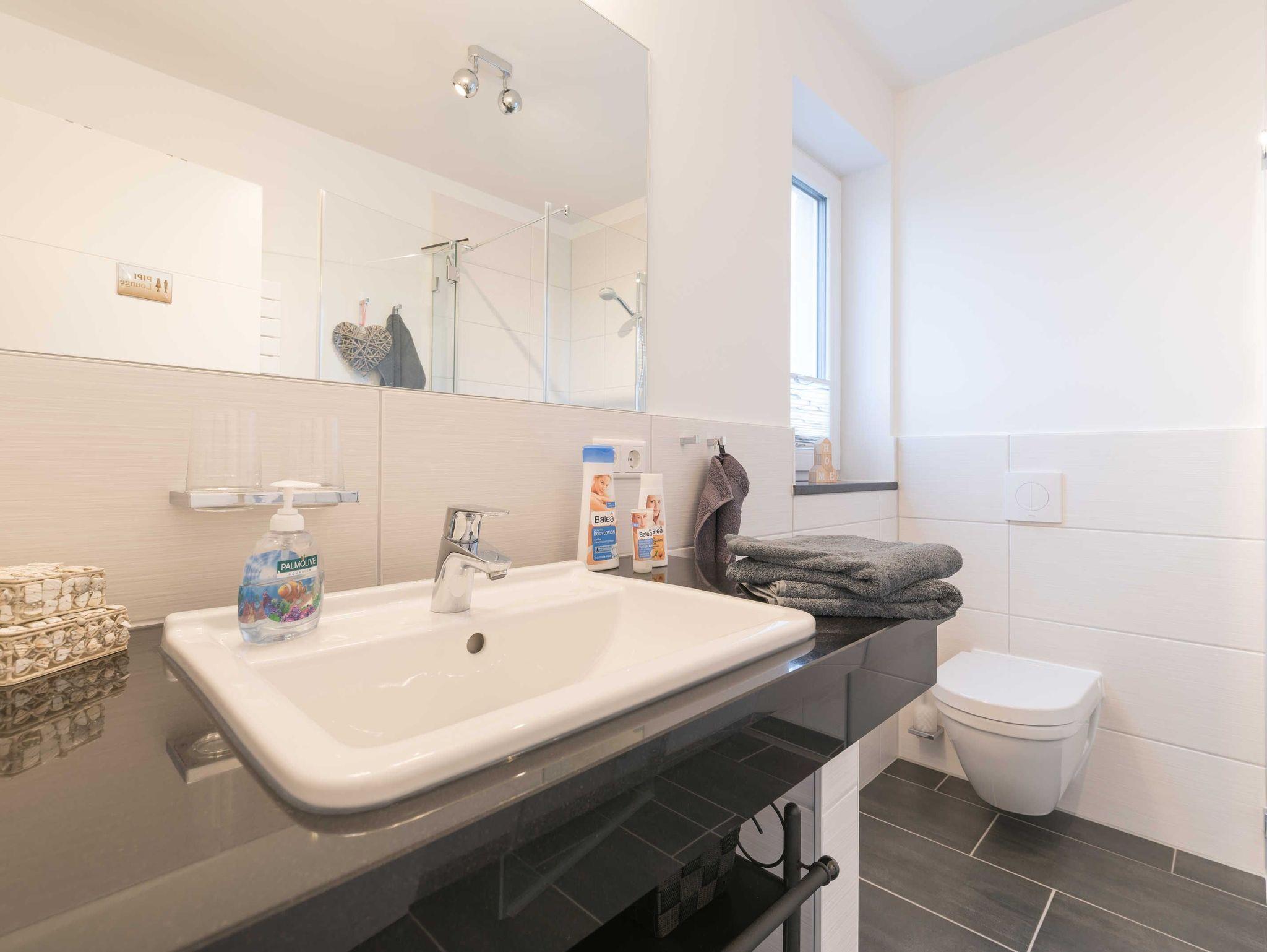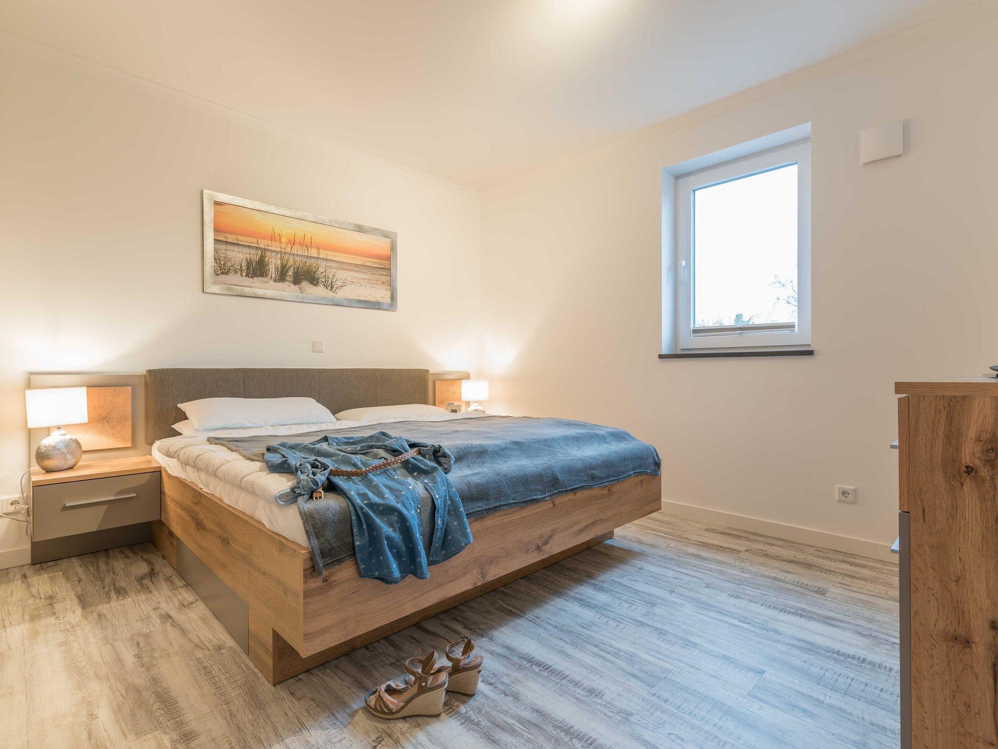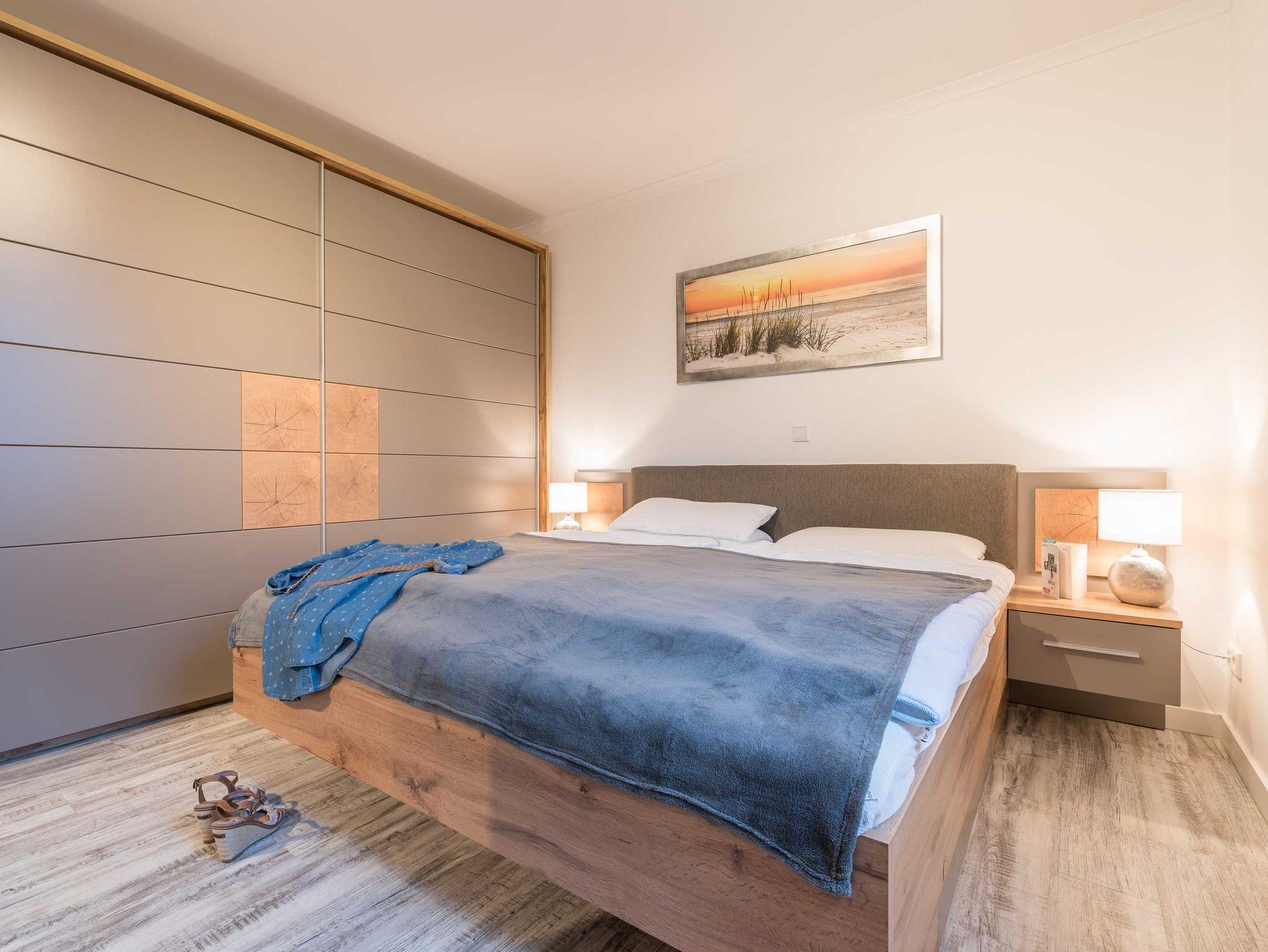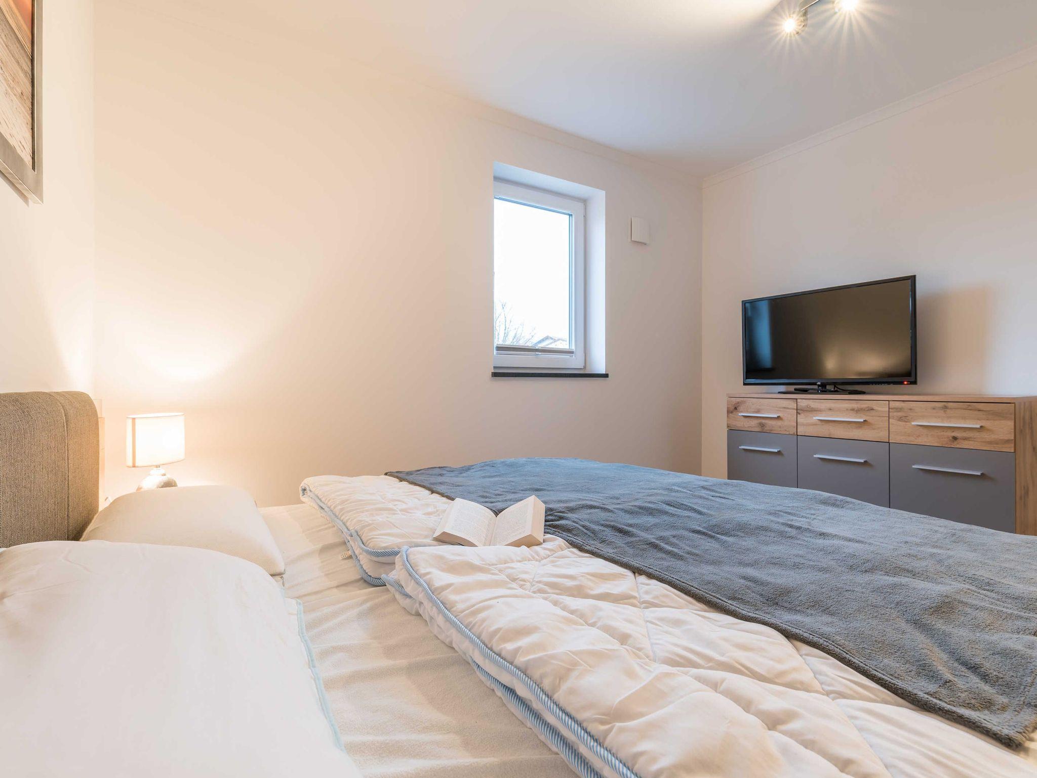 Im Schlafzimmer erwartet Sie ein komfortables Doppelbett (180 × 200 cm, zwei Matratzen) sowie ein weiterer 50?Zoll?Flat?TV. Das helle Bad überzeugt mit bodengleicher Dusche, großzügigem Waschtisch, großem Spiegel, WC und Handtuchwärmer. Ein kleiner Abstellraum bietet zusätzlichen Platz für Ihr Gepäck.