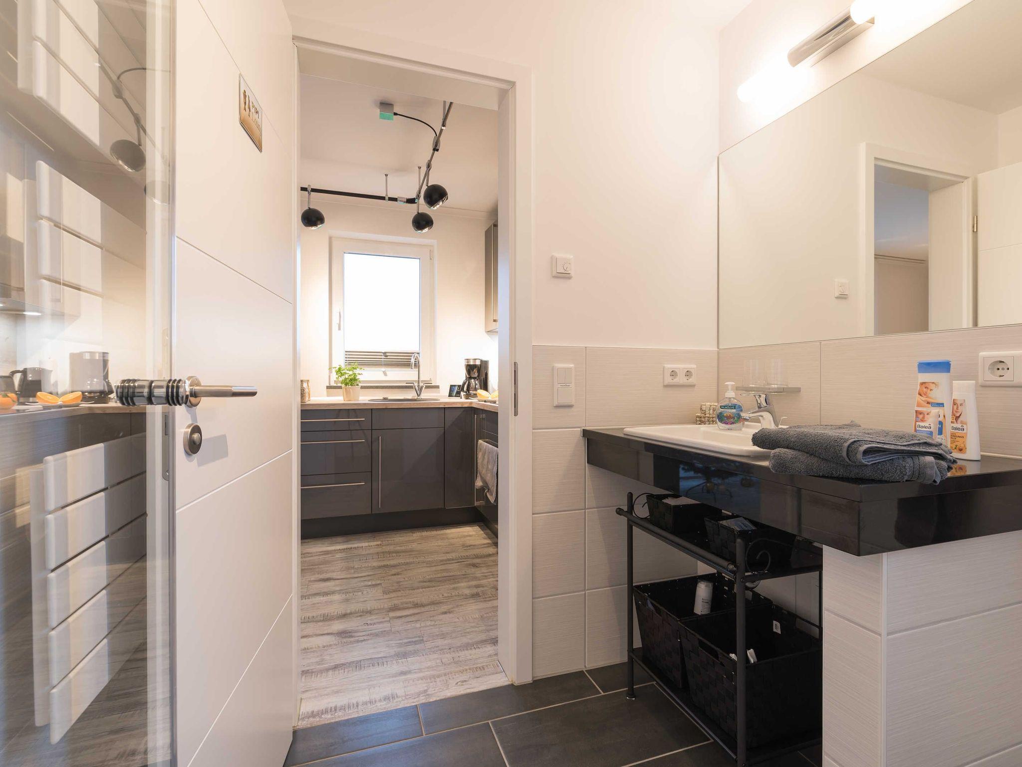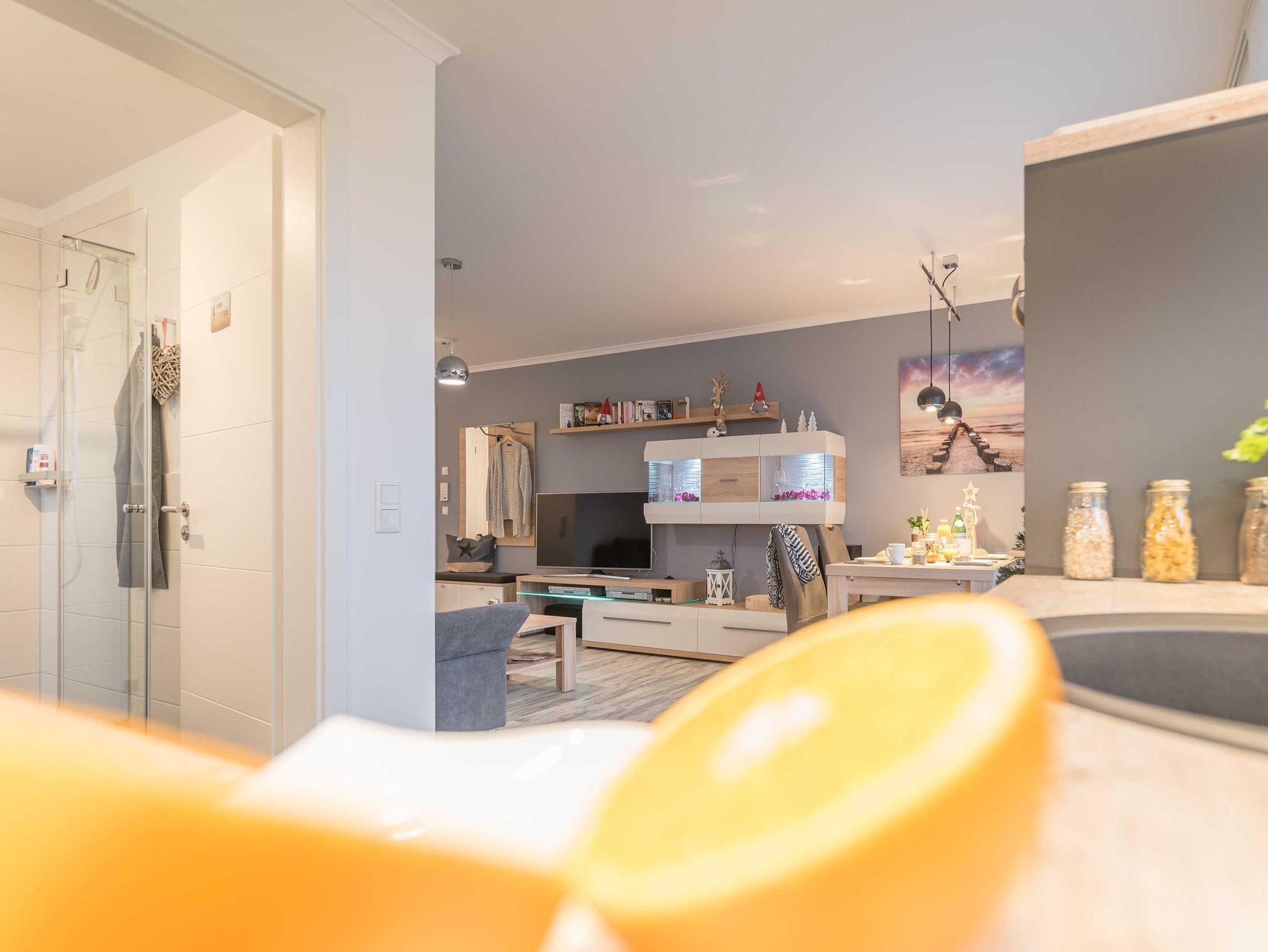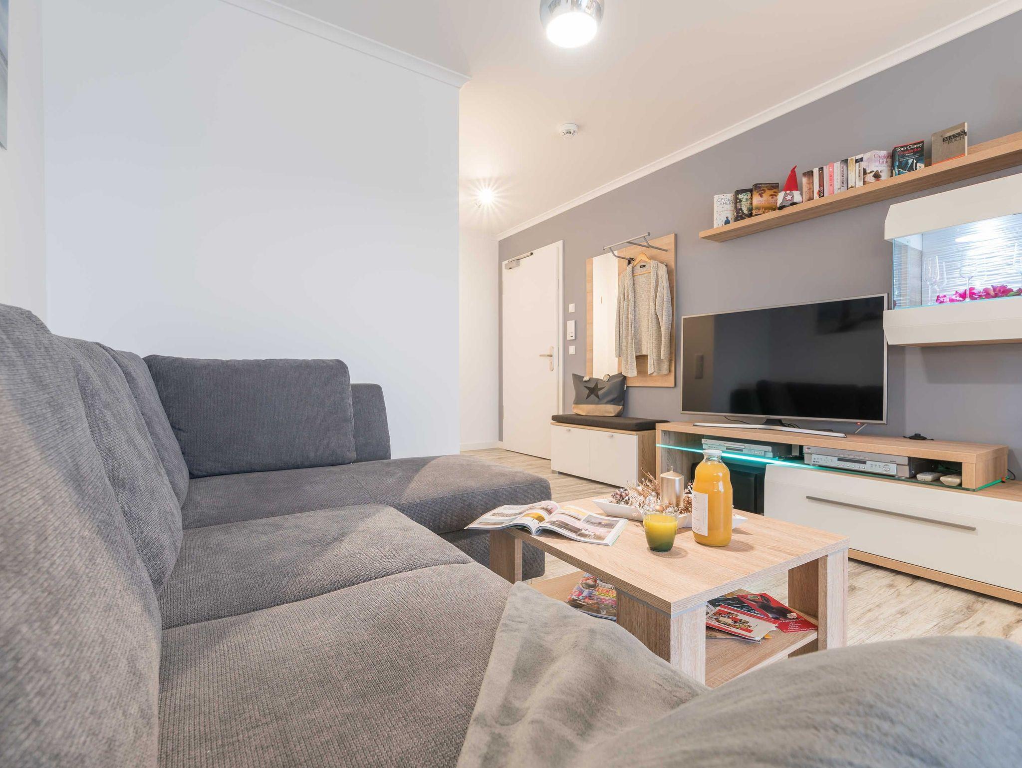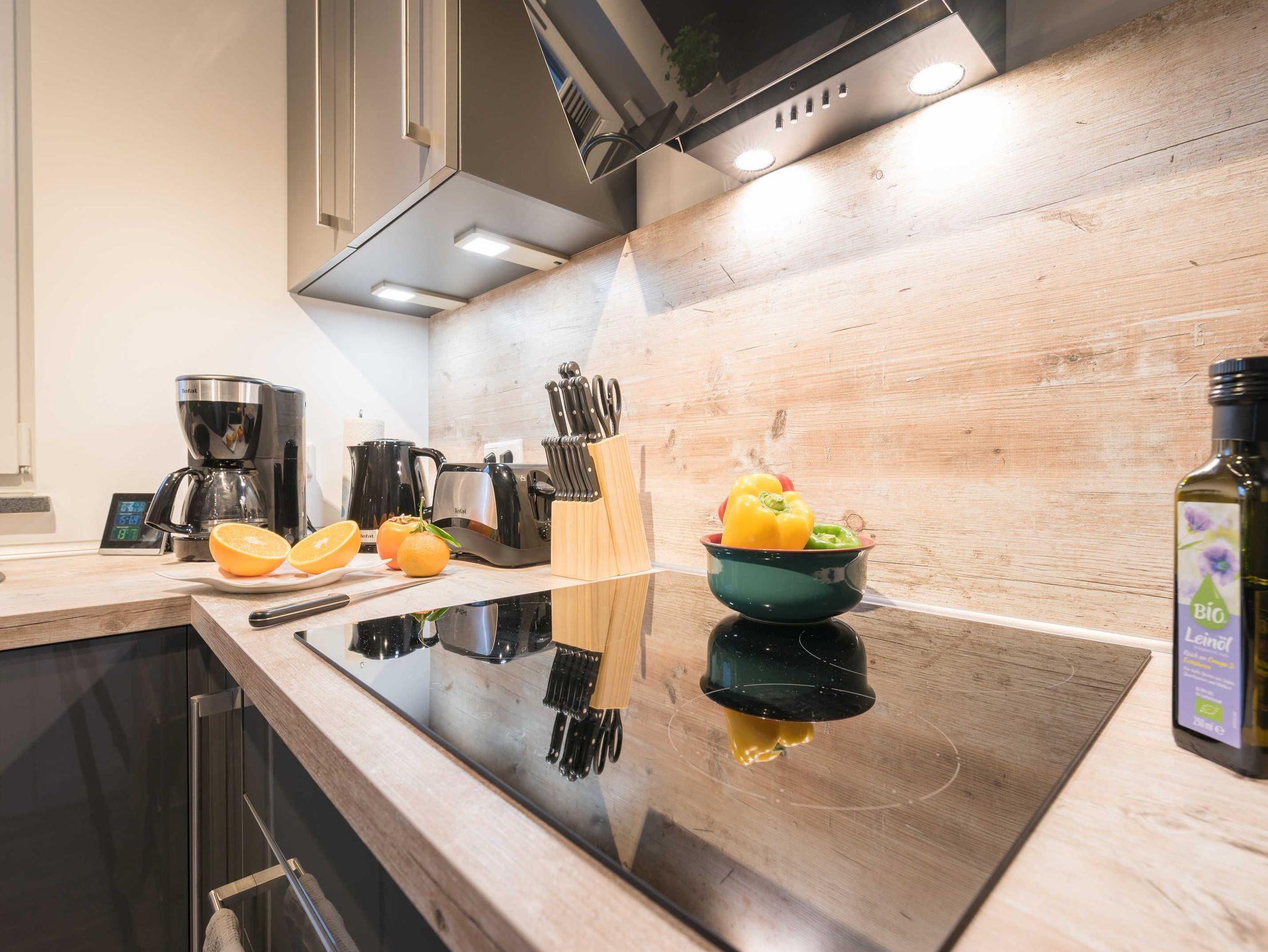 Der Wohnbereich lädt mit seinem gemütlichen Sofa, einem 50?Zoll?Flat?TV, Blu?Ray?Player und einer kleinen Musikanlage zu entspannten Stunden ein. In der offenen, hochwertigen Einbauküche finden Sie alles, was das Herz begehrt: Induktionskochfeld, Geschirrspüler, Mikrowelle, Kühl?Gefrierkombination, hochgebauten Backofen, Kaffeemaschine, Toaster und Wasserkocher. Der große Esstisch mit vier bequemen Stühlen bietet Platz für gemeinsame Mahlzeiten oder gesellige Spieleabende.