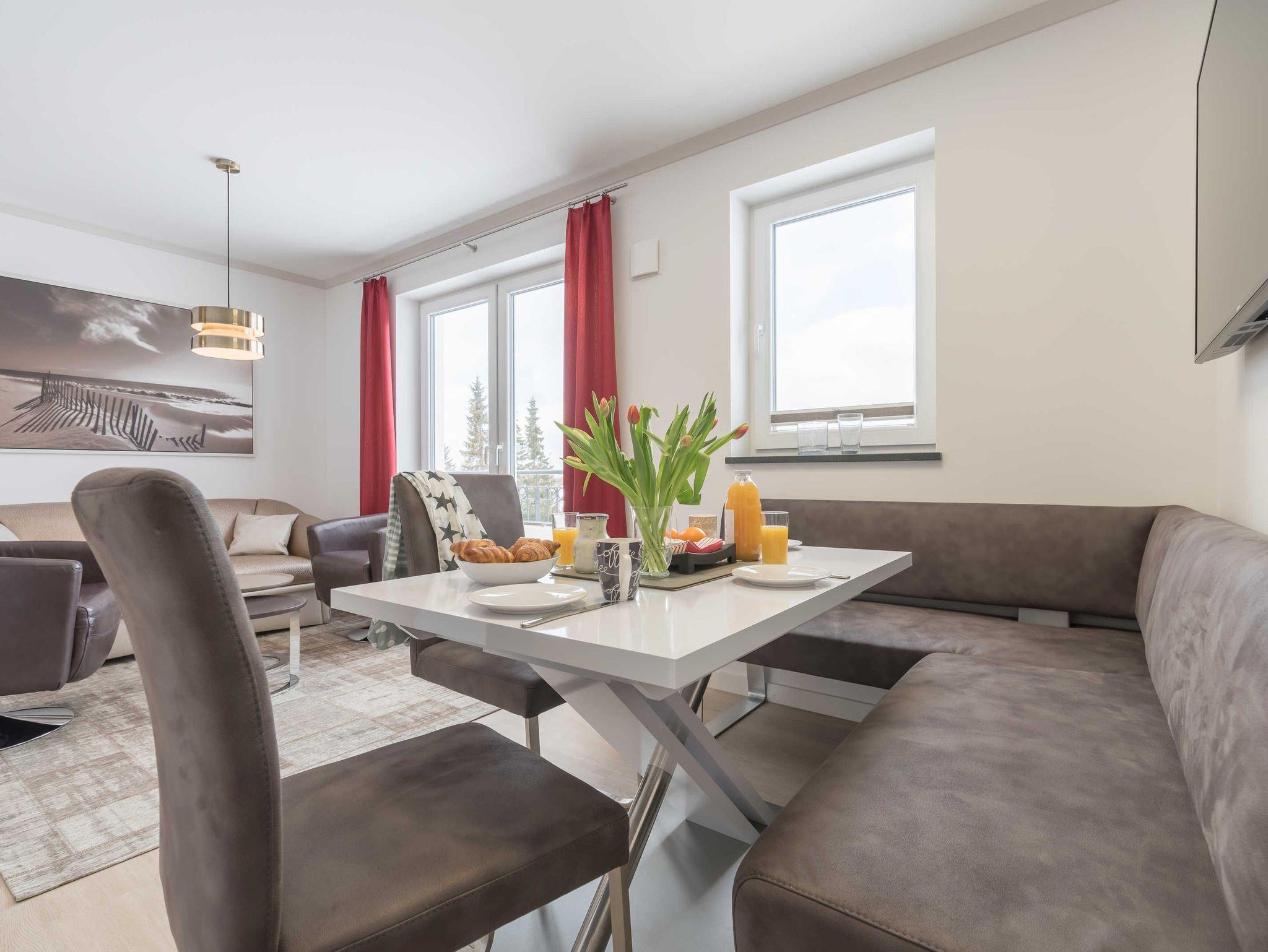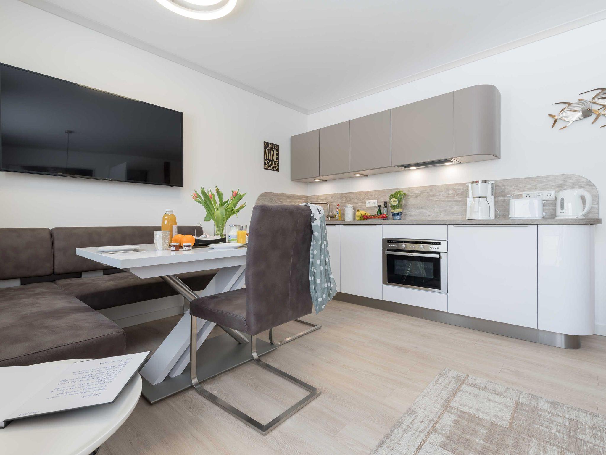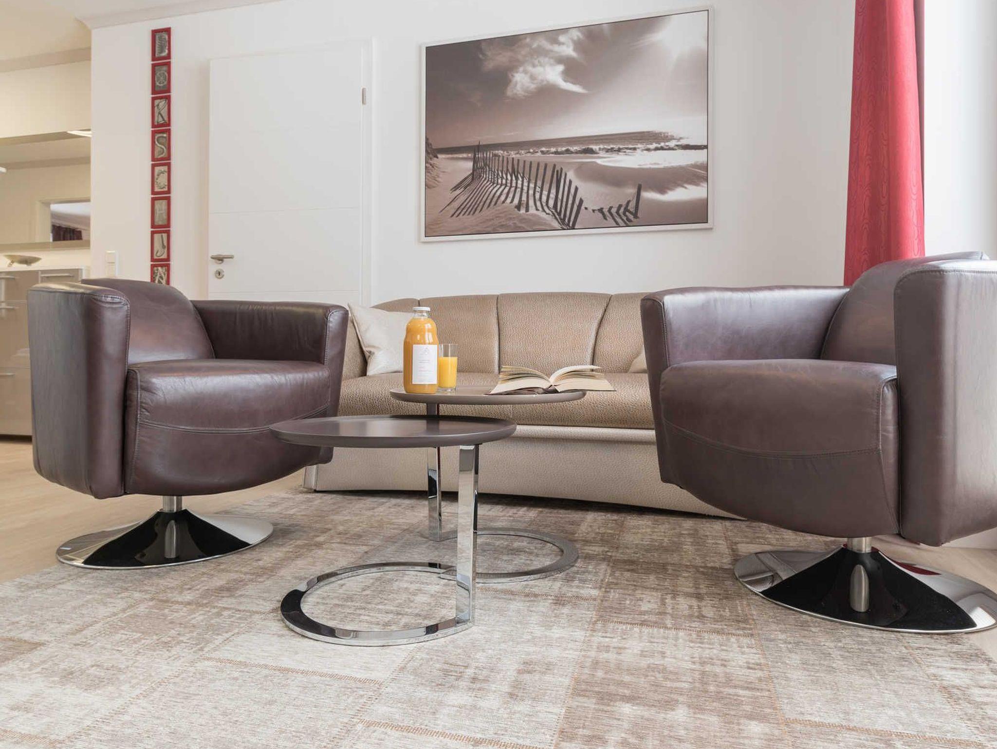 Im liebevoll eingerichteten Wohnbereich finden Sie ein kleines Sofa (Zweisitzer) und zwei gemütliche Drehsessel. Ein großer Flat Screen-TV ist an der gegenüberliegenden Wand befestigt.
