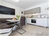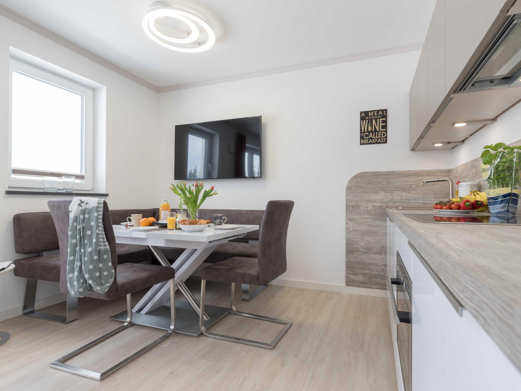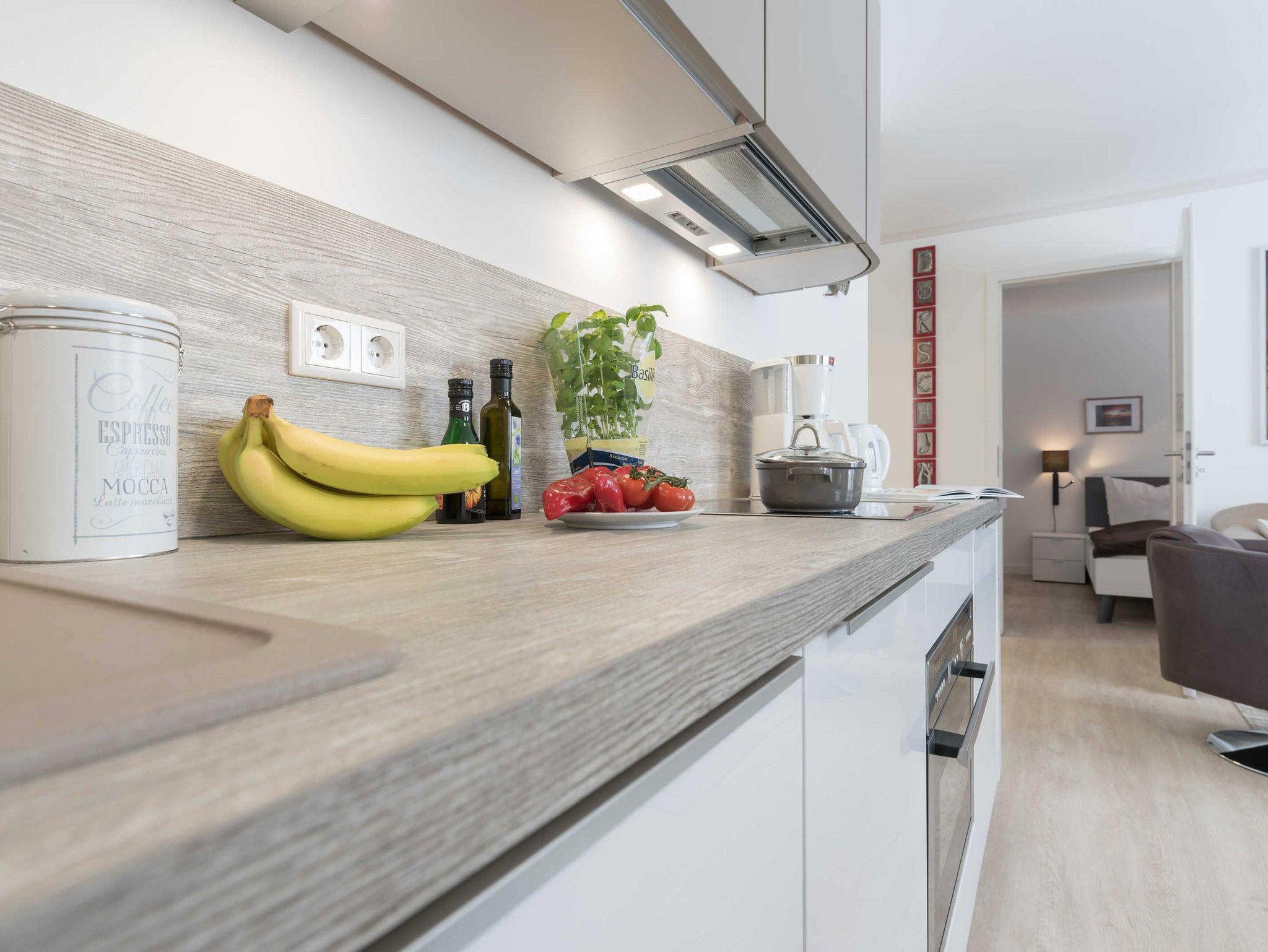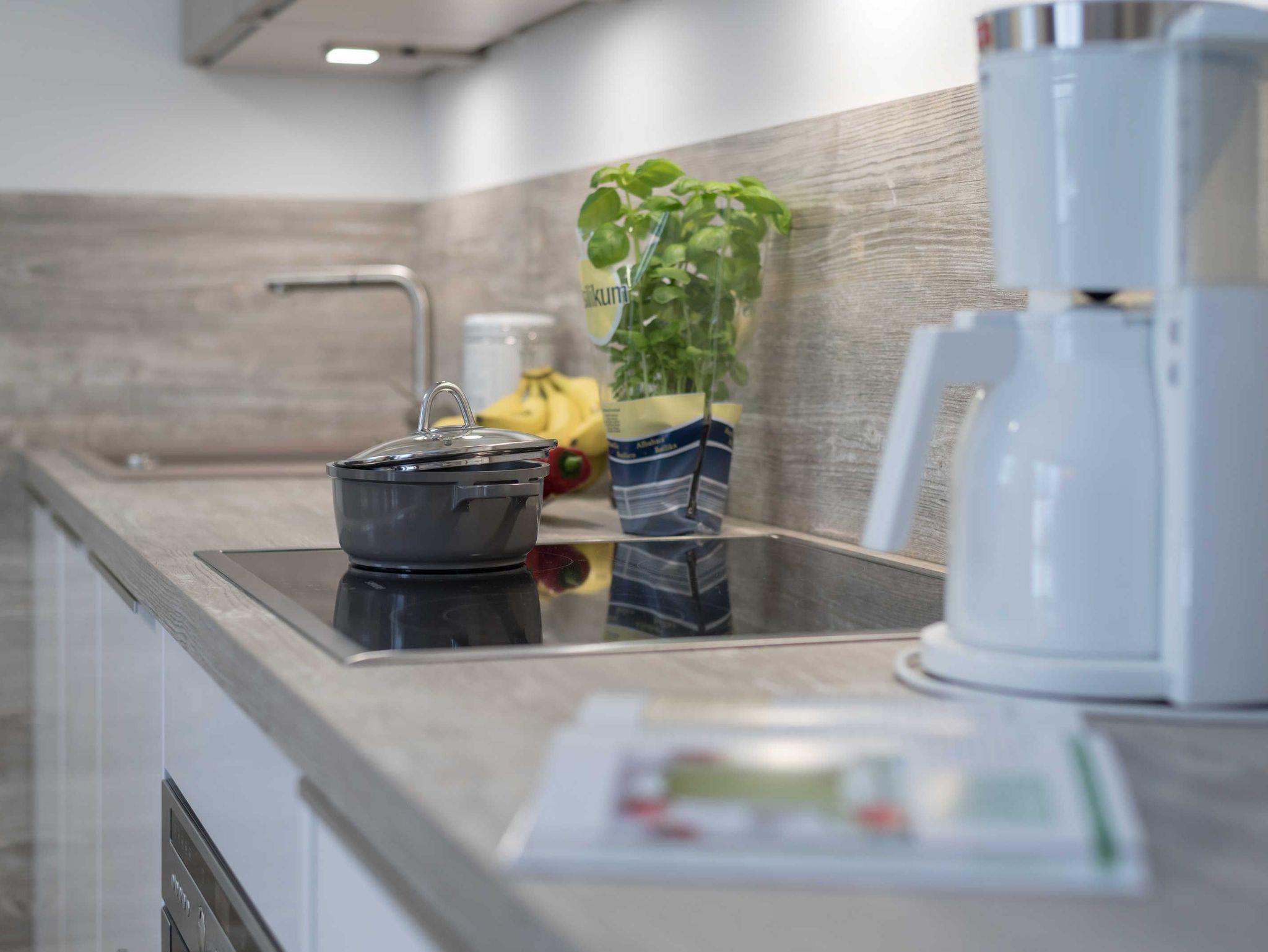 Im offenen Koch- und Essbereich finden Sie eine Einbauküche sowie eine Eckbank mit Tisch (ausziehbar) und zwei Stühlen. Diese gemütliche Sitzecke eignet sich auch hervorragend um den Abend im Kreise der Familie mit Gesellschaftsspielen ausklingen zu lassen. Die voll ausgestattete Einbauküche mit Mikrowelle (im Backofen integriert), Cerankochfeld, Geschirrspüler und Kühlschrank (mit kleinem Gefrierfach) lässt keine Wünsche offen.