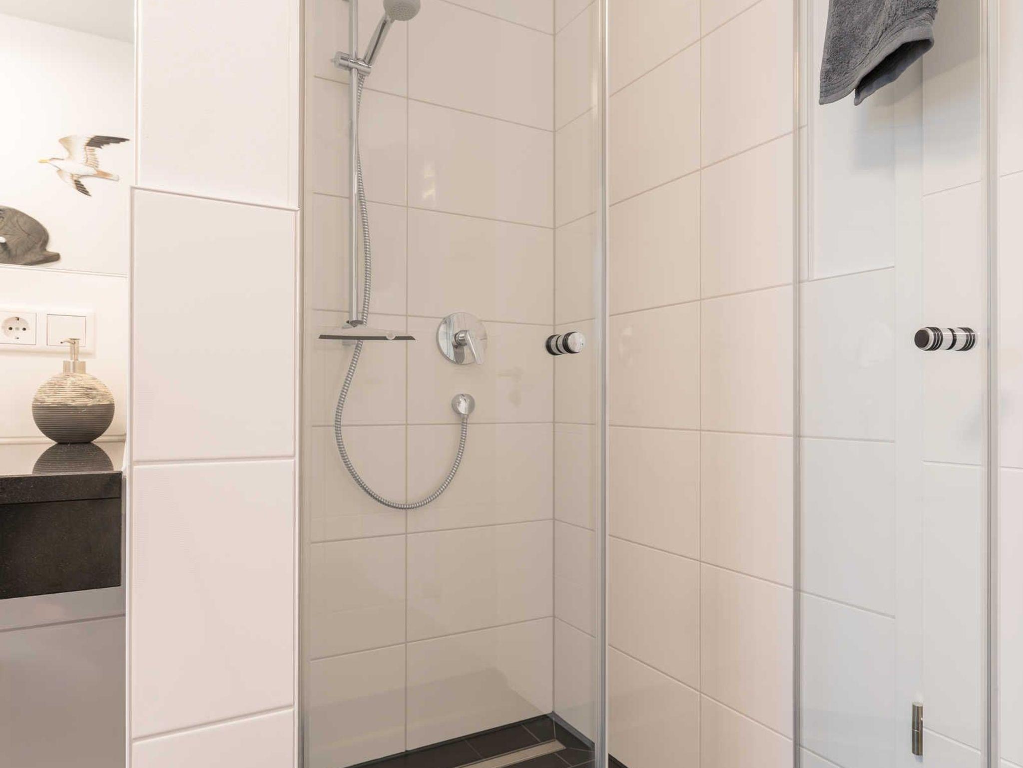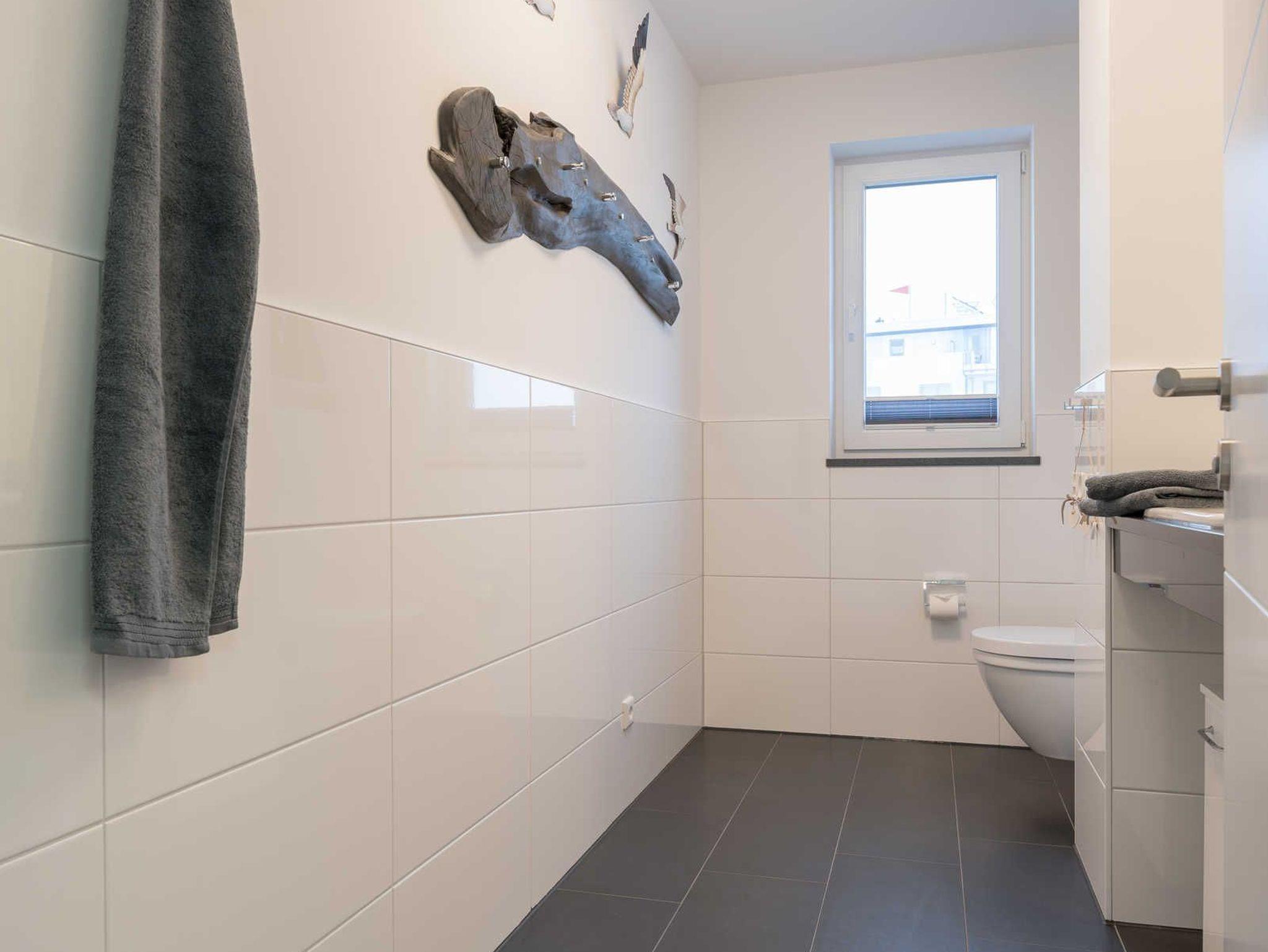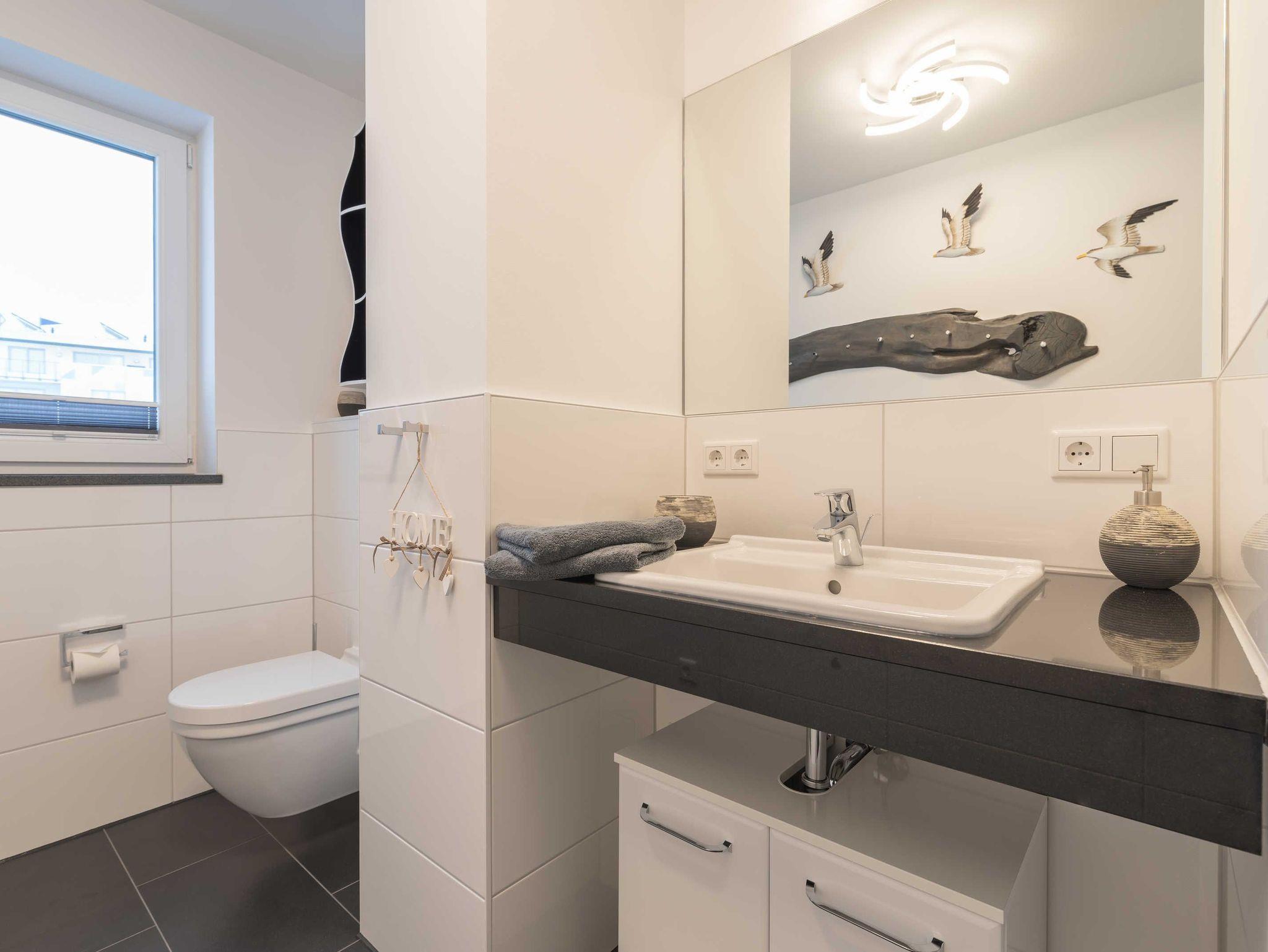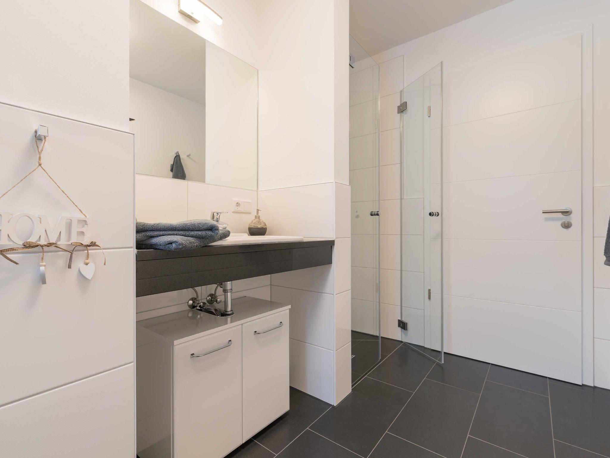 Das Bad ist mit einer ebenerdigen Dusche, einem beleuchteten Wandspiegel und einem Waschtisch samt Unterschrank ausgestattet. Das Badfenster hat ebenfalls ein Fliegengitter.