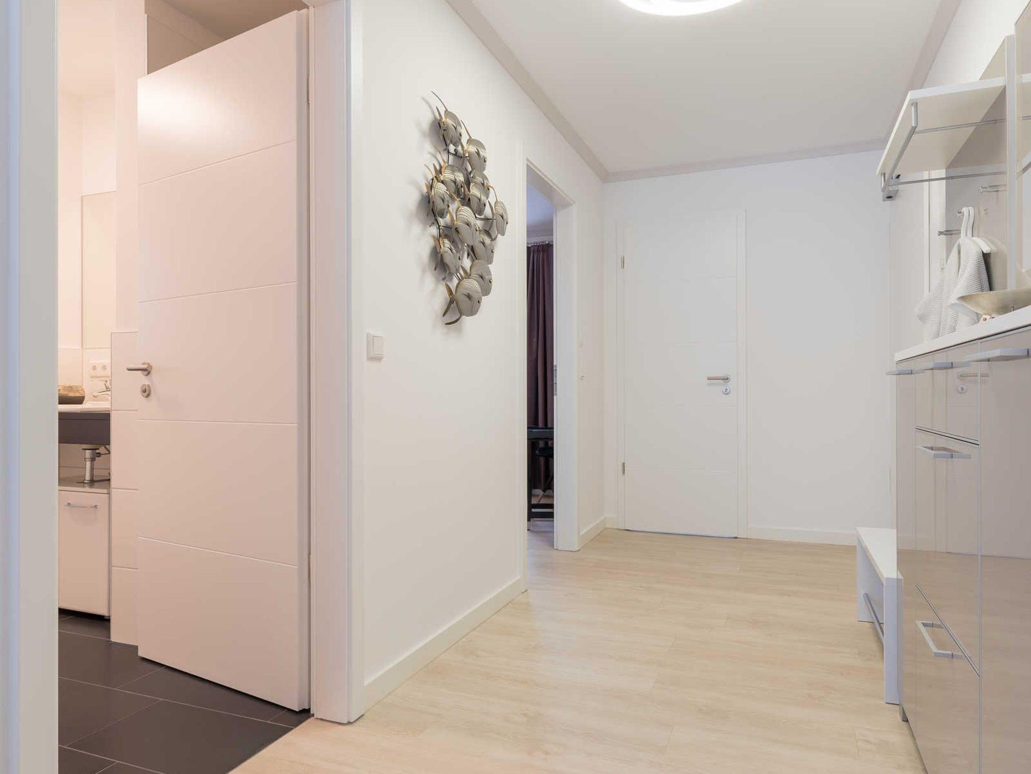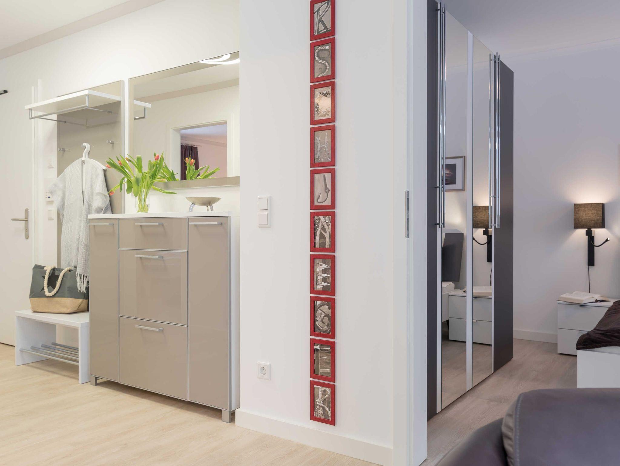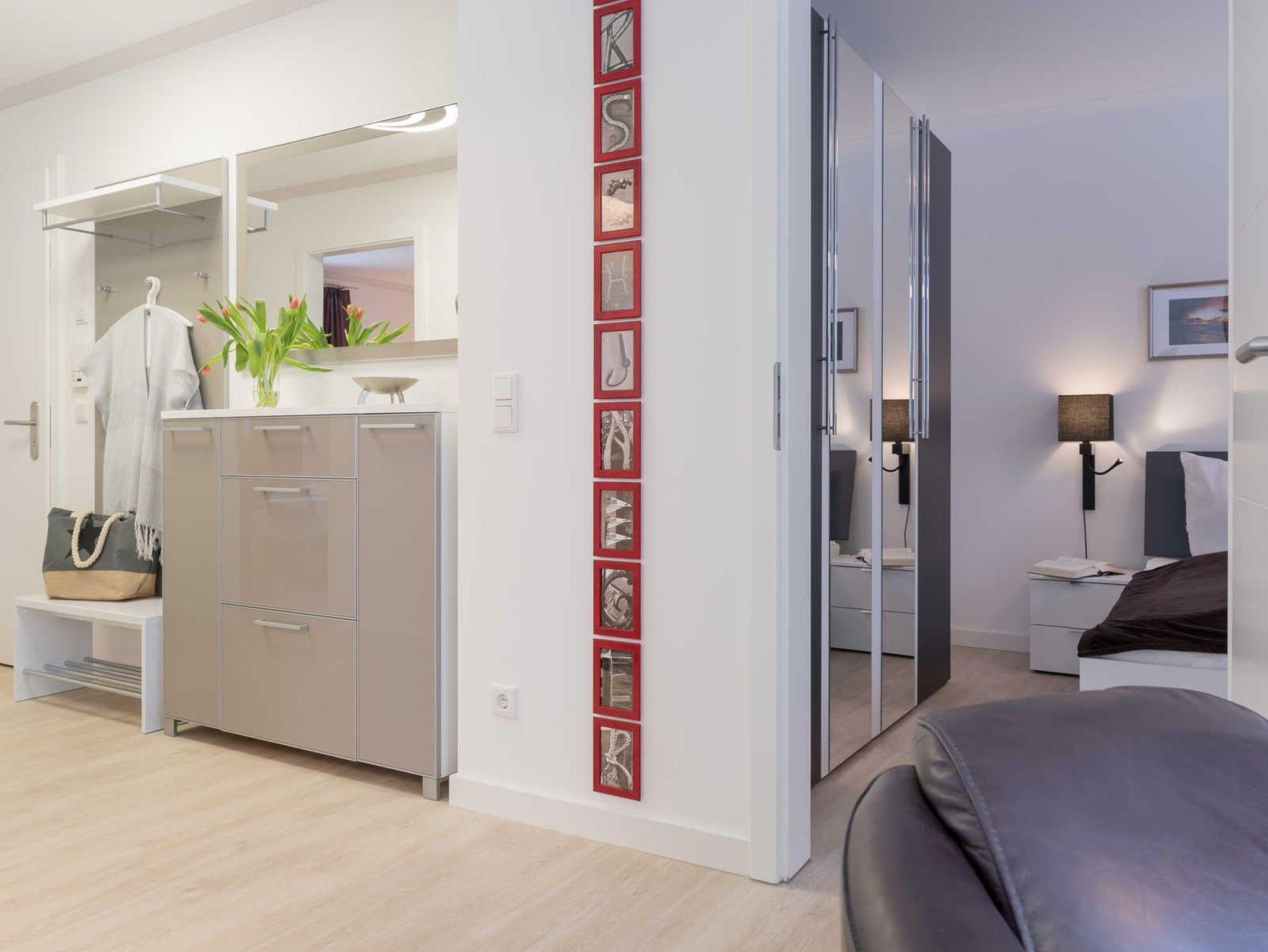 In dem geräumigen Flur steht neben der Garderobe ein Schrank mit einer kleinen Auswahl an Büchern und Spielen.
