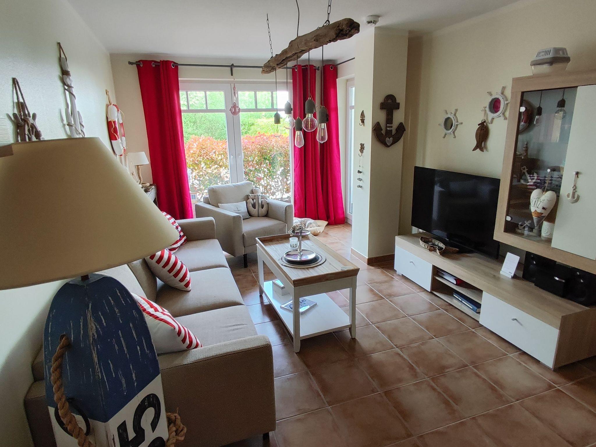 Im Wohnzimmer empfängt Sie eine gemütliche Leseecke mit Flat-TV. Der Fernseher ermöglicht Ihnen Streamingdienste mit vielen vor eingestellten Diensten. Am hölzernen Essplatz finden vier Personen Platz für gemeinsame Mahlzeiten und gesellige Spieleabende. Die offene Küche ist voll ausgestattet mit Herd, Backofen, Kühlschrank, einem separaten großen Gefrierschrank, mit dem Sie sich sehr gut selbst versorgen können, Mikrowelle, Geschirrspülmaschine, Kaffeemaschine und Wasserkocher. In beiden Schlafzimmern erwarten Sie ein geräumiger Kleiderschrank sowie exklusive Boxspring-Doppelbetten (1,60 x 2,00 m). Vom Wohnbereich aus haben Sie Zutritt auf die West-Terrasse mit entsprechenden Gartenmöbeln. Ein kleiner Flurbereich und das Badezimmer mit ebenerdiger und somit barrierefrei zugänglicher Dusche vervollständigen die Wohnung.