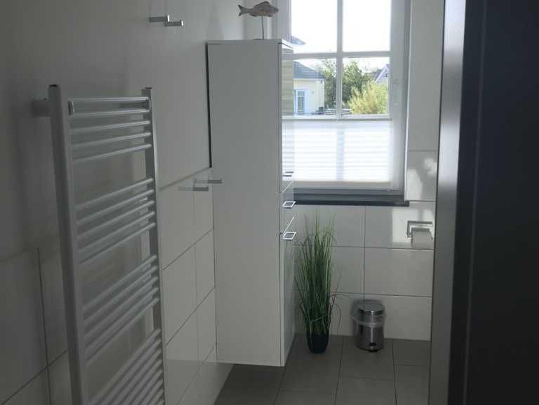 Das helle Badezimmer mit Fenster und bodengleicher Dusche verfügt über einen wandhängenden Badezimmerschrank, einen Waschtisch mit großem Spiegel, einen Kosmetikspiegel, einen Haartrockner und einen elektrisch beheizbaren Handtuchhalter.