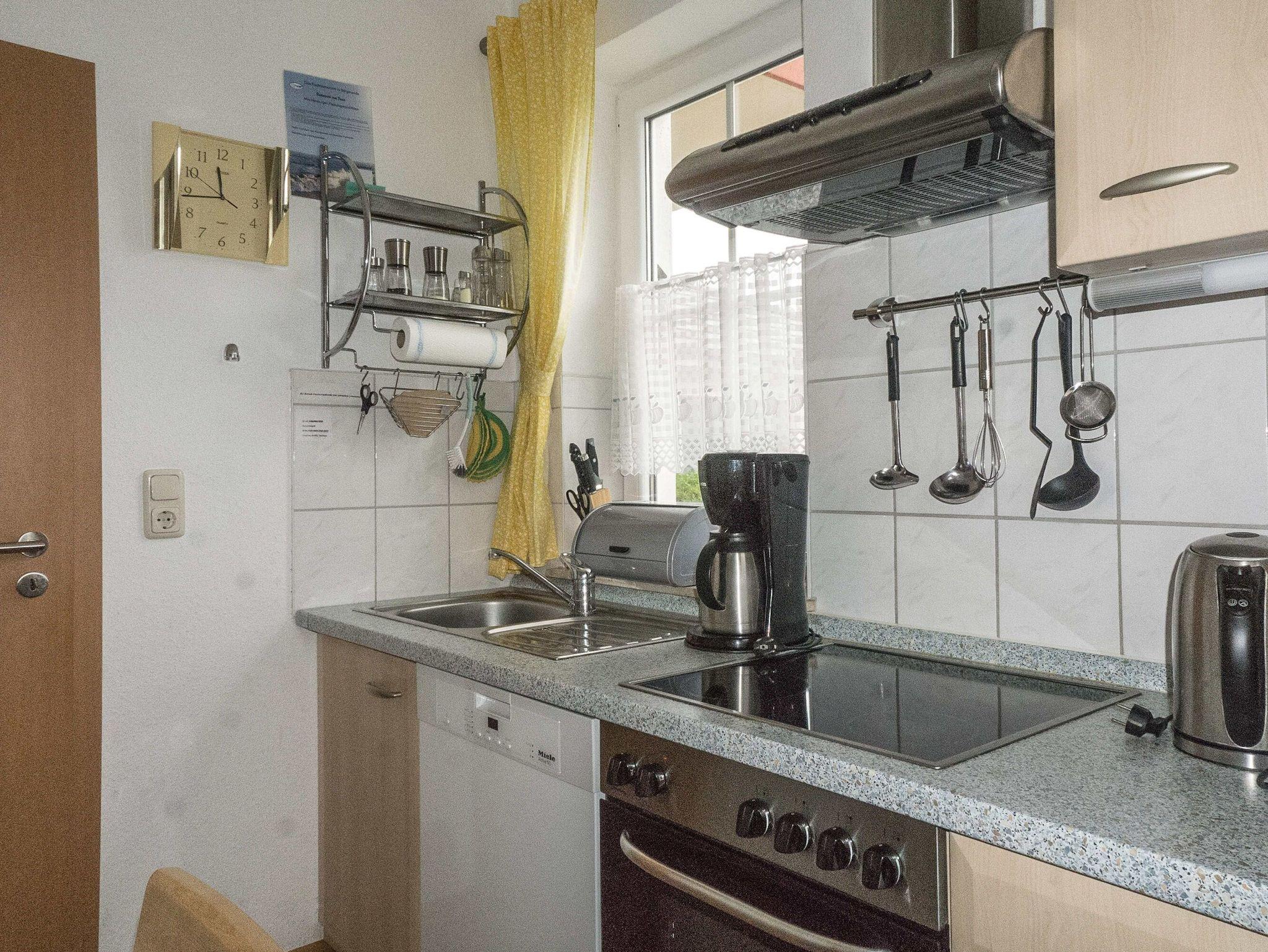 Die separate Küche ist hell und modern eingerichtet. Sie verfügt über ein Fenster, eine Küchenzeile, einen Kühlschrank mit Gefrierfach, einen Herd mit Cerankochfeld und Ablufthaube, einen Heißluftbackofen, eine Kaffeemaschine, eine Mikrowelle, einen Geschirrspüler und einen Esstisch. Geschirr, Töpfe, Pfannen und weitere Küchenutensilien sind selbstverständlich vorhanden.