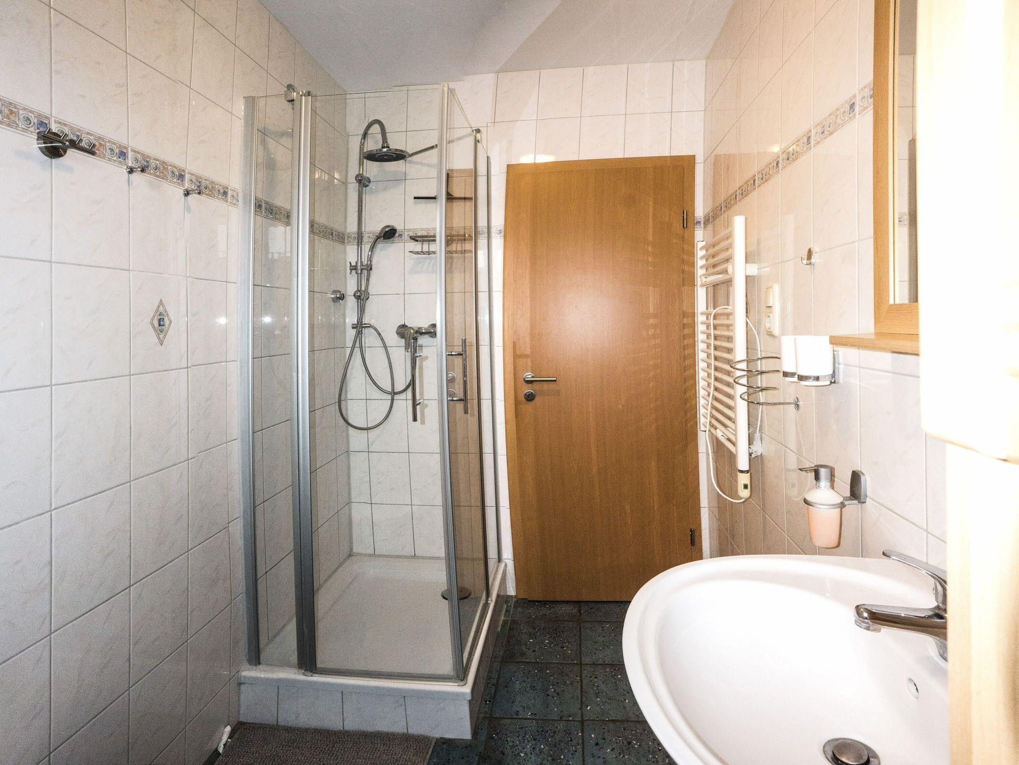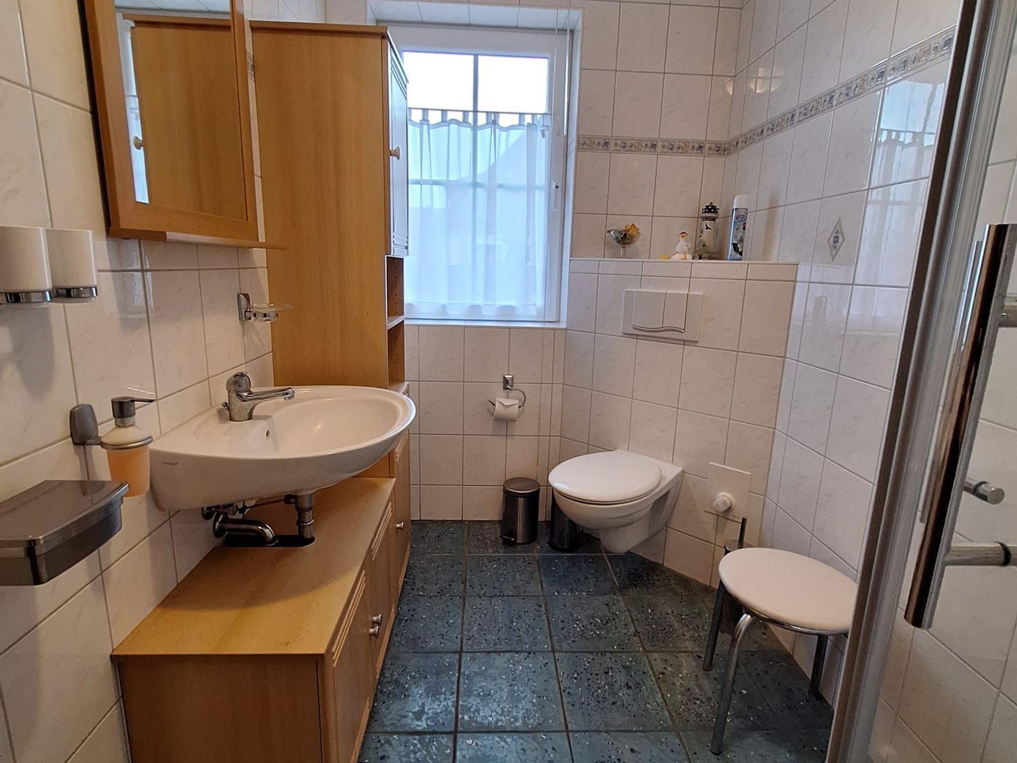 Das Badezimmer lässt keine Wünsche offen. Ausgestattet mit Fußbodenheizung, Dusche, WC, Waschbecken, Handtuchtrockner und viel Stauraum bietet es Komfort und Gemütlichkeit.