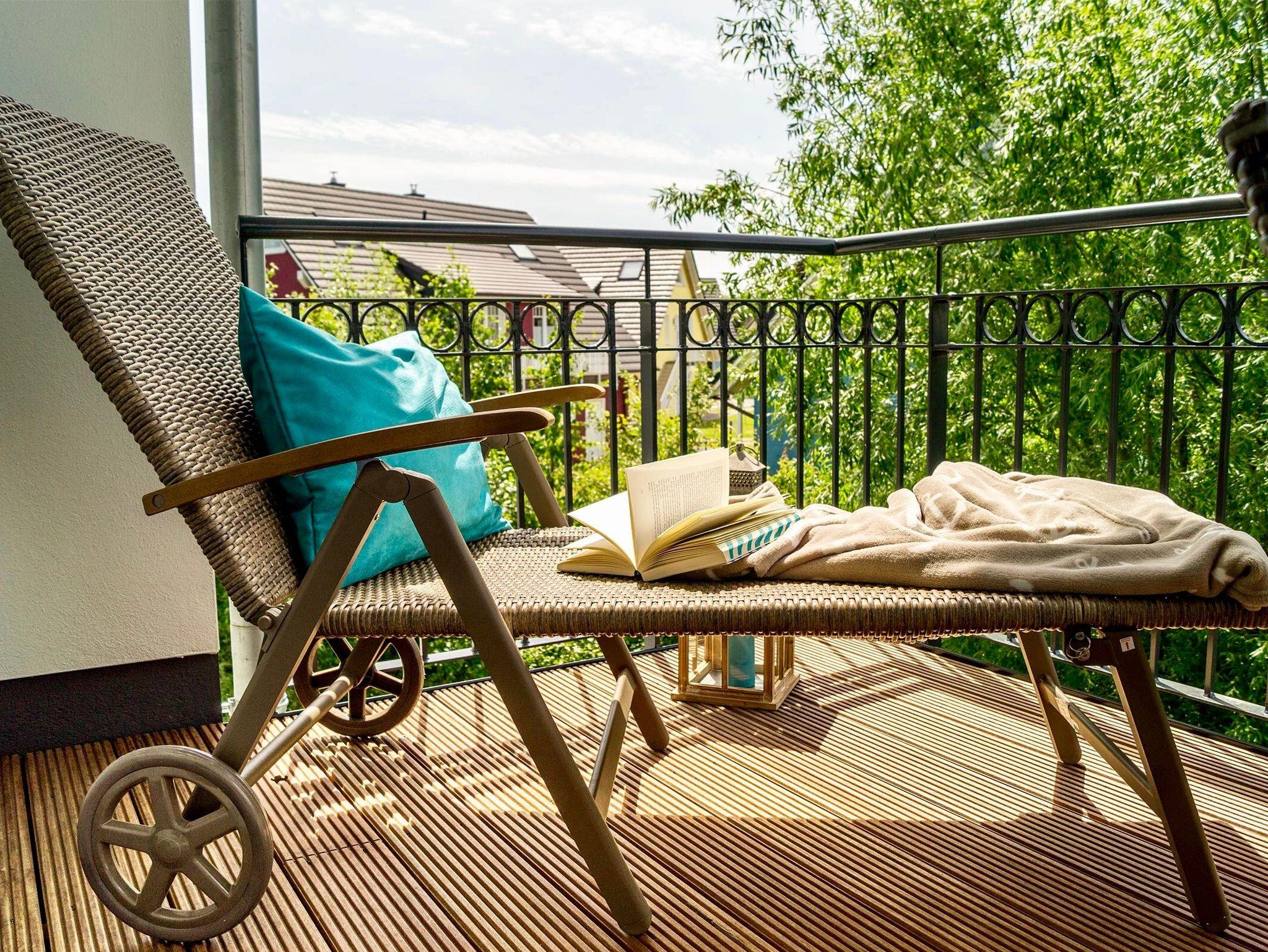 • Balkon mit Nachmittags- [&] Abendsonne, Blick ins Grüne [&] seitlichem Meerblick
