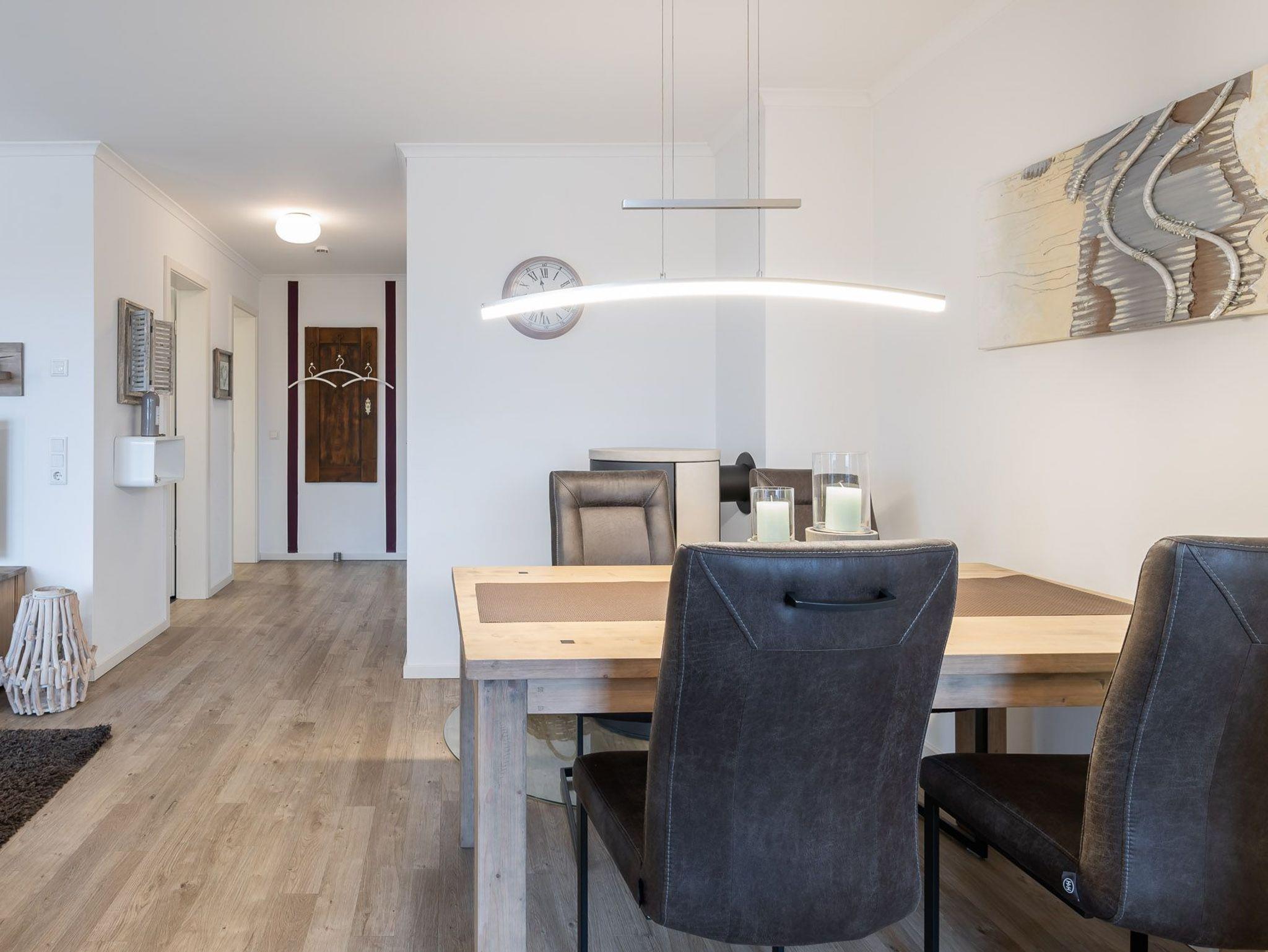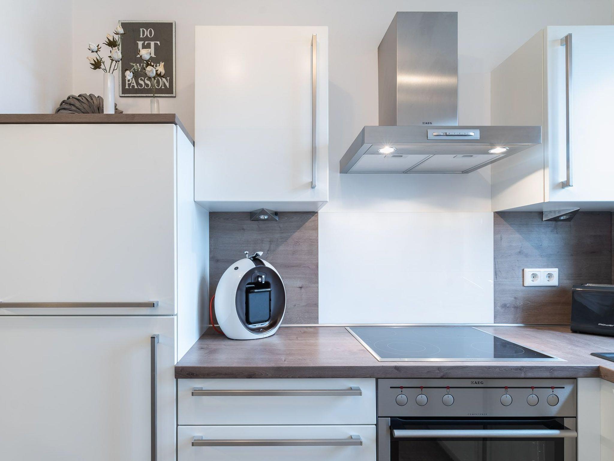 Im offenen Küchen- und Essbereich befindet sich die gut ausgestattete Einbauküche mit Cerankochfeld, Backofen, Mikrowelle, Kühlschrank inklusive Gefrierfach sowie ein schöner Holztisch mit vier Freischwingern in Lederoptik.
