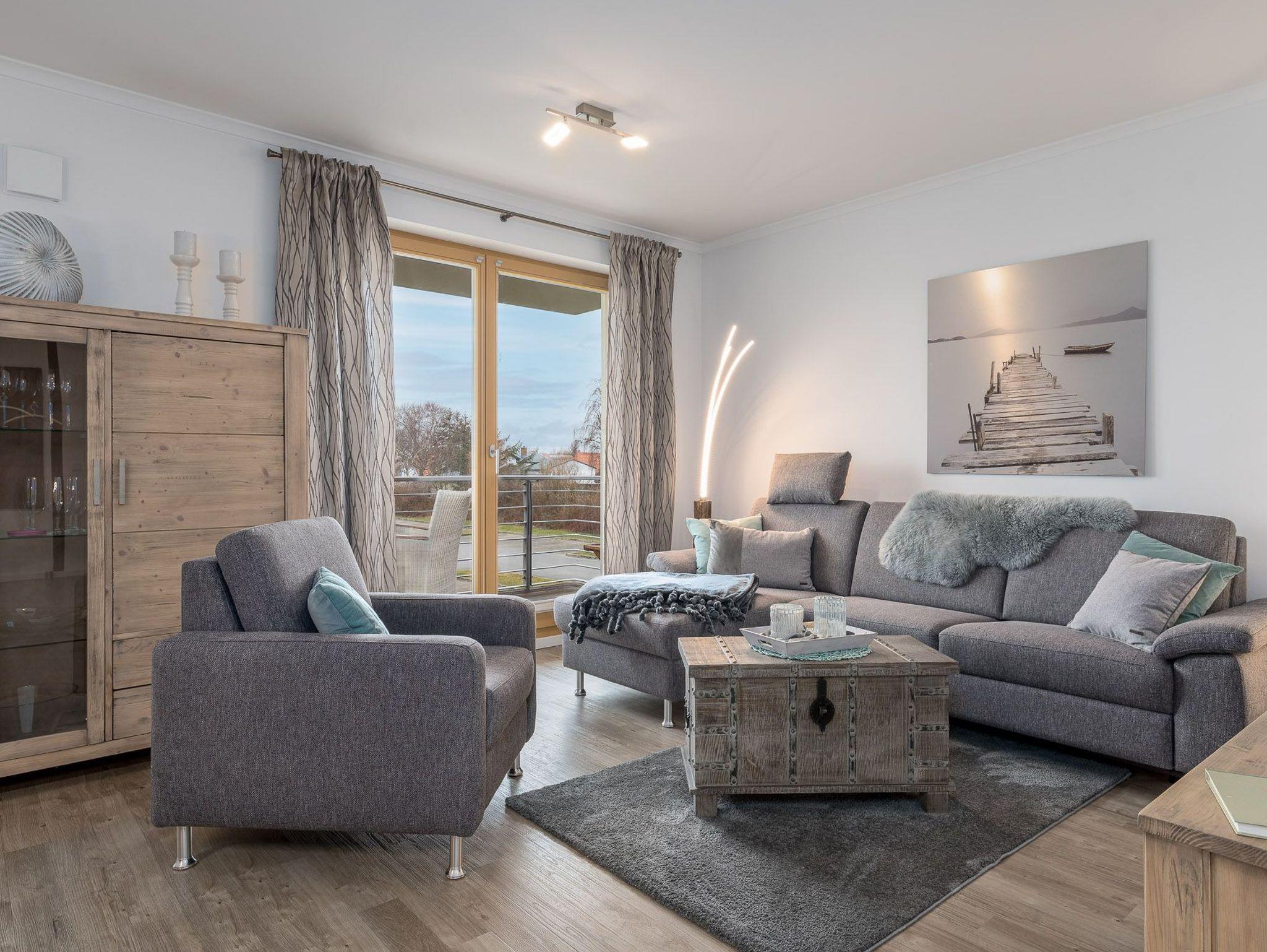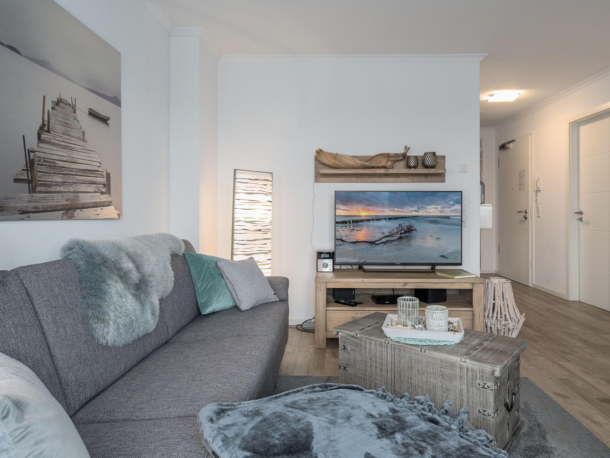 Die geschmackvoll eingerichtete Ferienwohnung befindet sich im ersten Obergeschoss der Villa Sanddorn und bietet Platz für drei Personen. Der Wohnraum verfügt über eine große, bequeme Eckcouch, einen Sessel, einen TV und eine Stereoanlage. An kühlen Tagen schafft der Holzkamin wohlige Wärme und ein reizvolles Flammenspiel (Brennholz ist selbst mitzubringen.)