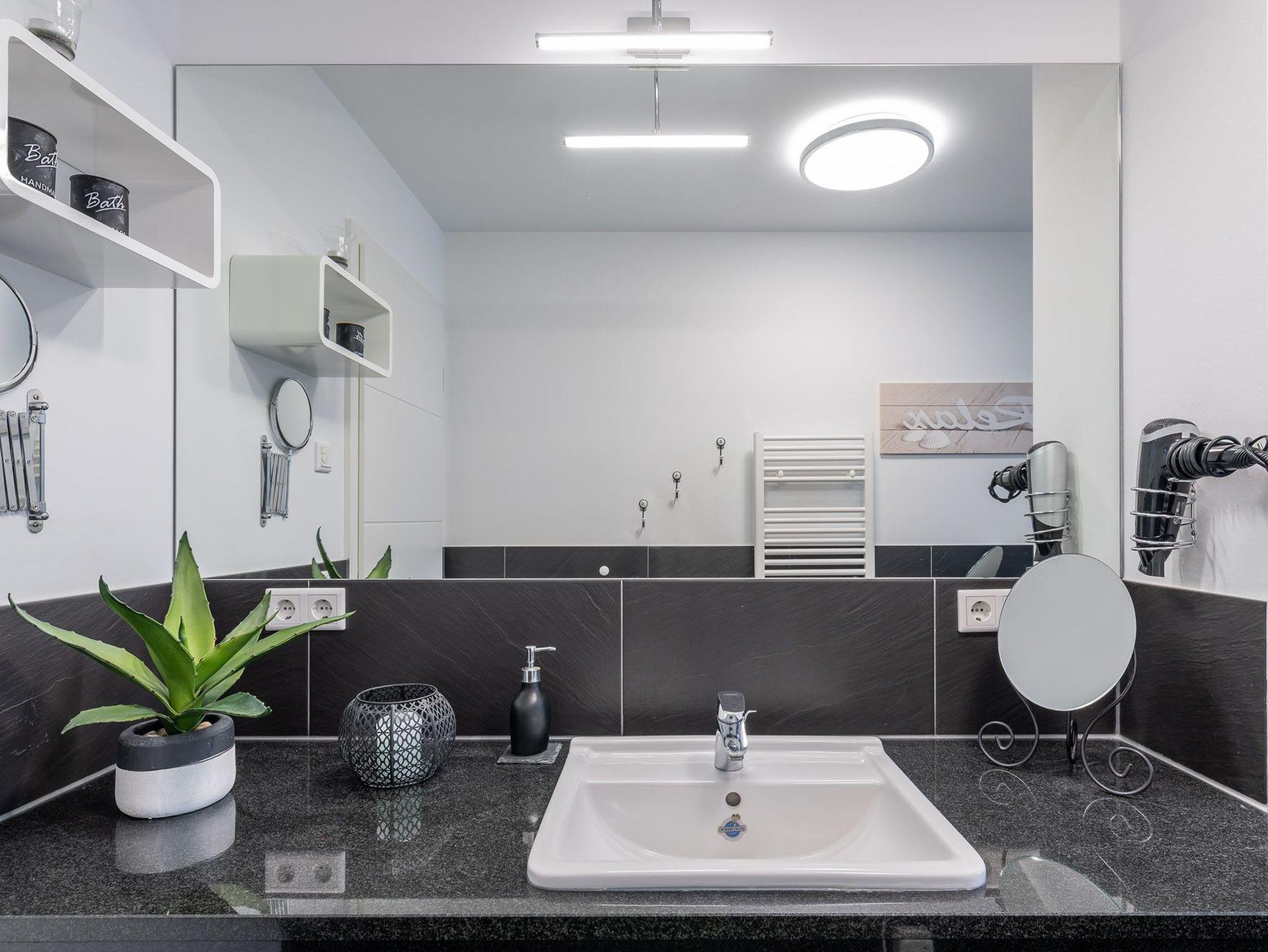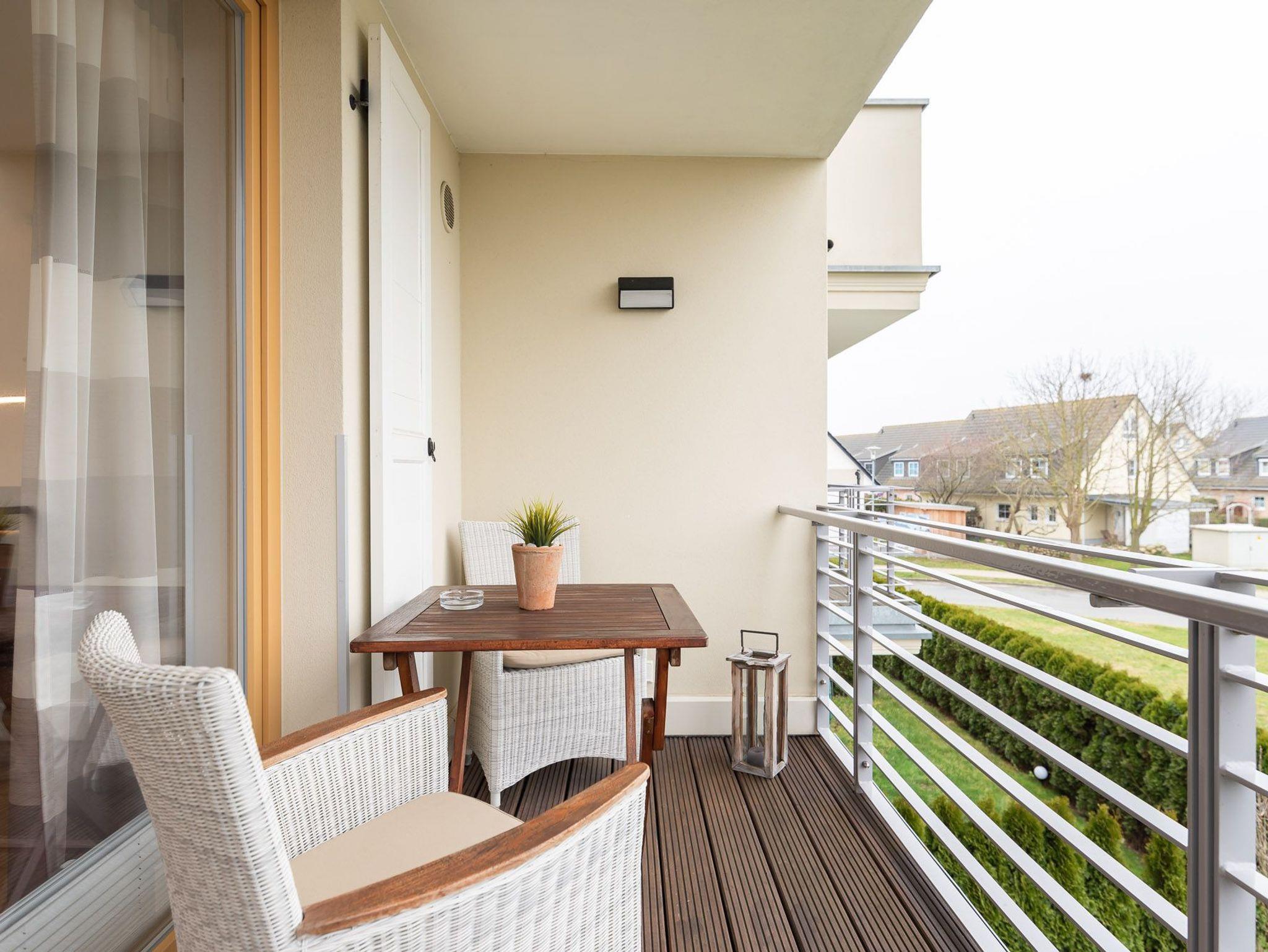 Auf dem großzügigen, nach Nordwesten ausgerichteten Balkon können Sie die Nachmittags- und Sonnenuntergangsstimmung (eingeschränkter Meerblick) genießen. Das elegante Bad besitzt eine bodengleiche Dusche, einen großzügigen Waschtisch sowie einen Spiegel, welcher über die Breite des Waschtischs reicht.