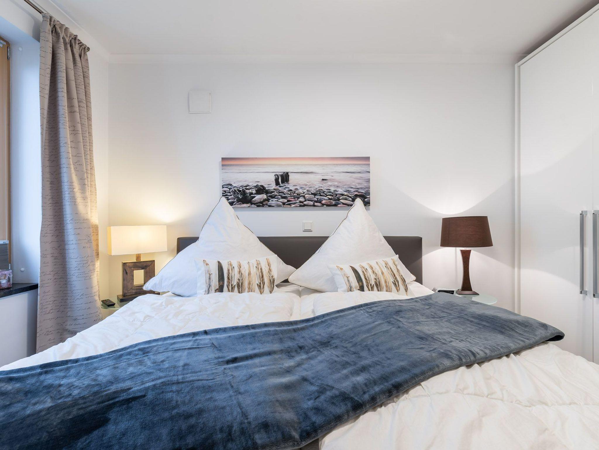 Im Schlafzimmer befinden sich ein großes Doppelbett (180 cm x 200 cm), ein geräumiger Kleiderschrank sowie ein an der Wand befestigter Fernseher mit DVD-Player.