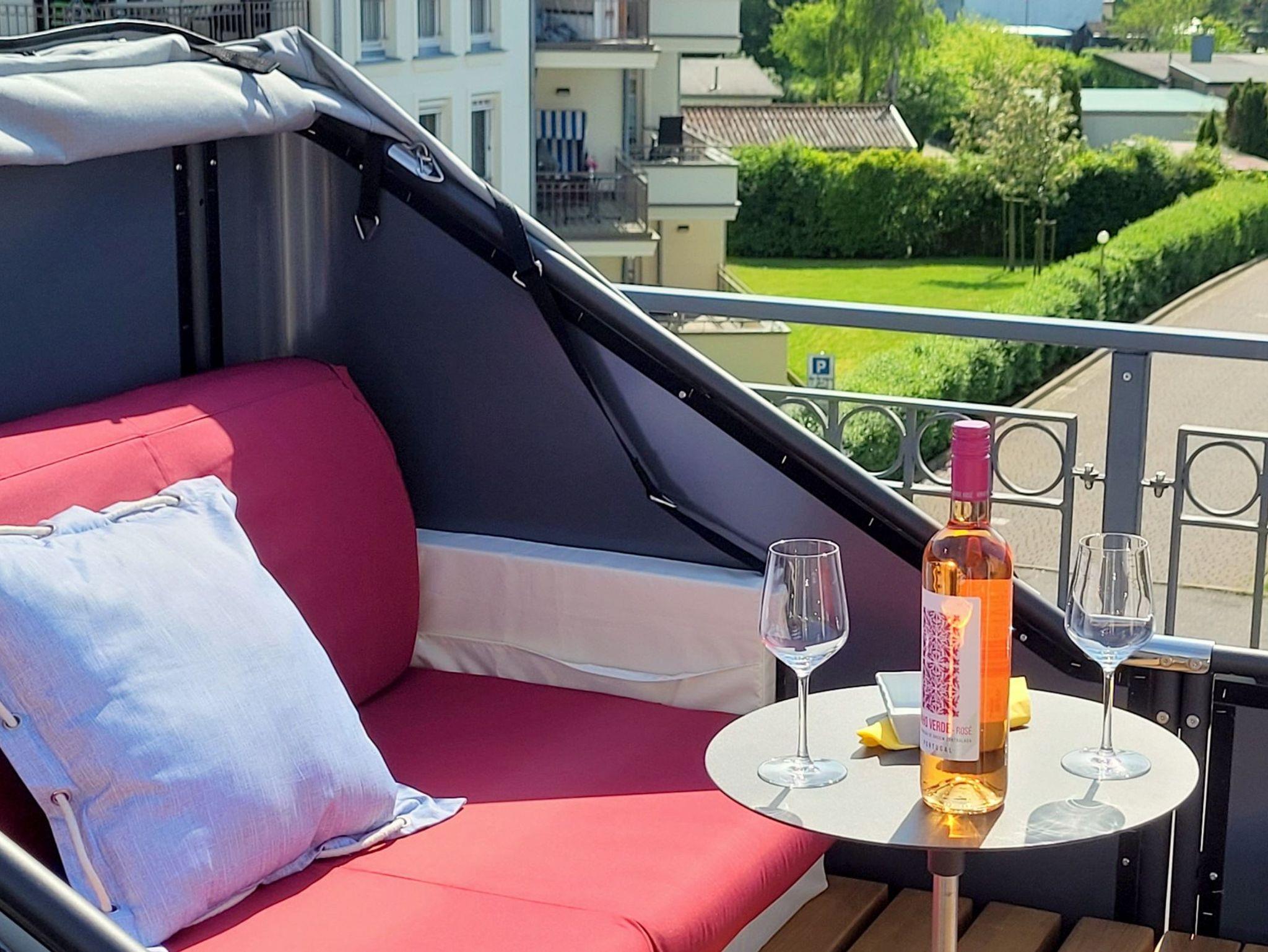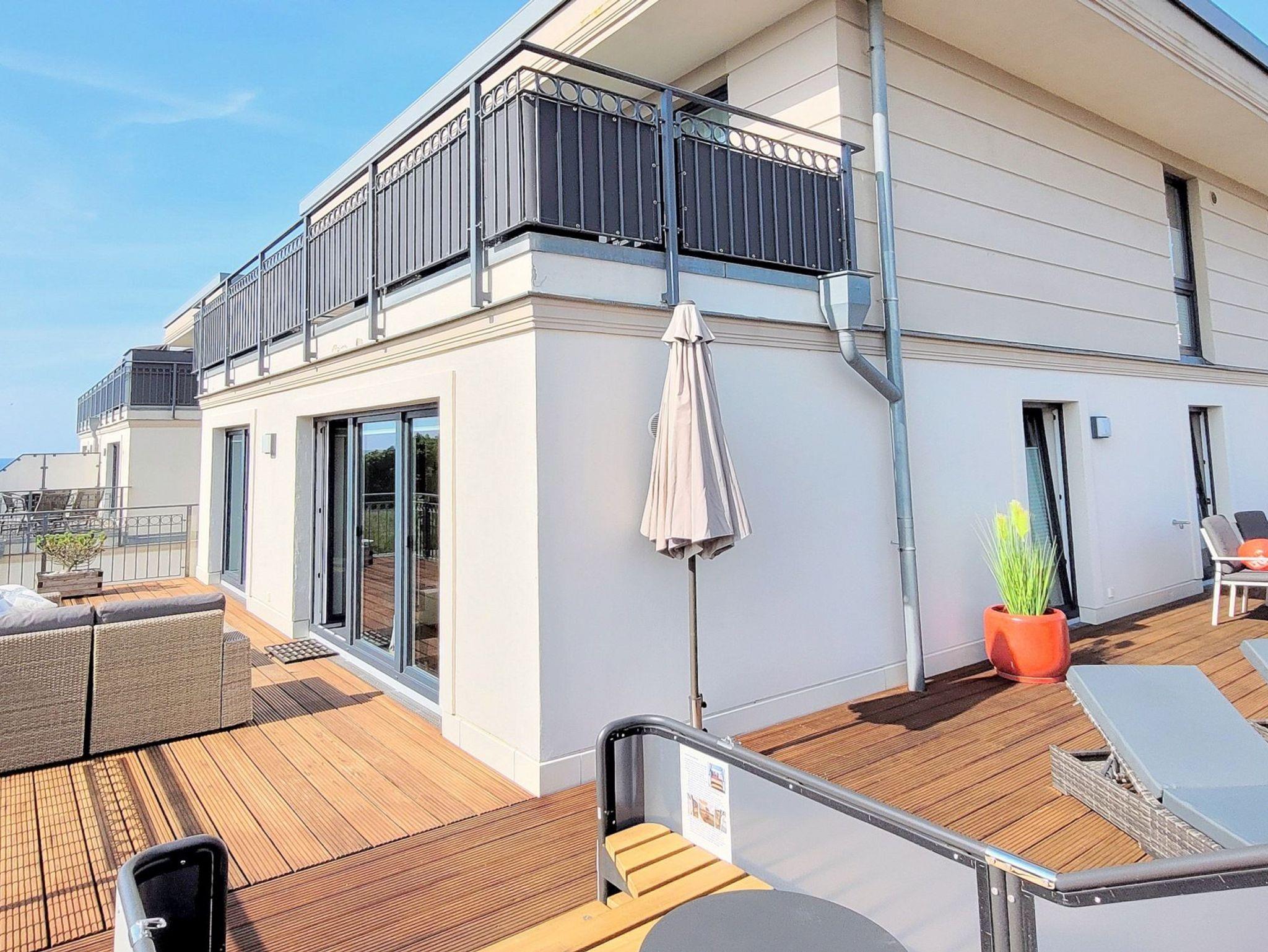 Strandnahe 3-Raum-Penthouse-Wohnung für vier Personen, Balkon (große Dachterrasse), Strandkorb und seitlichem Meerblick im 2. OG.
