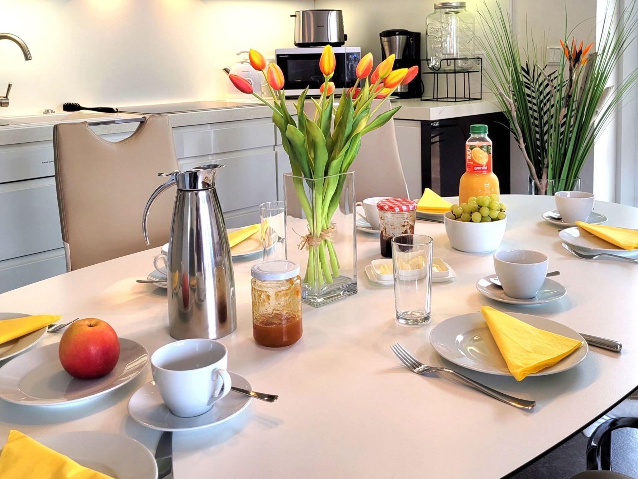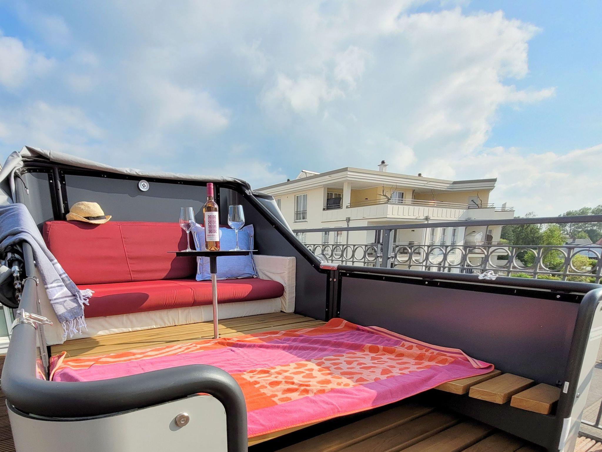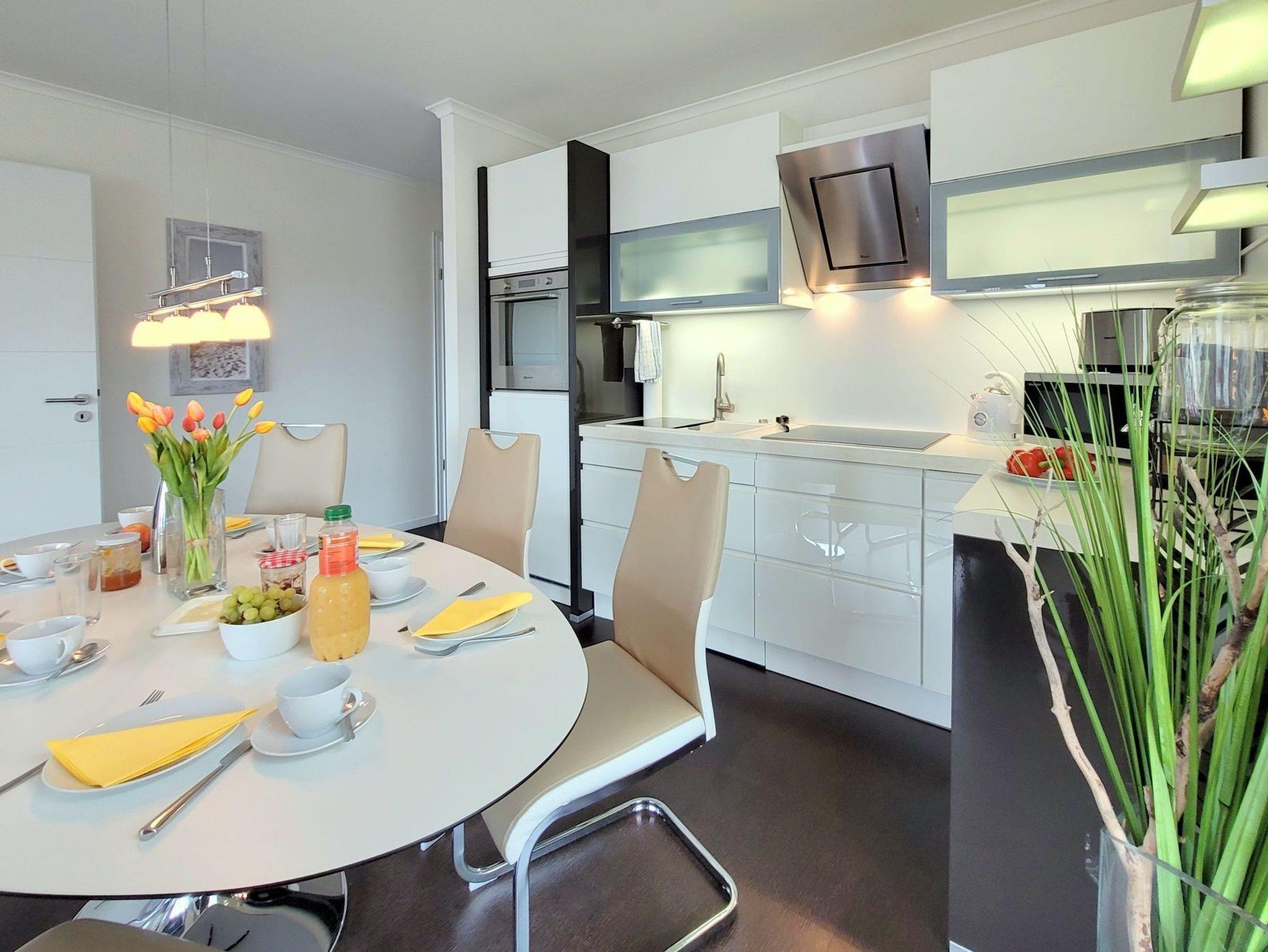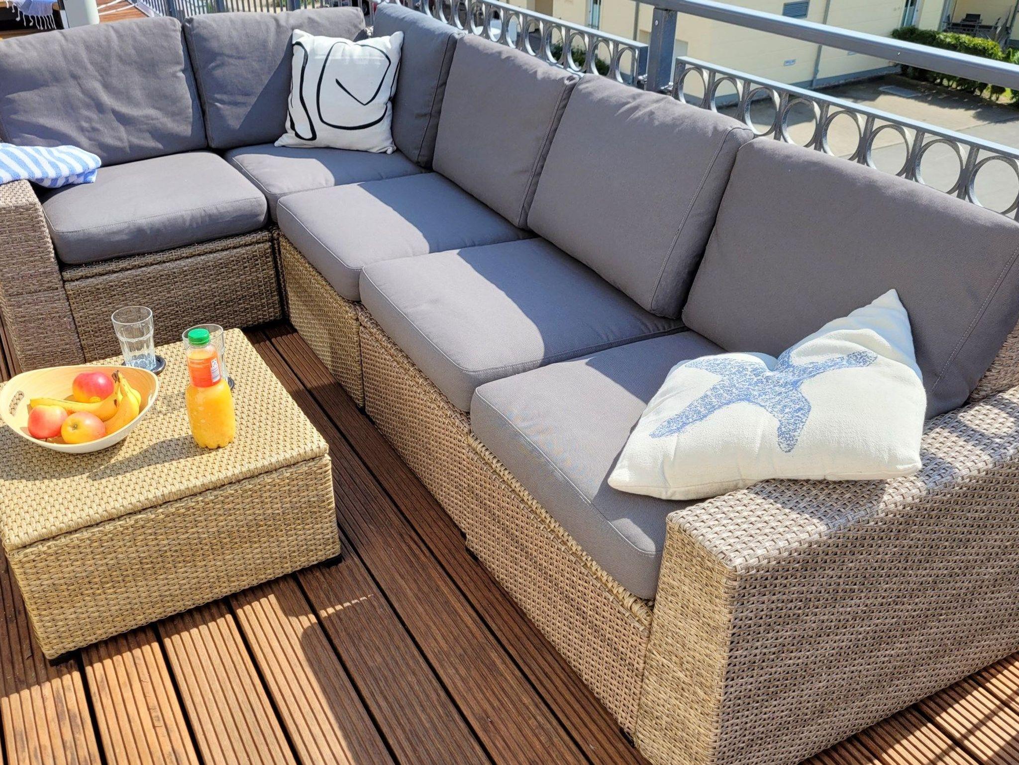Der moderne, lichtdurchflutete Wohnraum empfängt Sie mit einer gemütlichen Leder-Ecksitzgruppe, einem Couchtisch sowie einem Flatscreen-TV mit Blu-ray- / DVD-Player und einer HiFi-Anlage (mit kabelloser Wiedergabe vom eigenen Smartphone/Tablet). Ein großer Tulip-Esstisch mit Stühlen lädt zu gemeinsamen Mahlzeiten ein. Die hochwertig eingerichtete Einbauküche ist voll ausgestattet mit Geschirrspüler, Kühlschrank, inklusive Gefrierfach, Backofen, Mikrowelle, Induktions-Kochfeld, Dunstabzugshaube, Kaffeemaschine, Wasserkocher und Toaster. Zwei modern eingerichtete Schlafzimmer empfangen Sie jeweils mit bequemem Doppelbett (hochwertige Kaltschaum-Matratzen/ getrennt 180 x 200 cm. Die Wohnung ist mit je 4 Sets an Standardbettdecken 135 x 200 cm und Komfort Bettdecken 155 x 220 cm ausgestattet. (Bitte beachten Sie: Für die Komfort Bettdecken kann keine Bettwäsche gestellt werden.) Ein raumhoher Kleiderschrank bietet ausreichend Platz für Ihr Gepäck. Eines der Schlafzimmer verfügt über einen eigenen Zugang zur Terrasse. Das andere ist mit einem Sound-System sowie einem angrenzenden Wannenbad ausgestattet. In der Unterkunft befindet sich zudem ein zweites Bad mit bodengleicher Walk-In Regendusche, großer Spiegelfront, Föhn und einem Fenster, durch das Sie die Morgensonne begrüßt. Das einzigartige Penthouse-Highlight ist die 70 qm große Dachterrasse (Balkon) in Süd-West-Lage. Dort verwöhnt Sie die Sonnen den ganzen Tag. Neben einer Esstischgruppe und einem Sonnenschirm stehen Ihnen von März bis Oktober außerdem eine Chillout-Lounge und exklusiv der vermutlich größte Strandkorb zwischen Wismar und Warnemünde zur Verfügung. Von hier genießen Sie einen wunderschönen Blick auf die Ostsee. Bei gutem Wetter kann hier sogar unter freiem Himmel übernachtet werden! Bitte den Schlafsack und ein zusätzliches Laken (140 x 200 cm) nicht vergessen. Die Wohnung ist mit raumhohen Fenstern und Blindouts ausgestattet. Die Fußbodenheizung sorgt für wohlige Wärme in allen Räumen. Ein separater Abstellraum bietet Stauraum für Ihre Urlaubskleidung. Zu Ihrer Ferienwohnung gehört ein kostenfreier Tiefgaragenstellplatz. Bitte beachten Sie die Durchfahrtshöhe von max. 1,90 m. Der im Gebäude installierte Aufzug erleichtert den Transport der mitgebrachten Koffer. Über den Innenhof der Villa erreichen Sie den abschließbaren Fahrradraum sowie den angrenzenden Waschraum. Eine Waschmaschine und ein Trockner stehen zu Ihrer Verfügung (gegen Gebühr / 1,00 € Münzen). Im Erdgeschoss finden Sie eine Eisdiele und ein Restaurant. In der Nähe außerdem ein „Kaufmannsladen“ mit Backshop, diversen Strand- und Souvenirartikeln sowie einen Fahrradverleih. Der beliebte Ostsee-Rad-Wanderweg beginnt vor der Haustür. Bei herrlichen Fahrradtouren erreichen Sie die bekannten Seebäder Heiligendamm (3 km), Kühlungsborn (8 km), Nienhagen (4 km) und Warnemünde (13 km). Hier noch einige Hinweise: Es handelt sich um eine Nichtraucherwohnung. Es sind keine Haustiere erlaubt. Ab der dritten und vierten Person wird ein Aufpreis in Höhe von 10,00 €/ÜN pro Person berechnet. Wäscheset, Kinderreisebett und Kinderhochstuhl können kostenpflichtig zugebucht werden. Das kostenfreie WLAN in der Unterkunft ist ausschließlich für die Verwendung von Social Media und den Austausch von Bildern mit Familie und Freunden gedacht. Die Nutzung zum Streamen von Filmen ist nicht vorgesehen. Sichern Sie sich einen der begehrten Strandkörbe nur ein paar Meter entfernt von den rauschenden Wellen der Ostsee (Anfang Mai - Ende August) und buchen Sie jetzt zu besonderen Konditionen (12,00 € pro Tag oder 75,00 € pro Woche).