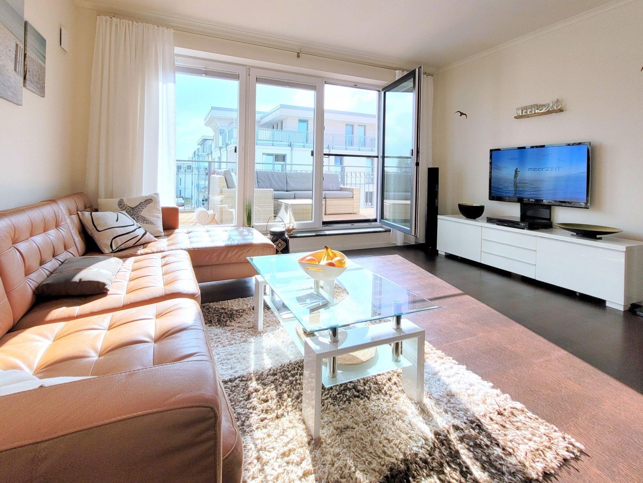 Der moderne, lichtdurchflutete Wohnraum empfängt Sie mit einer gemütlichen Leder-Ecksitzgruppe, einem Couchtisch sowie einem Flatscreen-TV mit Blu-ray- / DVD-Player und einer HiFi-Anlage (mit kabelloser Wiedergabe vom eigenen Smartphone/Tablet). Ein großer Tulip-Esstisch mit Stühlen lädt zu gemeinsamen Mahlzeiten ein. Die hochwertig eingerichtete Einbauküche ist voll ausgestattet mit Geschirrspüler, Kühlschrank, inklusive Gefrierfach, Backofen, Mikrowelle, Induktions-Kochfeld, Dunstabzugshaube, Kaffeemaschine, Wasserkocher und Toaster. Zwei modern eingerichtete Schlafzimmer empfangen Sie jeweils mit bequemem Doppelbett (hochwertige Kaltschaum-Matratzen/ getrennt 180 x 200 cm. Die Wohnung ist mit je 4 Sets an Standardbettdecken 135 x 200 cm und Komfort Bettdecken 155 x 220 cm ausgestattet. (Bitte beachten Sie: Für die Komfort Bettdecken kann keine Bettwäsche gestellt werden.) Ein raumhoher Kleiderschrank bietet ausreichend Platz für Ihr Gepäck. Eines der Schlafzimmer verfügt über einen eigenen Zugang zur Terrasse. Das andere ist mit einem Sound-System sowie einem angrenzenden Wannenbad ausgestattet. In der Unterkunft befindet sich zudem ein zweites Bad mit bodengleicher Walk-In Regendusche, großer Spiegelfront, Föhn und einem Fenster, durch das Sie die Morgensonne begrüßt. Das einzigartige Penthouse-Highlight ist die 70 qm große Dachterrasse (Balkon) in Süd-West-Lage. Dort verwöhnt Sie die Sonnen den ganzen Tag. Neben einer Esstischgruppe und einem Sonnenschirm stehen Ihnen von März bis Oktober außerdem eine Chillout-Lounge und exklusiv der vermutlich größte Strandkorb zwischen Wismar und Warnemünde zur Verfügung. Von hier genießen Sie einen wunderschönen Blick auf die Ostsee. Bei gutem Wetter kann hier sogar unter freiem Himmel übernachtet werden! Bitte den Schlafsack und ein zusätzliches Laken (140 x 200 cm) nicht vergessen. Die Wohnung ist mit raumhohen Fenstern und Blindouts ausgestattet. Die Fußbodenheizung sorgt für wohlige Wärme in allen Räumen. Ein separater Abstellraum bietet Stauraum für Ihre Urlaubskleidung. Zu Ihrer Ferienwohnung gehört ein kostenfreier Tiefgaragenstellplatz. Bitte beachten Sie die Durchfahrtshöhe von max. 1,90 m. Der im Gebäude installierte Aufzug erleichtert den Transport der mitgebrachten Koffer. Über den Innenhof der Villa erreichen Sie den abschließbaren Fahrradraum sowie den angrenzenden Waschraum. Eine Waschmaschine und ein Trockner stehen zu Ihrer Verfügung (gegen Gebühr / 1,00 Euro Münzen). Im Erdgeschoss finden Sie eine Eisdiele und ein Restaurant. In der Nähe außerdem ein ?Kaufmannsladen? mit Backshop, diversen Strand- und Souvenirartikeln sowie einen Fahrradverleih. Der beliebte Ostsee-Rad-Wanderweg beginnt vor der Haustür. Bei herrlichen Fahrradtouren erreichen Sie die bekannten Seebäder Heiligendamm (3 km), Kühlungsborn (8 km), Nienhagen (4 km) und Warnemünde (13 km). Hier noch einige Hinweise: Es handelt sich um eine Nichtraucherwohnung. Es sind keine Haustiere erlaubt. Ab der dritten und vierten Person wird ein Aufpreis in Höhe von 10,00 Euro/ÜN pro Person berechnet. Wäscheset, Kinderreisebett und Kinderhochstuhl können kostenpflichtig zugebucht werden. Das kostenfreie WLAN in der Unterkunft ist ausschließlich für die Verwendung von Social Media und den Austausch von Bildern mit Familie und Freunden gedacht. Die Nutzung zum Streamen von Filmen ist nicht vorgesehen. Sichern Sie sich einen der begehrten Strandkörbe nur ein paar Meter entfernt von den rauschenden Wellen der Ostsee (Anfang Mai - Ende August) und buchen Sie jetzt zu besonderen Konditionen (12,00 Euro pro Tag oder 75,00 Euro pro Woche).