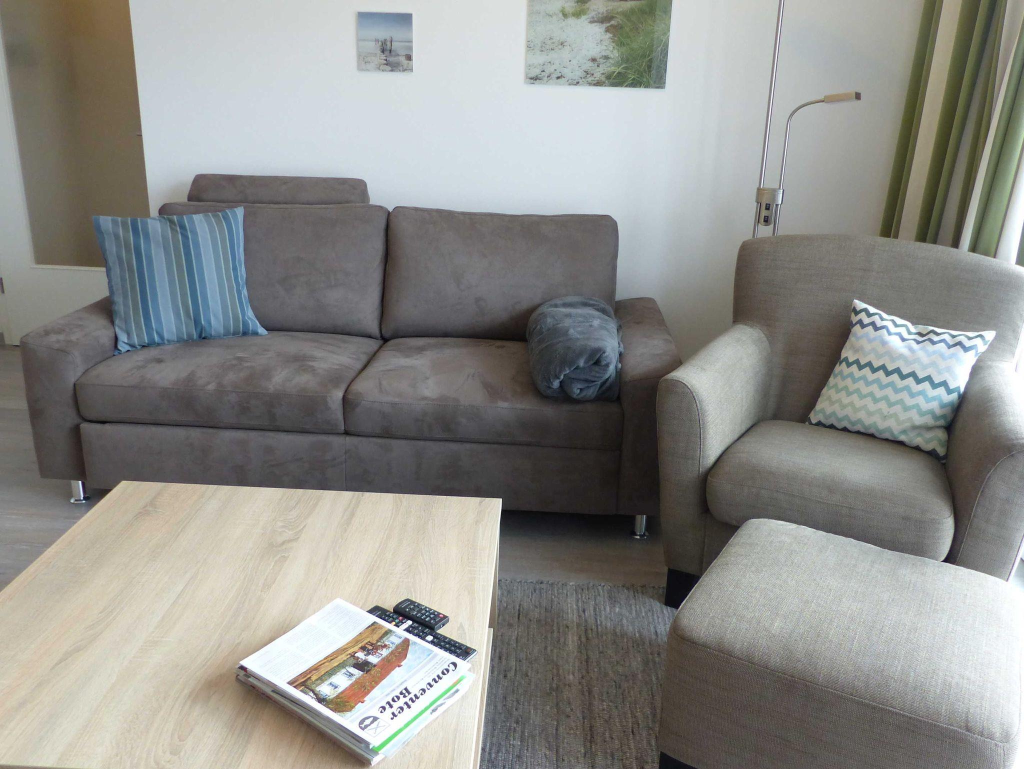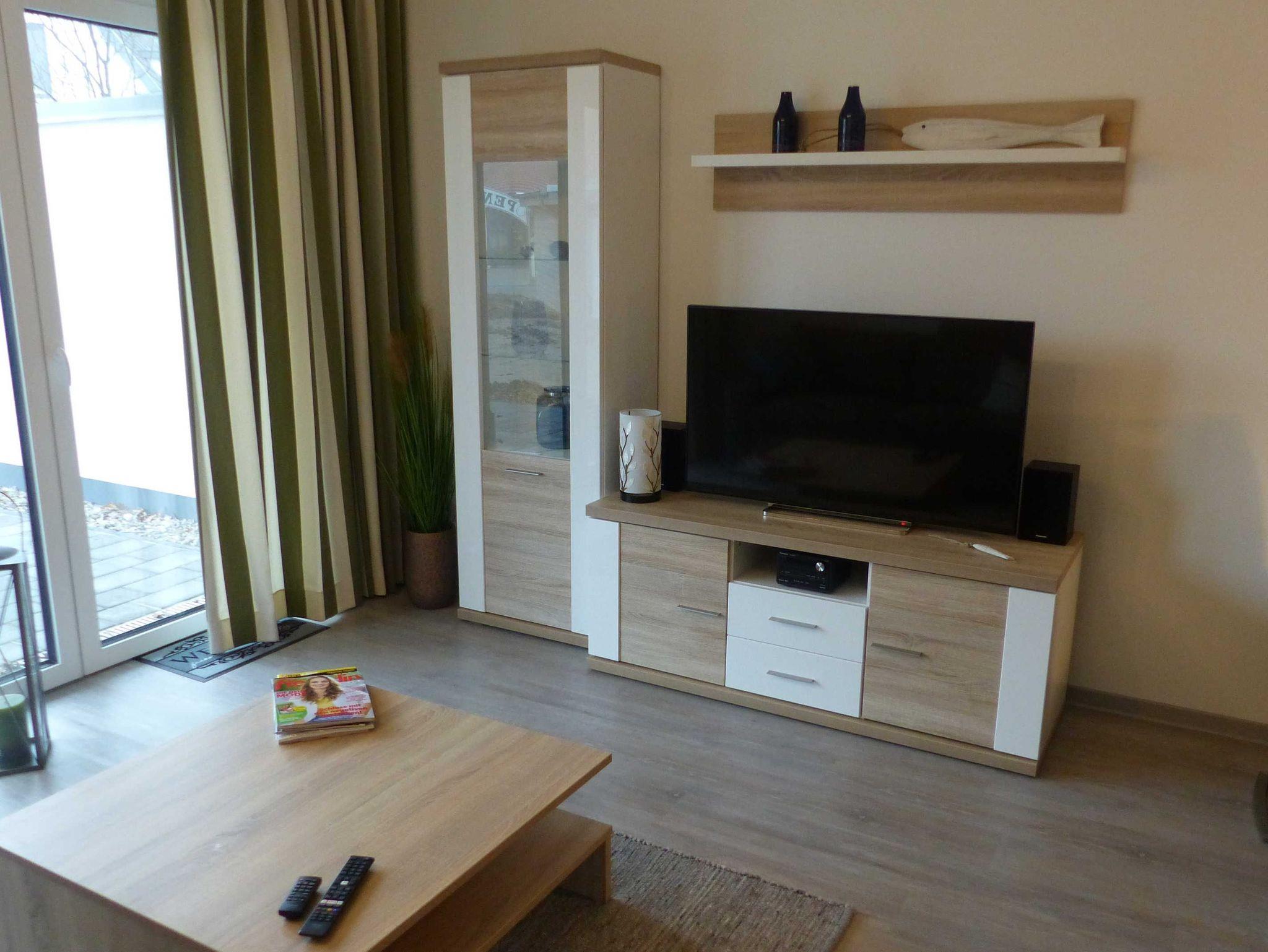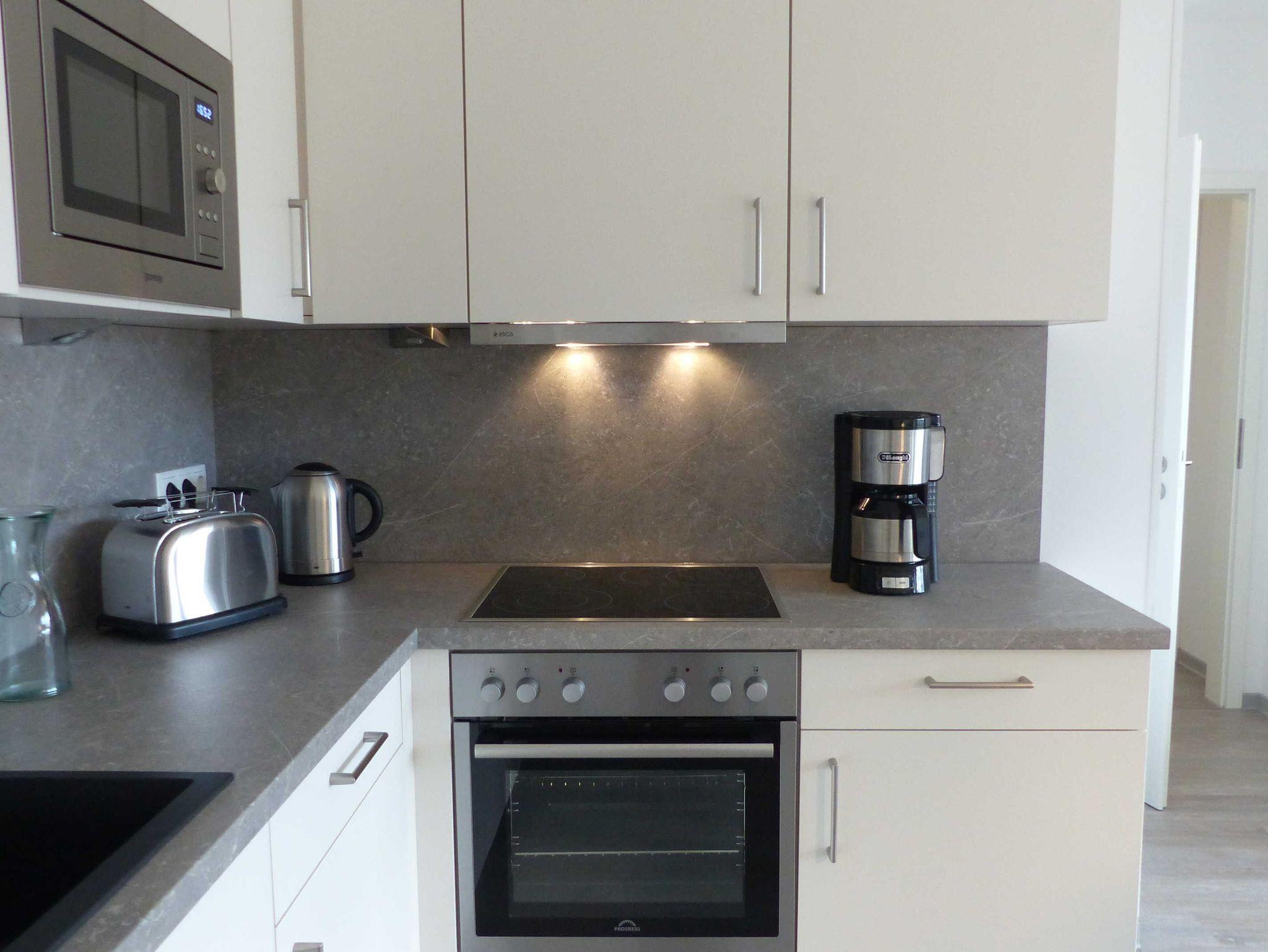 Die hochwertige Einbauküche verfügt neben einem Herd mit Ceranfeld und Backofen, einen Kühlschrank mit Gefrierfach, einen Geschirrspüler, eine Mikrowelle, eine Kaffeemaschine, einen Wasserkocher, einen Eierkocher, einen Mixer und einen Toaster. Im Essbereich befindet sich ein großer Esstisch mit sechs Stühlen. Ein Kinderhochstuhl ist ebenfalls vorhanden. Die Wohnung verfügt über Fußbodenheizung und elektrische Rolläden. Der gemütliche offene Wohnbereich mit großem TV-Flachbildschirm und Bluetooth-Musikanlage (Radio, CD usw.) lädt zum Entspannen und Durchatmen ein. Von hier gelangen Sie auf die nach Süd-Westen ausgerichtete und mit Gartenmöbeln, Sonnenliegen und Sonnenschirm ausgestattete Terrasse mit angrenzendem Gemeinschaftsgarten.
